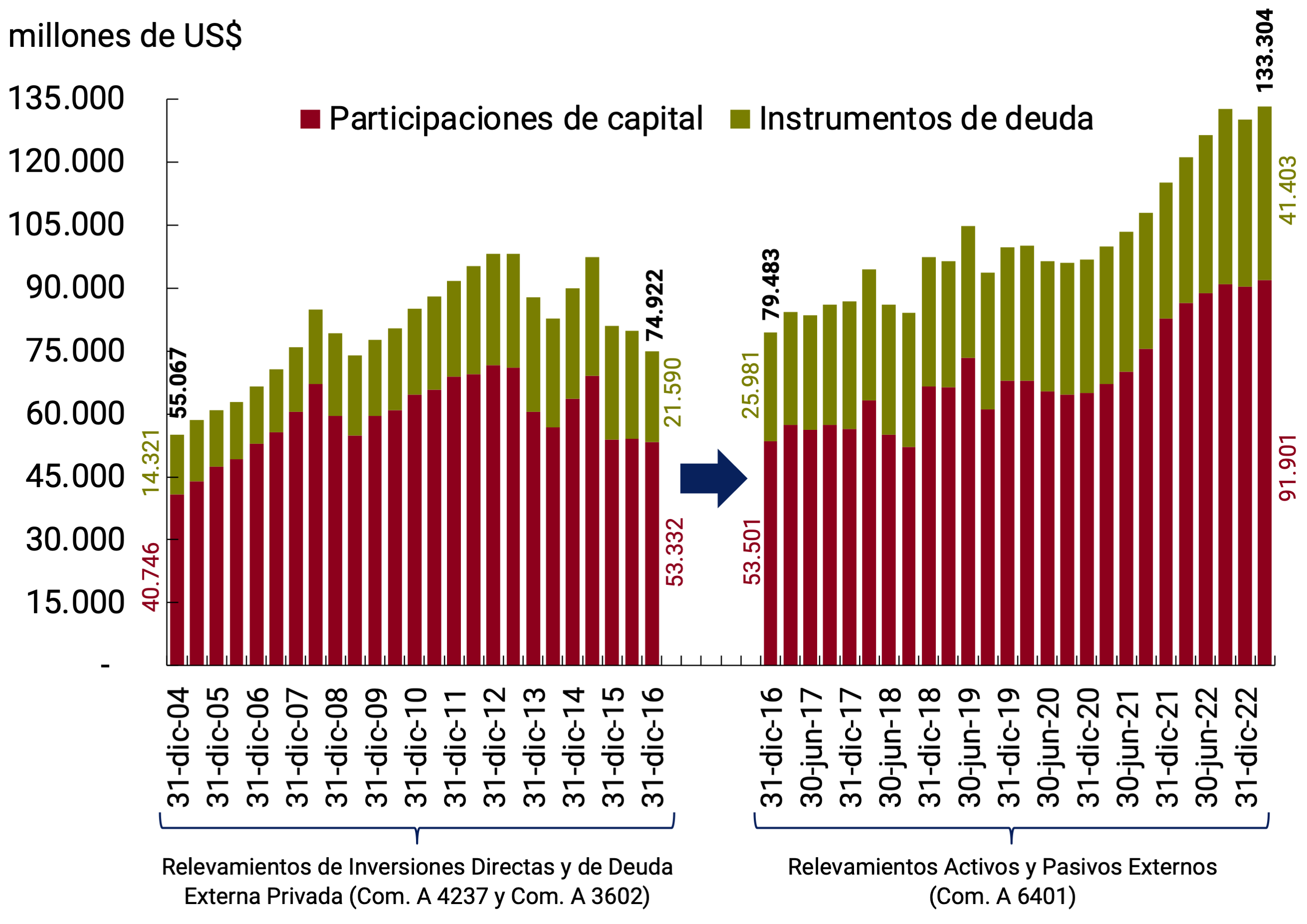 36 Hasta diciembre de 2016, las series se presentaban con un informe de periodicidad anual y los datos subyacentes a las estimaciones se elaboraban en base al Relevamiento de Inversiones Directas (Comunicación “A” 4237 y complementarias) y del Relevamiento de Títulos de Deuda y Otros Pasivos Externos (Comunicación “A” 3602 y complementarias), los que fueron sustituidos por el Relevamiento de Activos y Pasivos Externos (RAyPE) a partir de 2017.