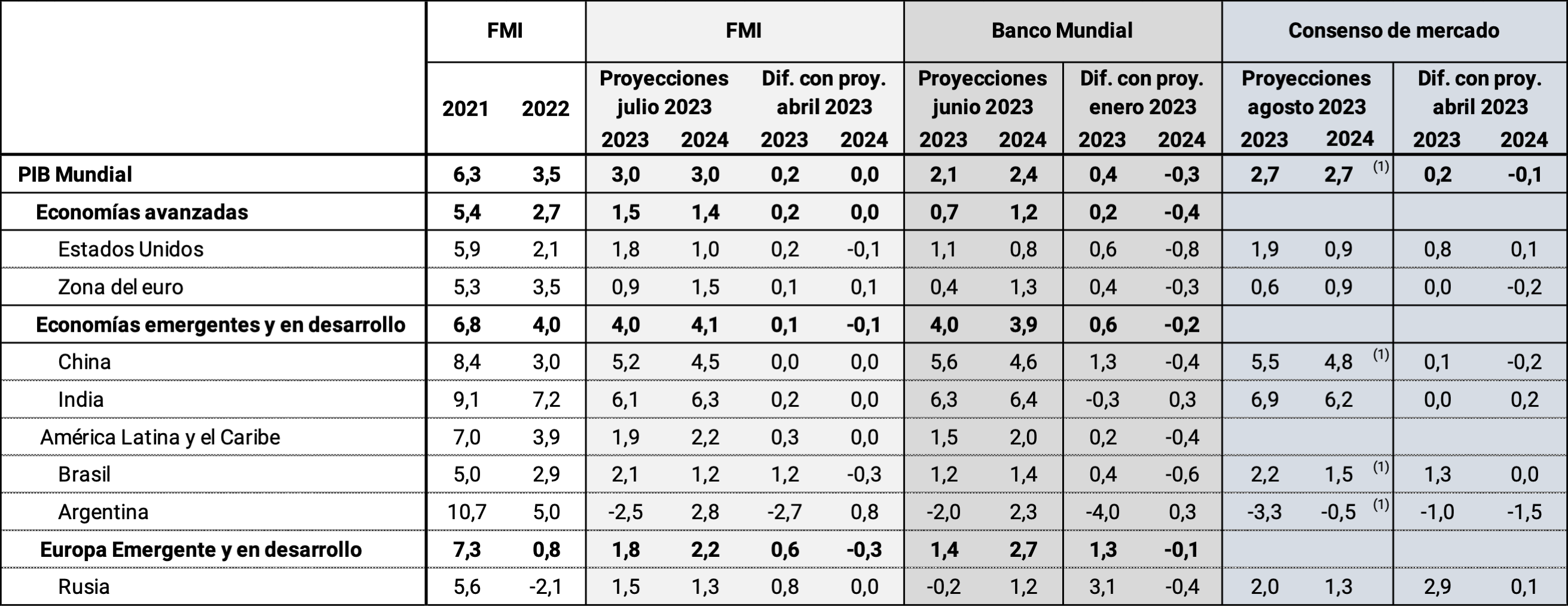 Fuente: FMI, Banco Mundial y Reuters (consenso de mercado). (1) Pronóstico de julio de 2023.