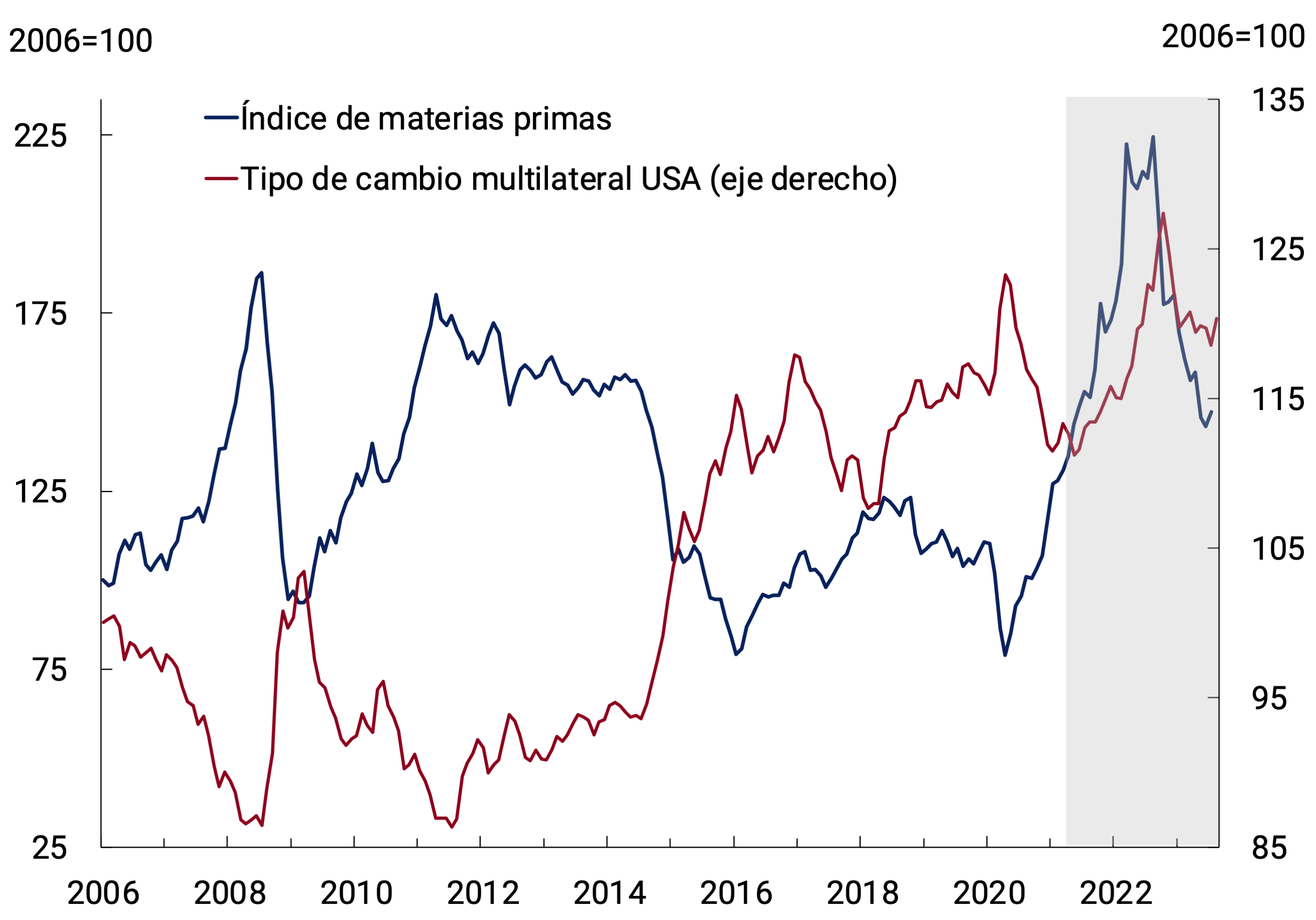 Gráfico 2.10 | Tipo de cambio multilateral de Estados Unidos e índice de materias primas