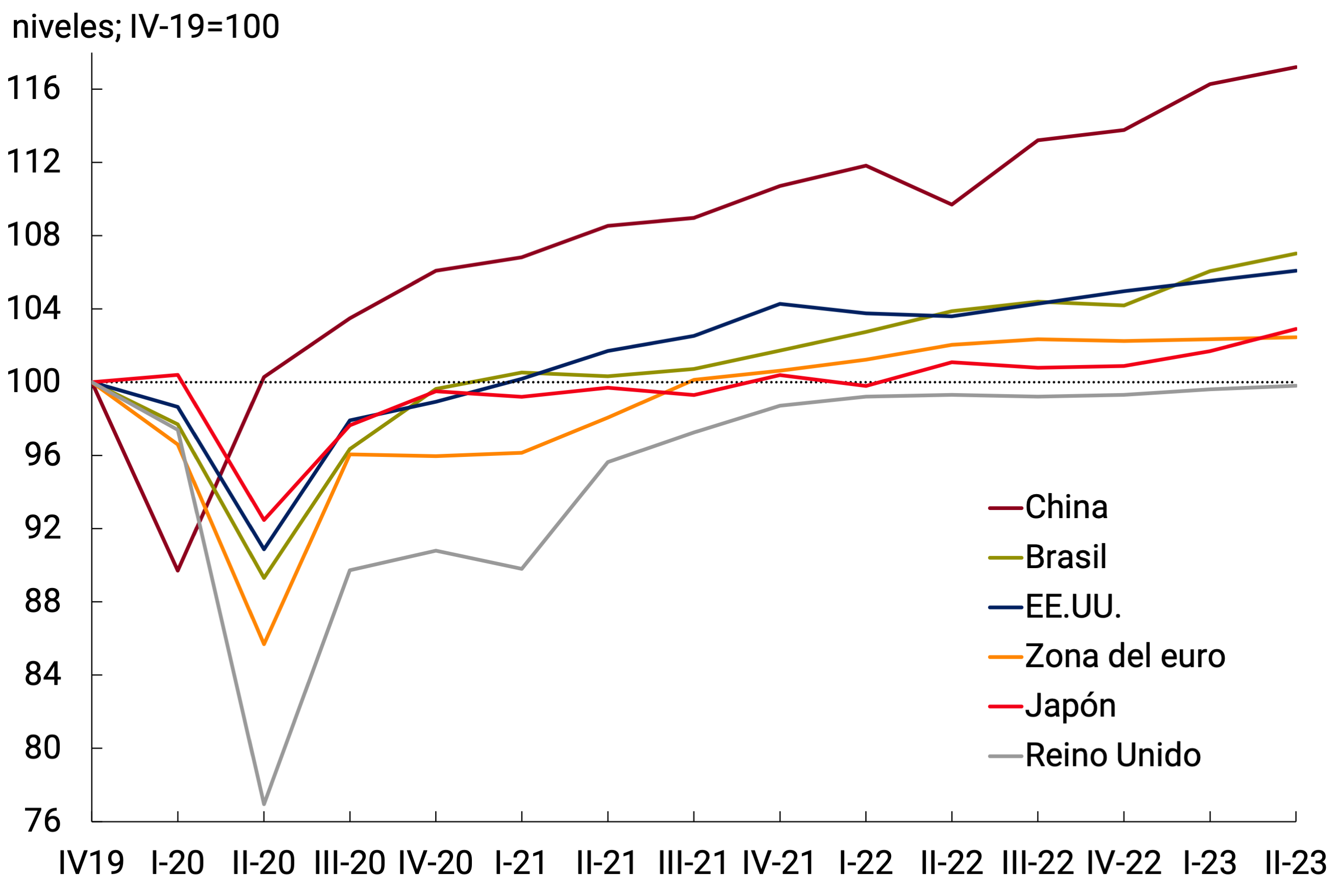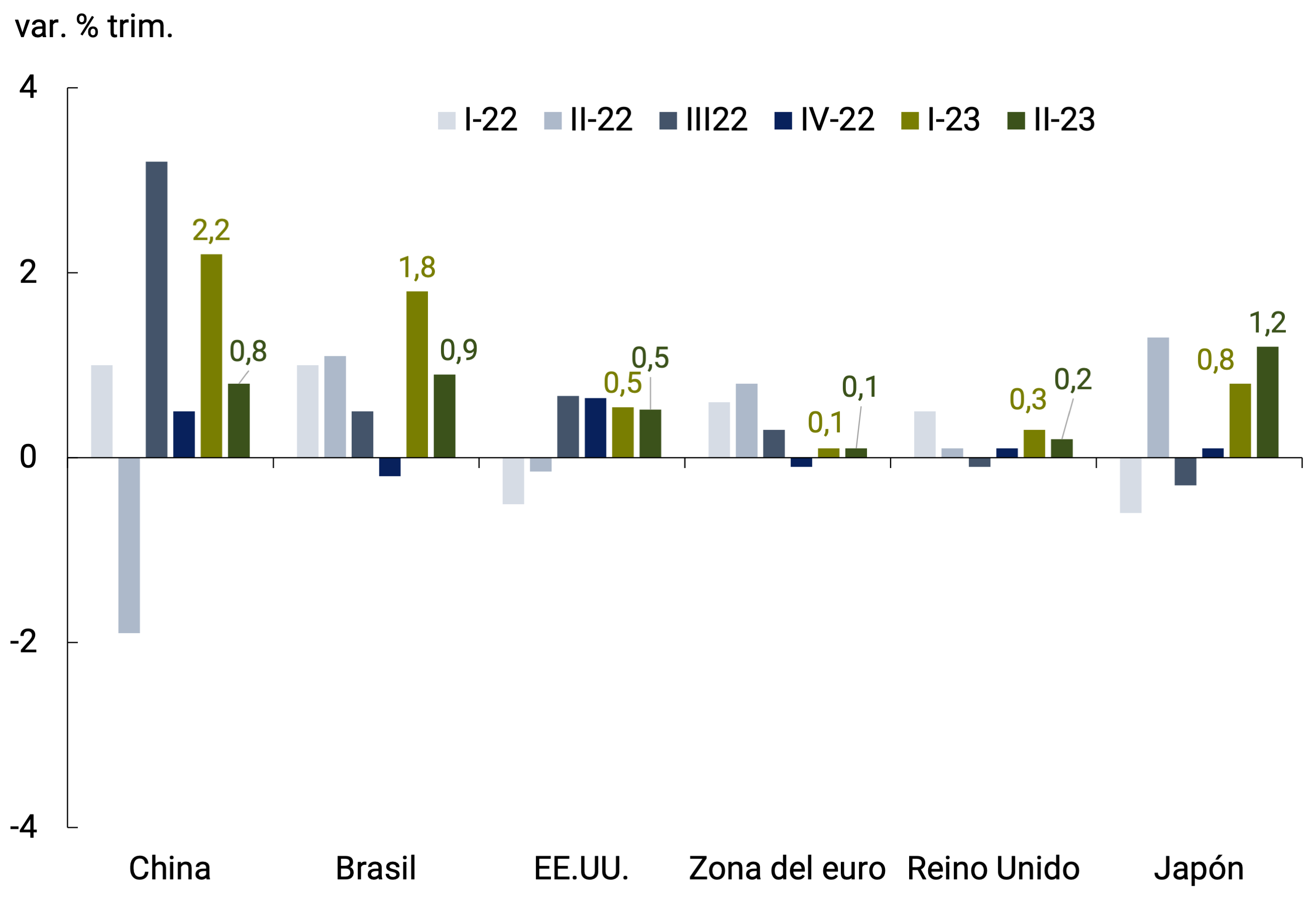 En el segundo trimestre del año la actividad económica global tendió a desacelerarse. En las economías avanzadas, el panorama fue heterogéneo: la zona del euro y el Reino Unido continuaron estancados, con crecimientos trimestrales de 0,1% y 0,2% (sin estacionalidad), respectivamente. En Estados Unidos sorprendió la fortaleza de la economía frente a la política monetaria contractiva con una tasa de crecimiento similar a la del trimestre previo (+0,5% trimestral s.e.); mientras que en Japón el crecimiento se aceleró inesperadamente (de +0,8% a +1,2% trimestral s.e.). Las economías emergentes continuaron registrando un mejor desempeño, pero con señales de desaceleración en algunos casos relevantes. En China, se conjugaron una crisis inmobiliaria en la inversión residencial con menor dinamismo del consumo de los hogares y menor demanda externa por la desaceleración global. Ello llevó a una expansión de sólo 0,8% trimestral s.e. en el segundo trimestre del año, luego del alza de 2,2% del trimestre previo. Asimismo, en Brasil la actividad económica creció 0,9% trimestral s.e., luego de haberse expandido 1,8% en el trimestre anterior (ver el Gráfico 2.1). Los mercados laborales continúan robustos en ambos grupos de países, con una dinámica de creación de empleos que se sostiene, aunque a un menor ritmo, y tasas de desocupación que se mantienen en niveles bajos en términos históricos, pero con algunas señales de deterioro de las condiciones laborales en el margen en algunos casos.
