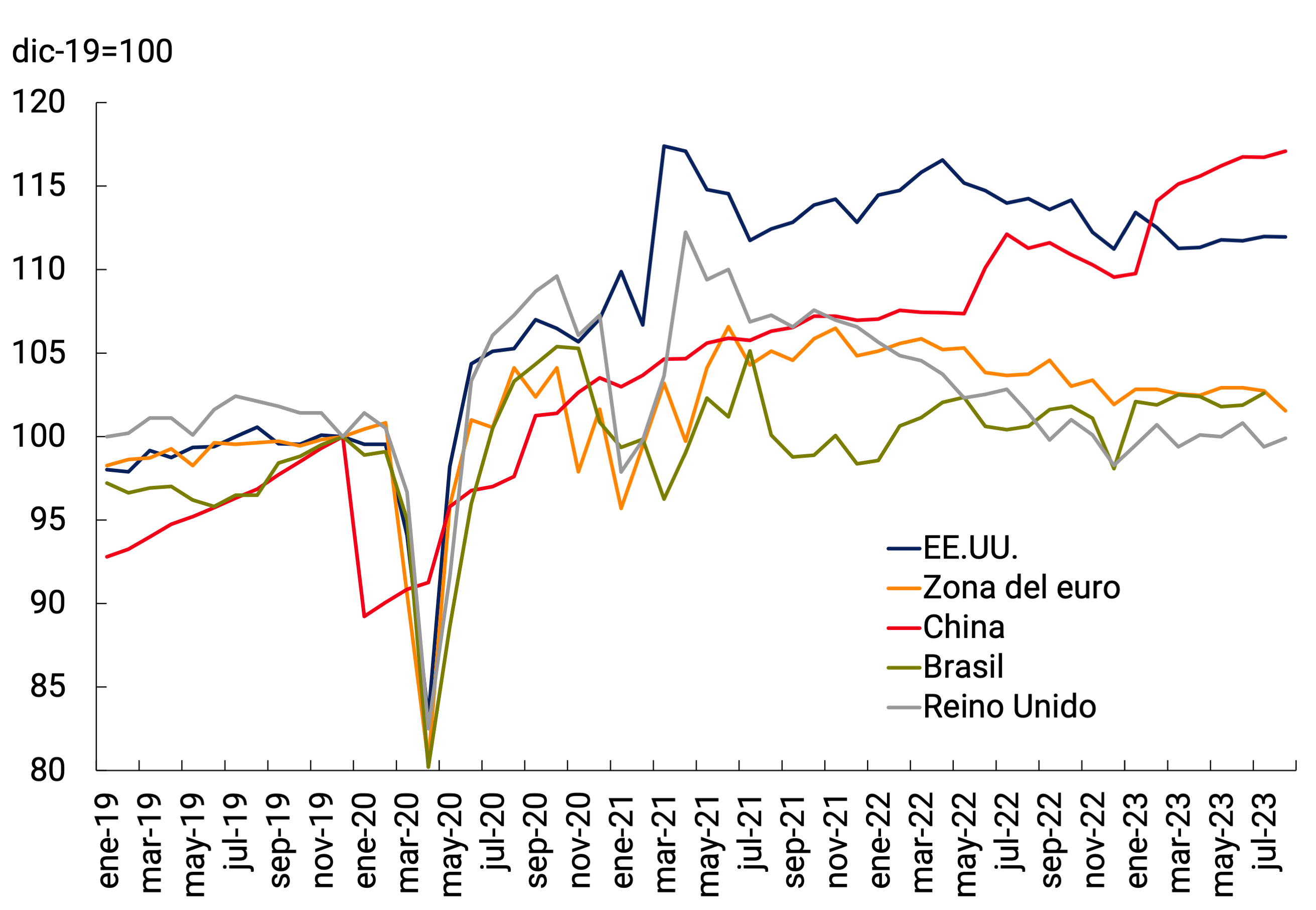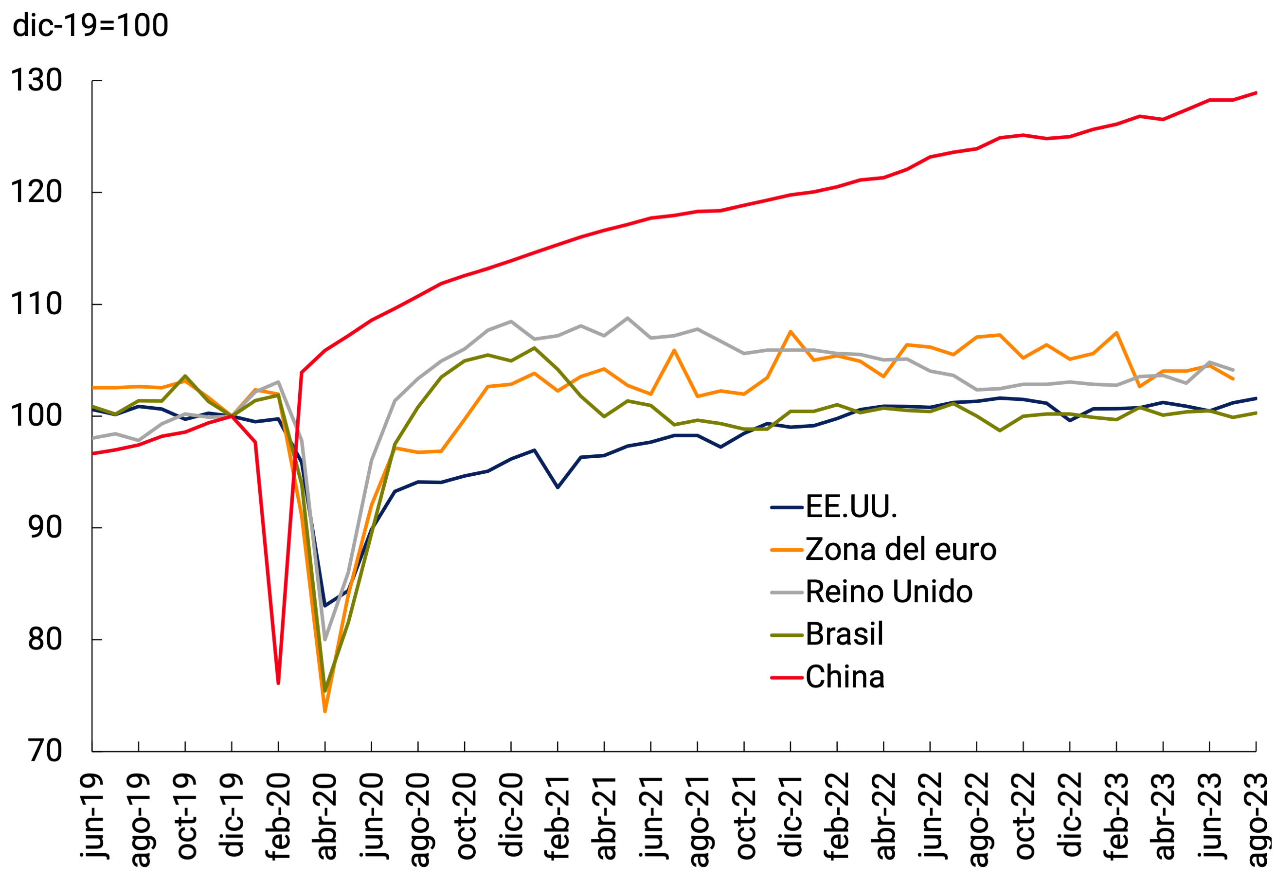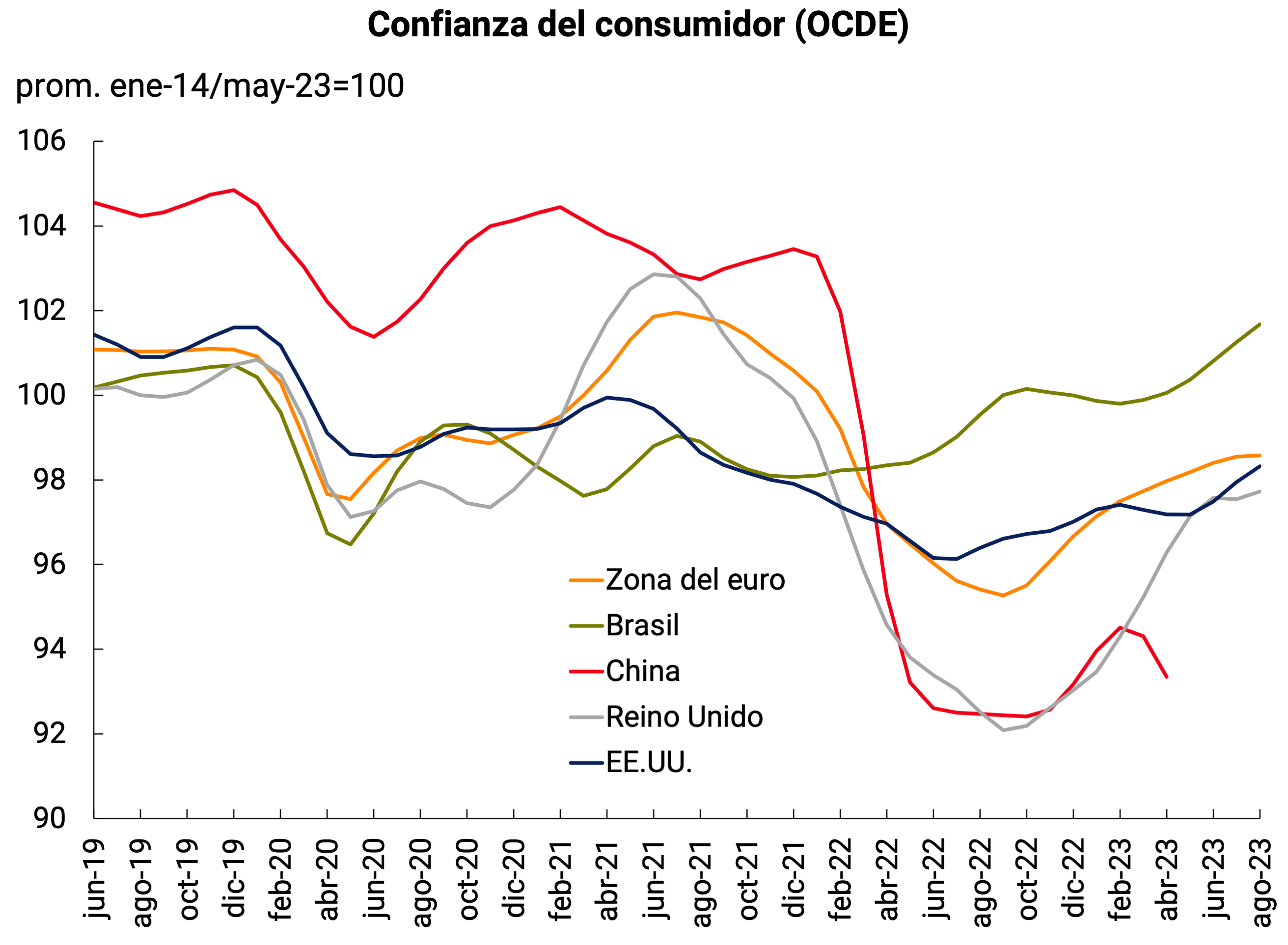 Por su parte, la confianza del consumidor continuó su recuperación en el período mayo-agosto en la zona del euro, Reino Unido, Estados Unidos y Brasil, pero permaneciendo por debajo del promedio de los últimos cinco años (excepto en Brasil que lo ha superado) (ver Gráfico 2.3d). En China, la última medición disponible es de abril y mostró un deterioro de tal magnitud que el valor reportado volvió próximo a los niveles de diciembre de 2022 cuando comenzaron a levantarse las restricciones sanitarias por la pandemia del COVID-19. Las y los analistas acuerdan en que la confianza del consumidor ha seguido declinando.