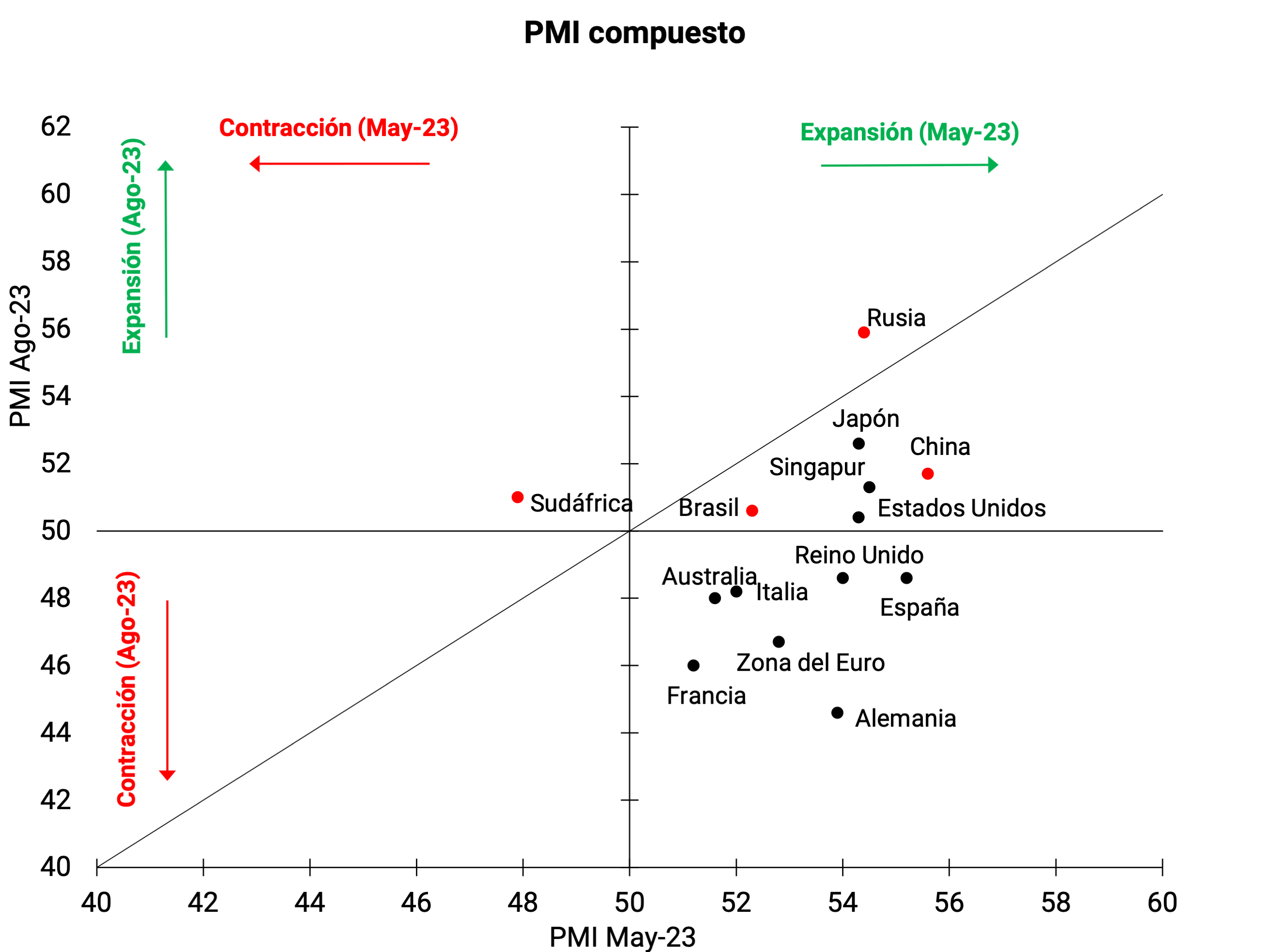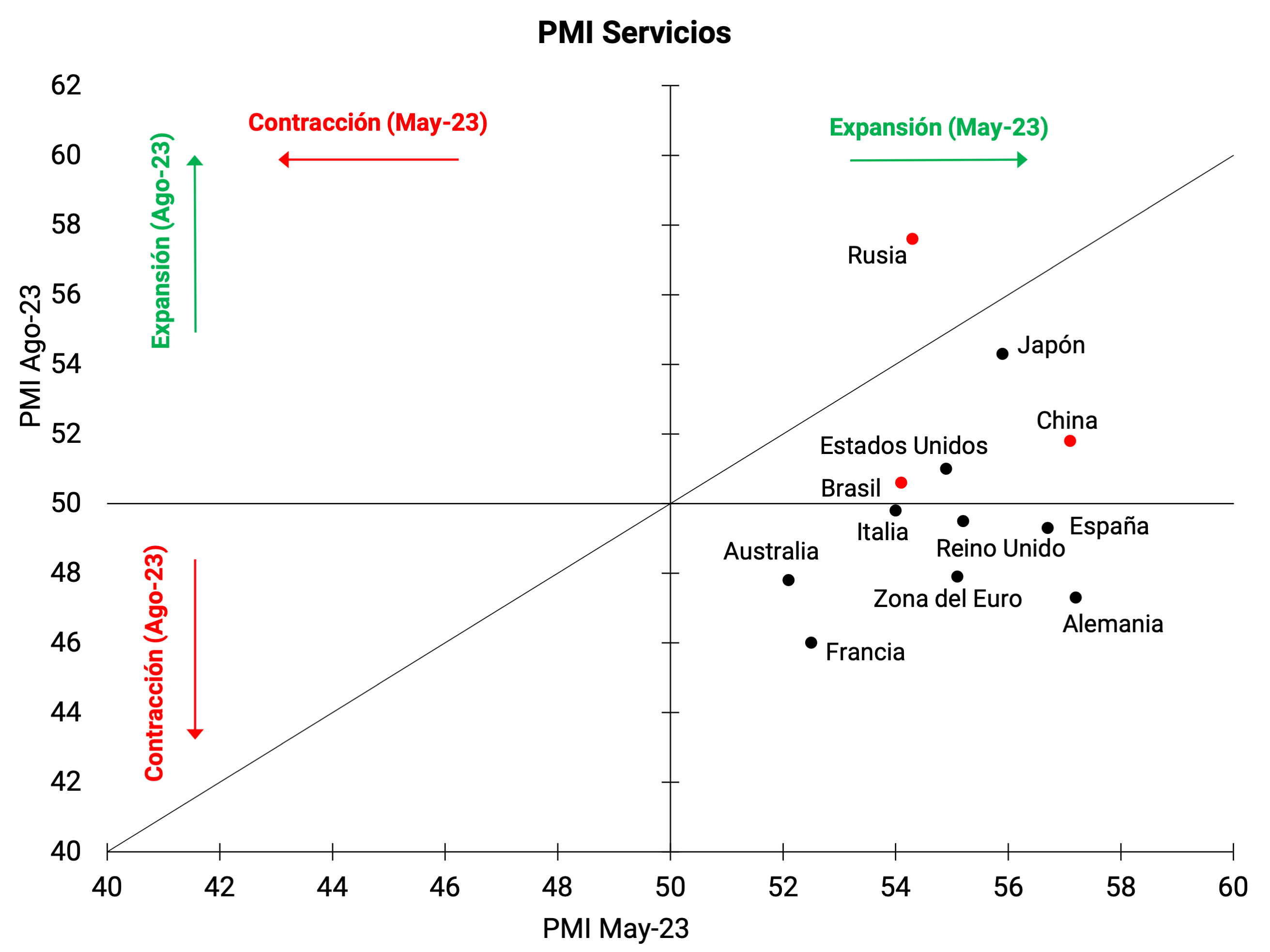 Se abren varios focos de riesgo para la economía global. Será clave la evolución de China y las repercusiones financieras de su crisis inmobiliaria. Por otra parte, si se consolida el escenario de un “aterrizaje suave” de la economía norteamericana, ello apoyaría la actividad global, contrastando con otras economías avanzadas que casi no crecen. Pero a nivel financiero, el escenario de “tasas más altas por más tiempo” implicaría un diferencial de rendimientos a favor de los bonos de economías avanzadas, fortaleciendo también el dólar estadounidense y endureciendo en general las condiciones financieras internacionales. El balance de riesgos luce bajista para la actividad global y con persistencia para la inflación, sobre todo en economías avanzadas.
