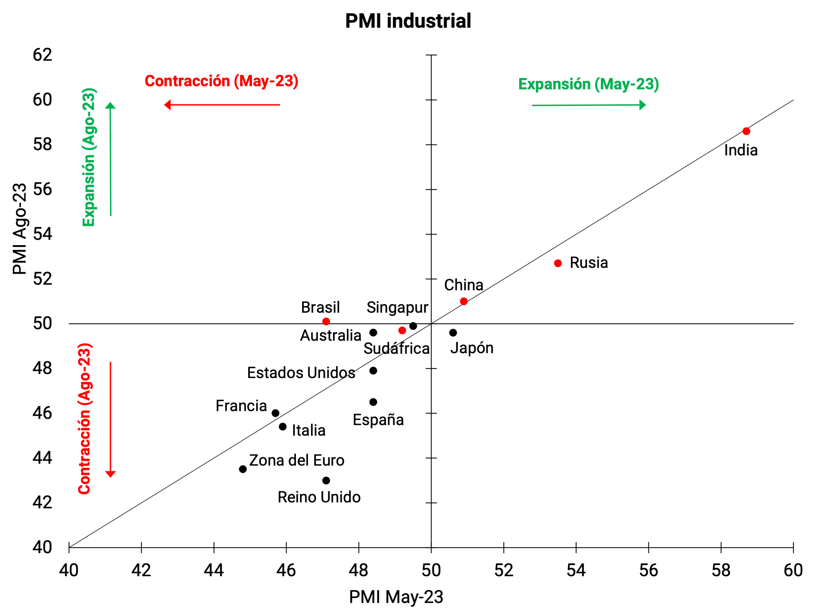 Los indicadores prospectivos también evidencian la misma dinámica de un deterioro de la actividad en el tercer trimestre, con un giro en su tendencia respecto al informe previo. El índice compuesto elaborado a partir de las encuestas a los gerentes de compras (PMI) tendió a disminuir en muchos países (puntos ubicados por debajo de la diagonal) y, en particular, pasó a zona de contracción en Europa (Gráfico 2.3a). El sector servicios, que impulsaba la expansión, experimentó un significativo retroceso (ver Gráfico 2.3c) y el industrial, con la excepción de los países que integran los BRICS, permanece en contracción (ver Gráfico 2.3b).