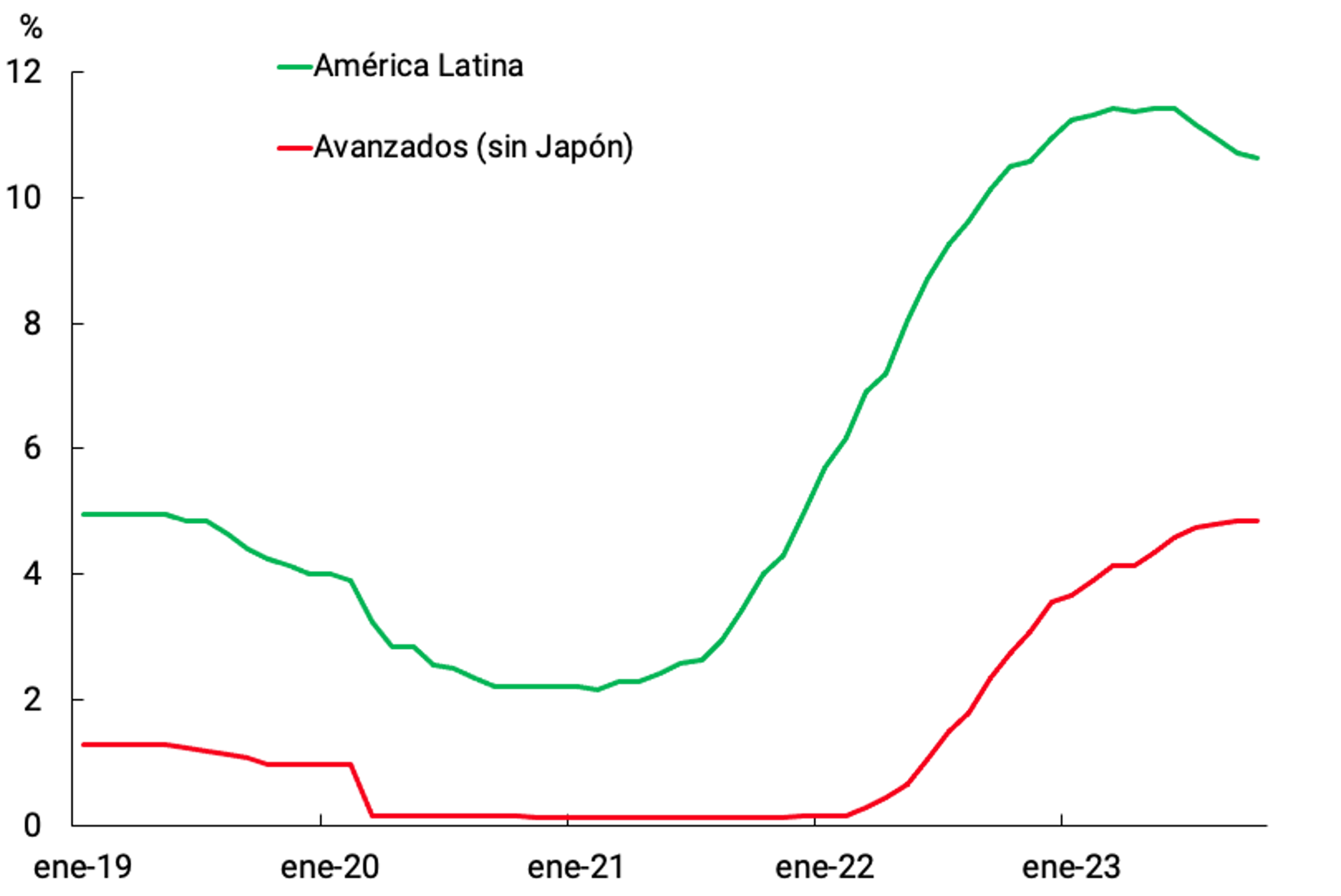 2.2. Política monetaria: tasas de interés estables o en alza en países avanzados, cediendo en países en desarrollo