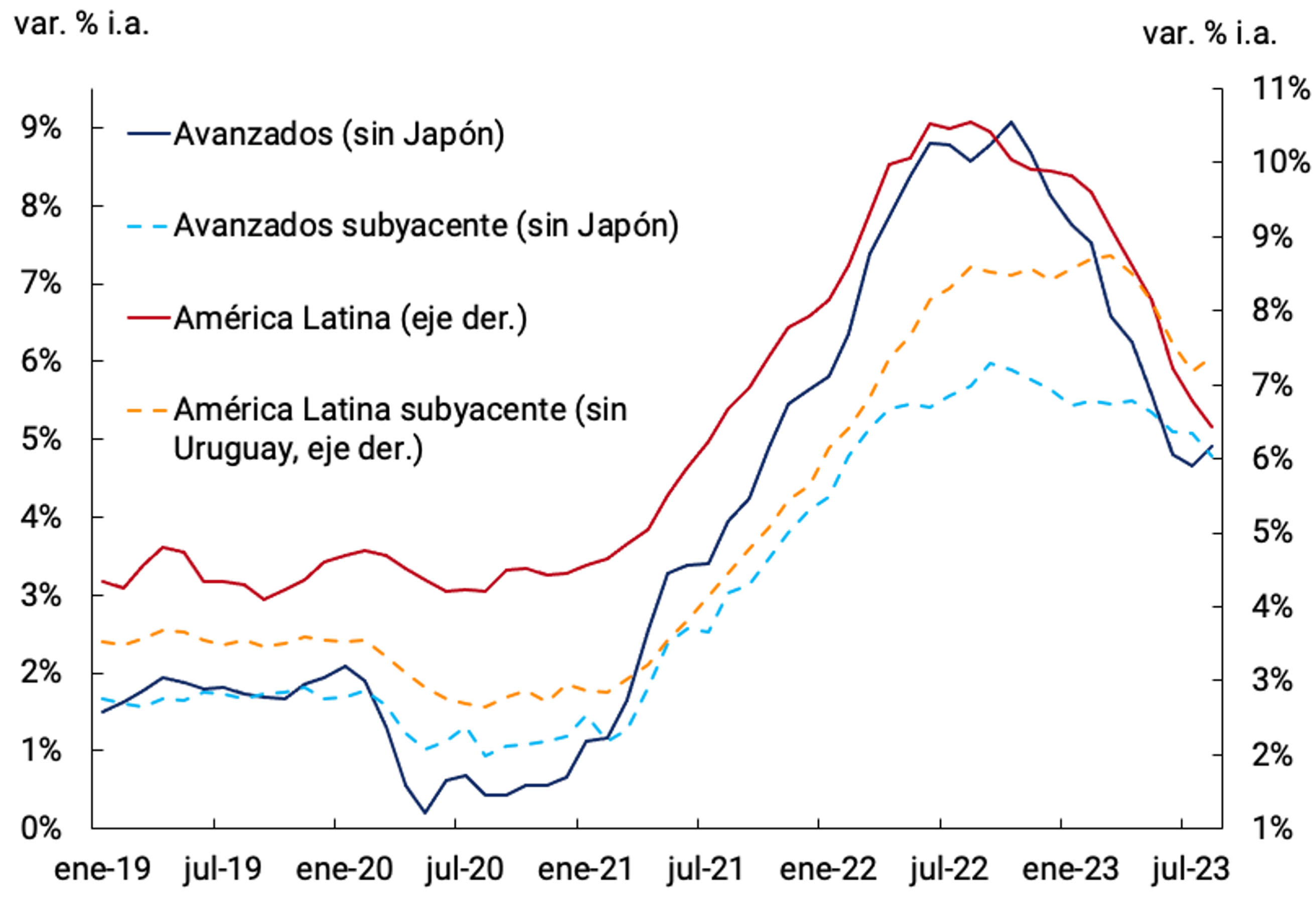 Los riesgos para la actividad mundial siguen sesgados a la baja. En China es incierta la repercusión financiera de la crisis inmobiliaria, y será clave la respuesta de política económica. En tanto, la persistencia de la inflación subyacente en algunas economías avanzadas podría derivar en subas adicionales de las tasas de interés y eventuales turbulencias financieras (bancarias o vinculadas con situaciones de insostenibilidad de deudas empresarias y soberanas). Las tensiones geopolíticas persisten como focos de riesgo, y pueden implicar una mayor fragmentación comercial.