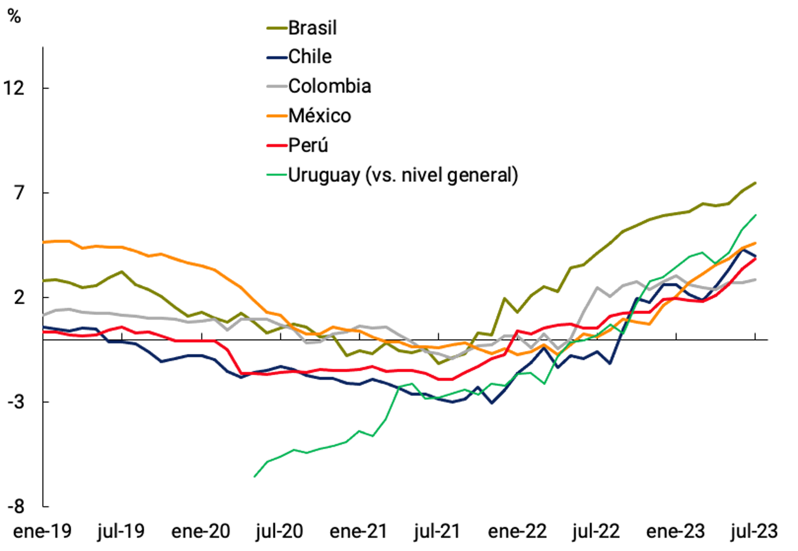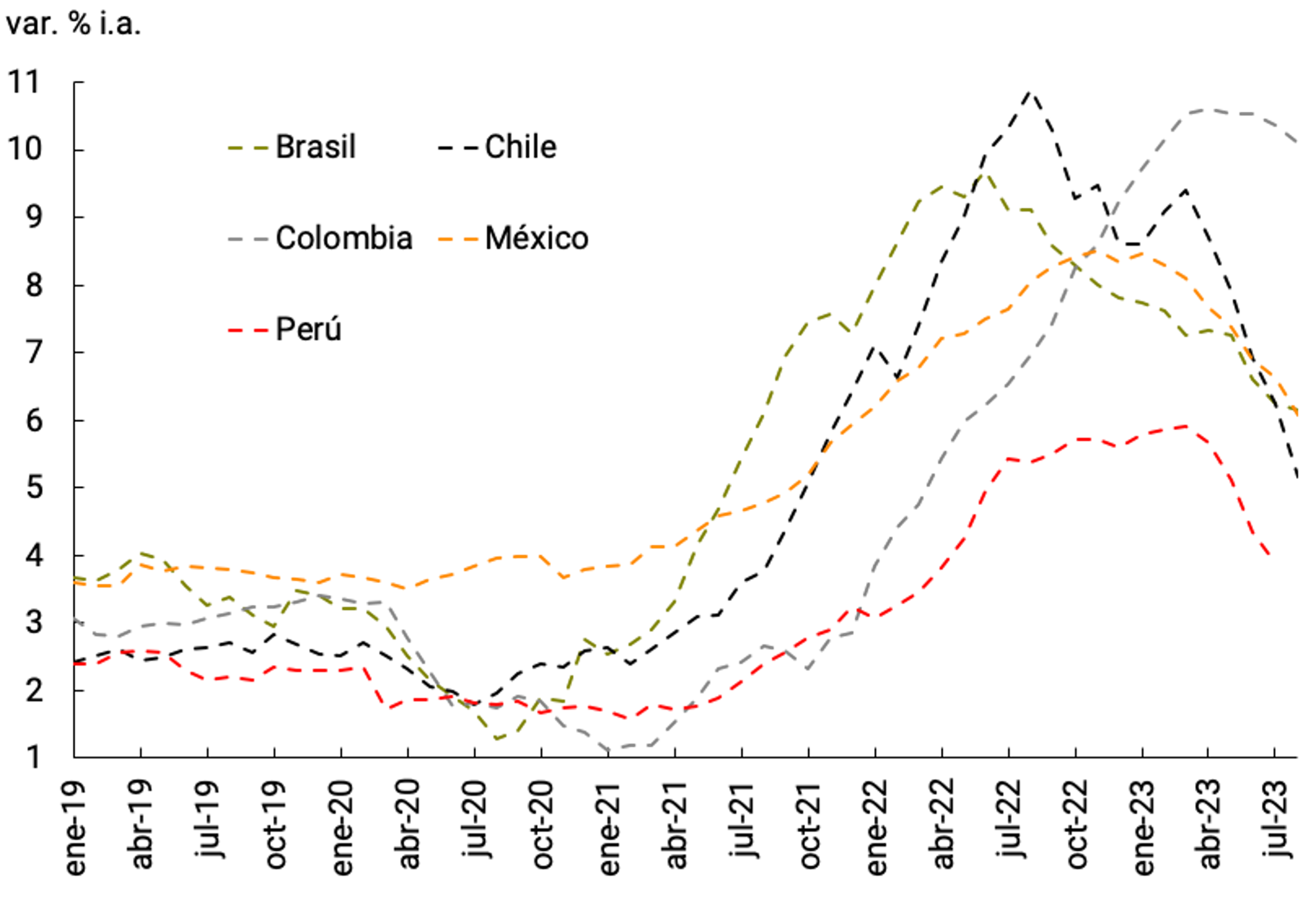 En Latinoamérica, comenzó reduciendo su TPM el Banco Central de Uruguay, seguido por los de Brasil y Chile. En todos los casos, la TPM habría pasado ya su nivel máximo (quizás con la excepción de Colombia). La TPM en términos reales (vs. inflación subyacente) en todos los casos continuó aumentando, salvo en Chile. La inflación subyacente está reduciéndose, excepto en Colombia (donde si bien dejó de subir, está constante en valores cercanos a 10,5%; ver Gráficos 2.5a y b).
