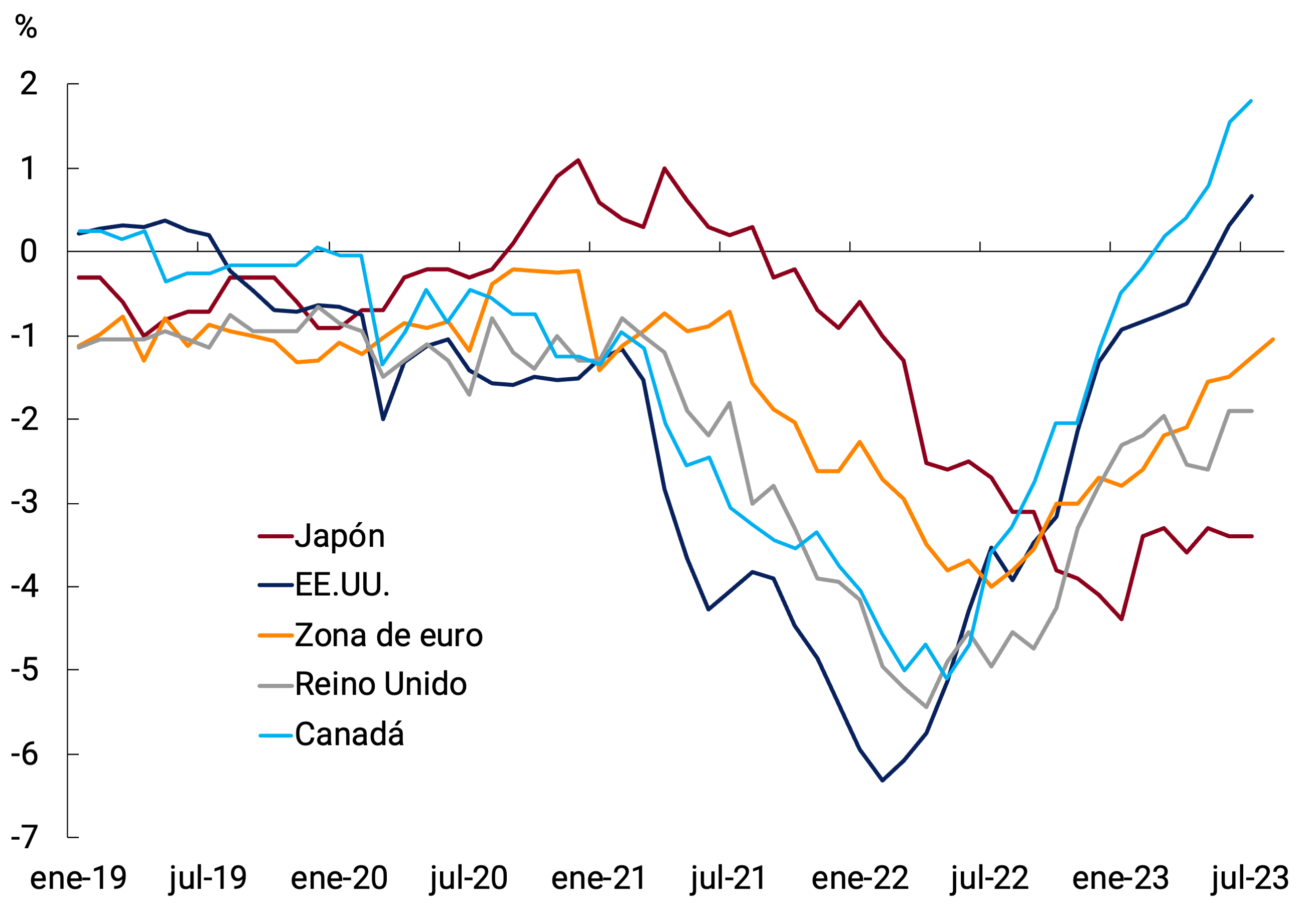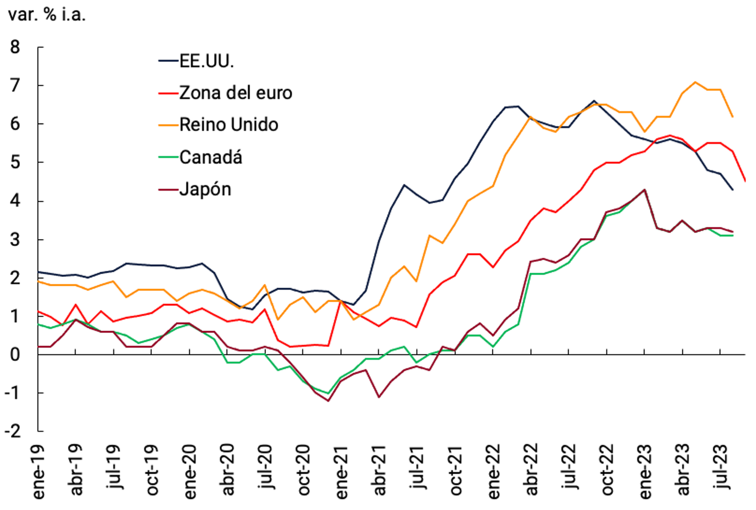 Los ciclos de política monetaria continúan desfasados. Los bancos centrales de economías desarrolladas mantienen sus tasas de interés de política monetaria (TPM) “en pausa” e incluso podrían volver a subirlas (como hizo el Banco Central Europeo en septiembre); mientras que los de países en desarrollo han comenzado a bajarlas, particularmente en Latinoamérica. Estos ciclos de política monetaria están relacionados a la evolución de la inflación: los bancos centrales latinoamericanos comenzaron antes a subir sus TPM, y en la región la inflación ha comenzado a ceder antes (ver Gráficos 2.4a y b).