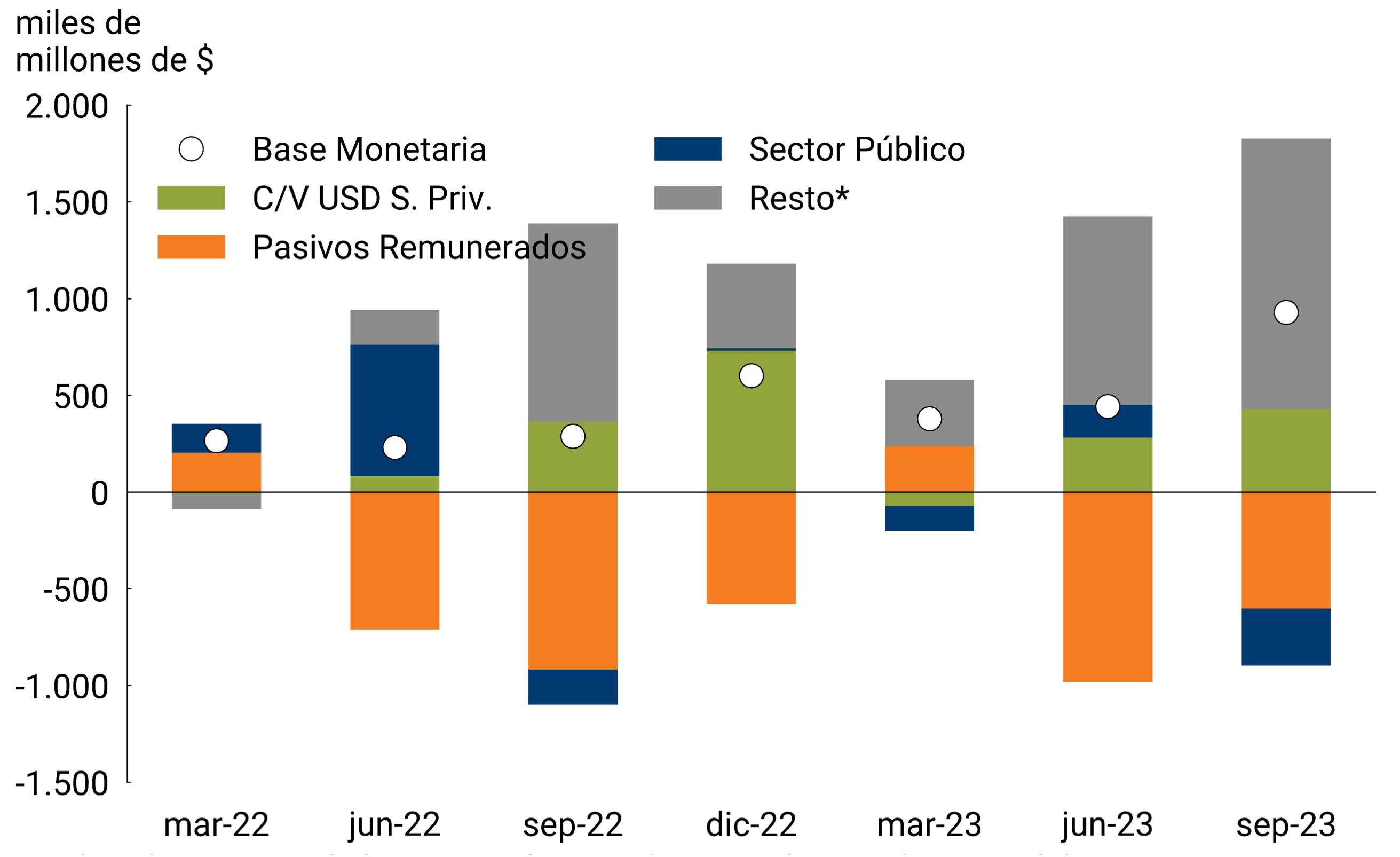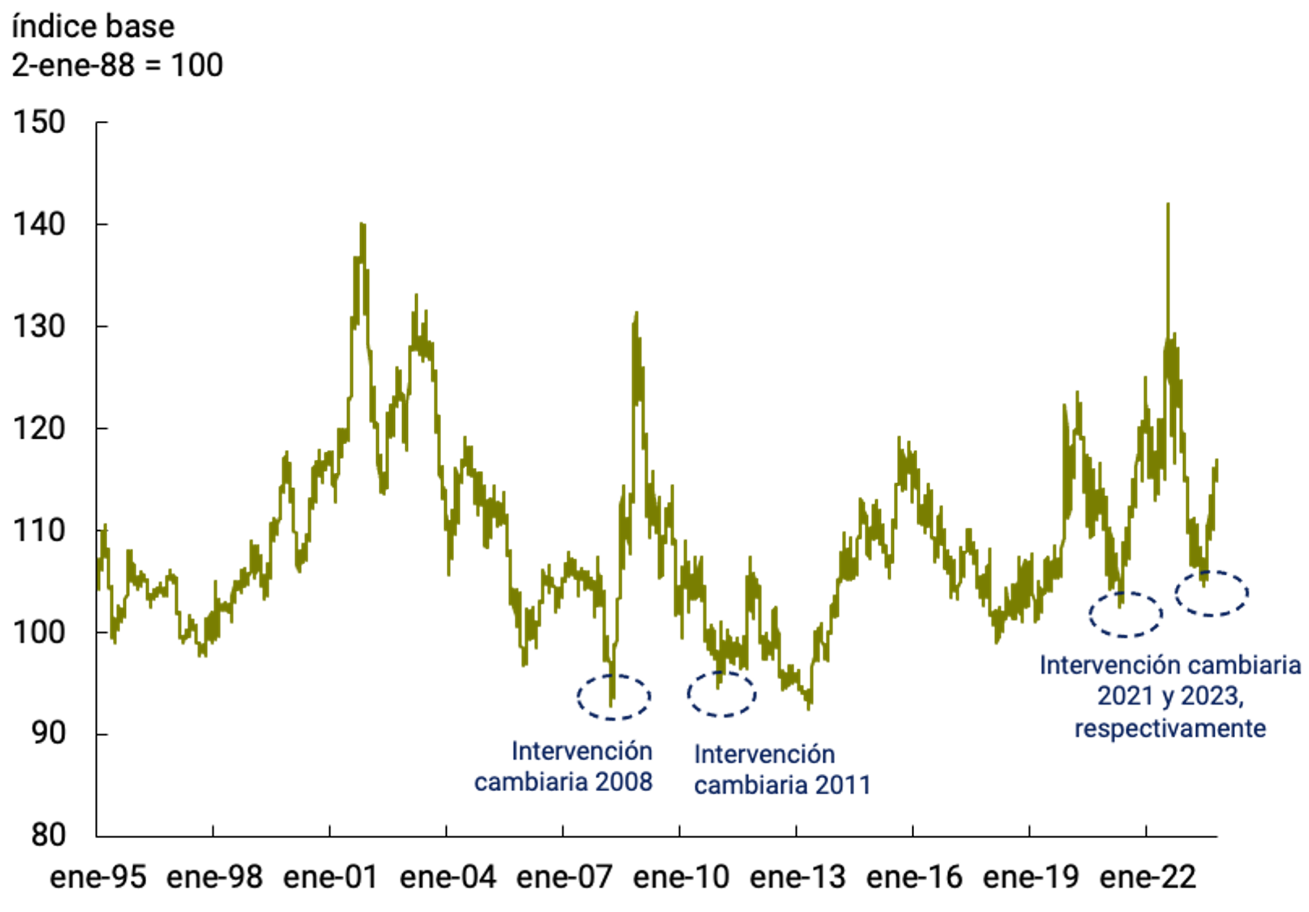Durante la primera mitad de 2023 el dólar norteamericano en términos multilaterales experimentó una depreciación que a partir de mediados de julio comenzó a revertirse por diversos motivos, la divergencia en la velocidad de la implementación de políticas monetarias con otras economías, con su impacto en el diferencial de tasas de interés, y el incremento en el precio del petróleo, entre otros.