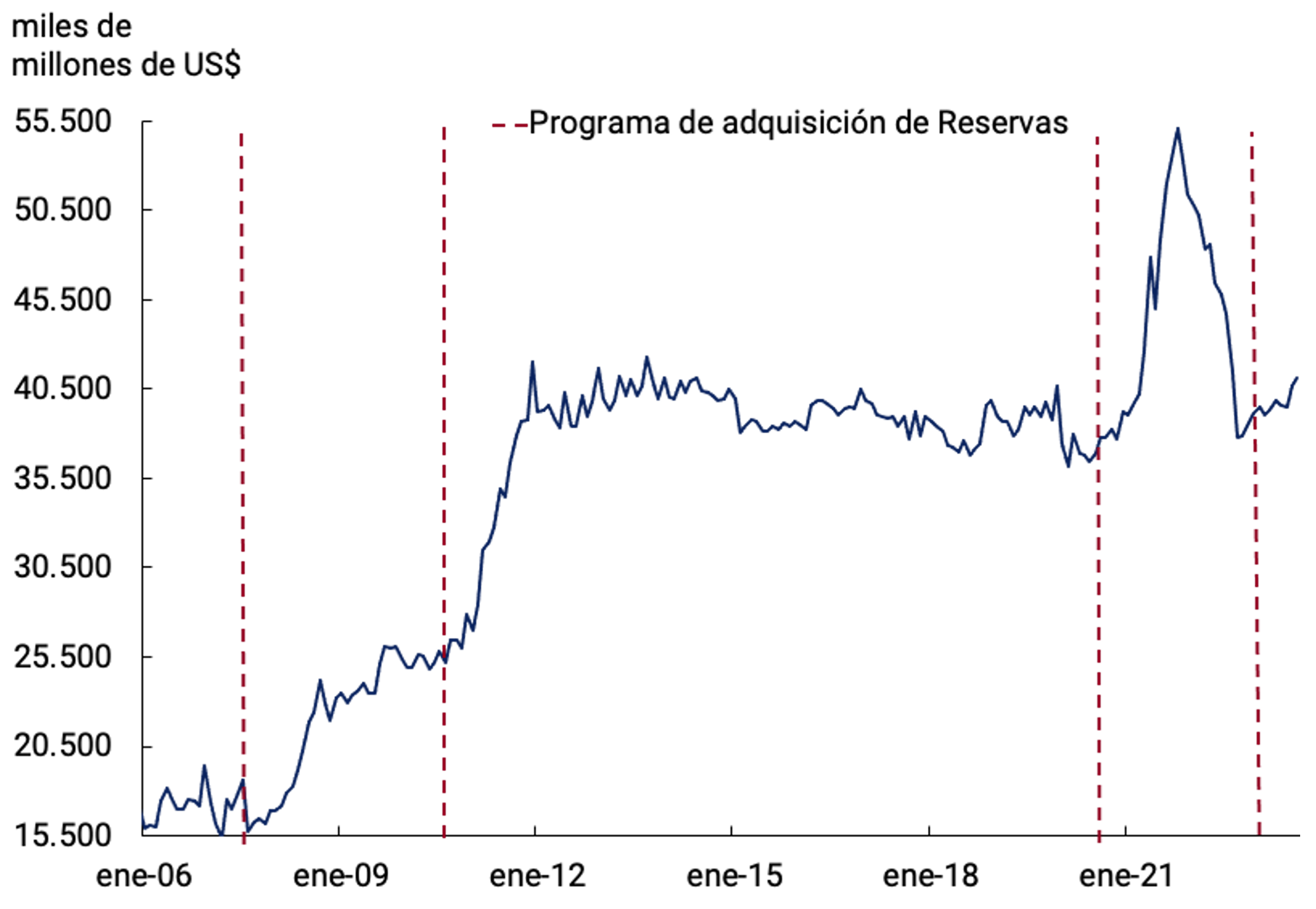 Además, dentro de la región la autoridad monetaria de Chile (BCCh) comenzó un nuevo proceso de acumulación de reservas internacionales. El BCCh inició un programa de reposición y ampliación de reservas internacionales por un total de US$10.000 millones, para fortalecer la posición de liquidez internacional del país, compras que tendrán un efecto monetario nulo al ser esterilizadas (ver Gráficos 2.7a y b).