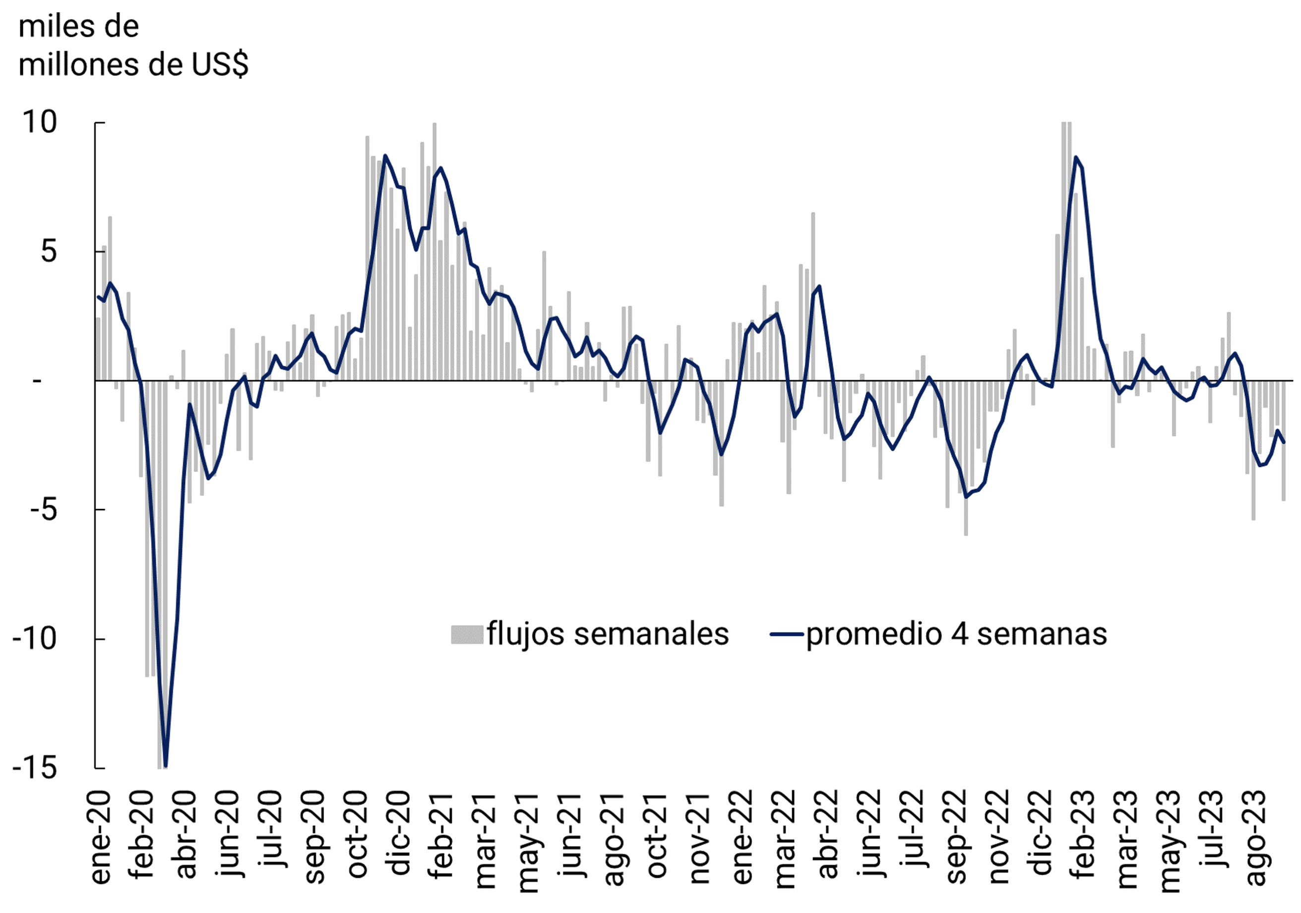 En ese contexto, las bolsas globales moderaron las subas en el año y bajaron cerca de un 4% con respecto al cierre del IPOM anterior. Desde comienzos de año, las bolsas europeas han subido alrededor de un 8% y en Estados Unidos el S&P 500 y el Nasdaq subieron 11% y 26%, respectivamente (ver gráfico 2.9a). Las acciones de América Latina, medidas por el índice MSCI, cayeron 14,9% desde fines de julio, período que coincide con salidas de capitales de países emergentes en línea con la reversión del ciclo de tasas descripta en la sección anterior (ver gráfico 2.9b). Si bien las salidas de capitales se dieron en todo el conjunto de emergentes, fueron mucho más importantes en el caso de China.
