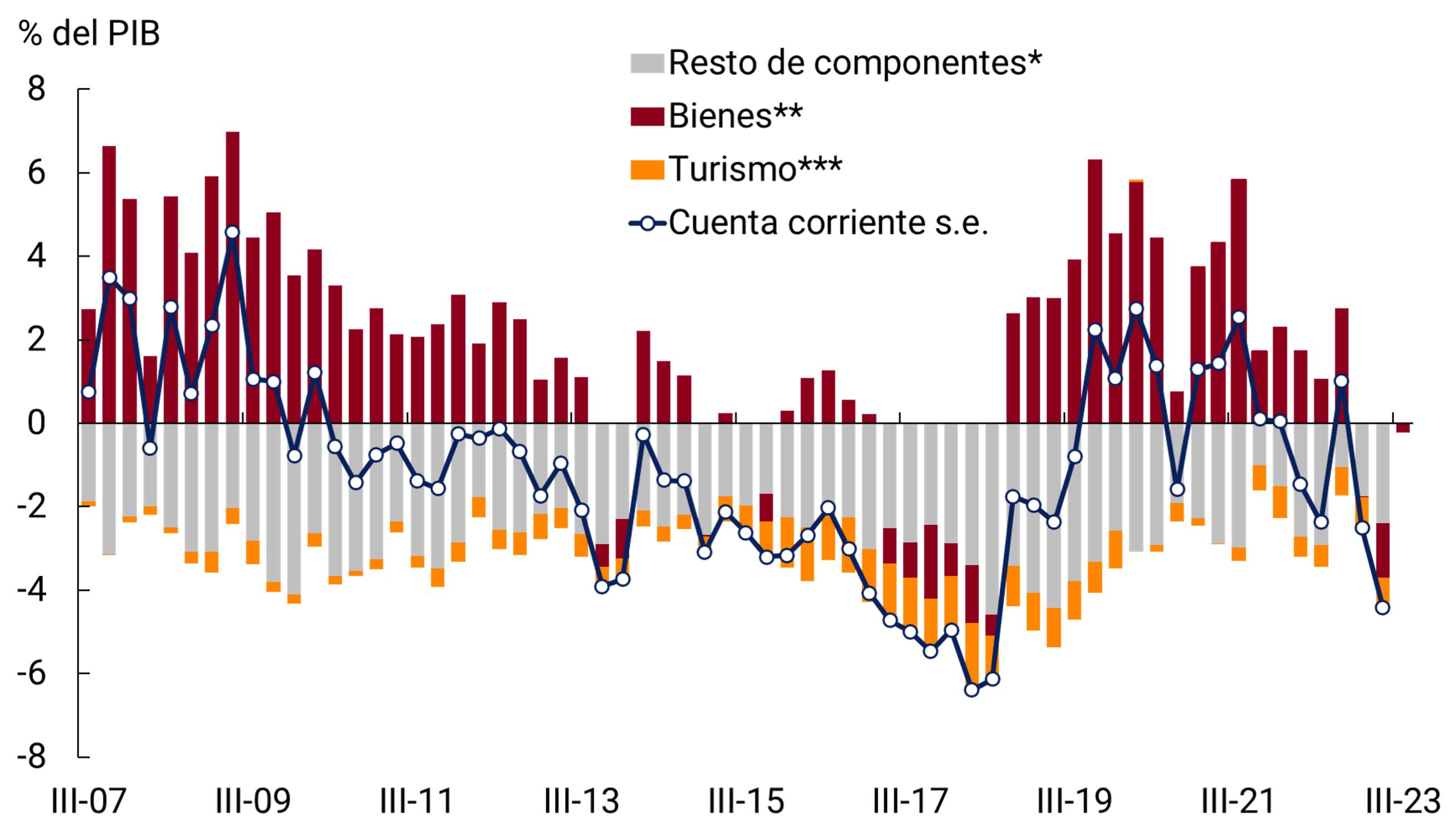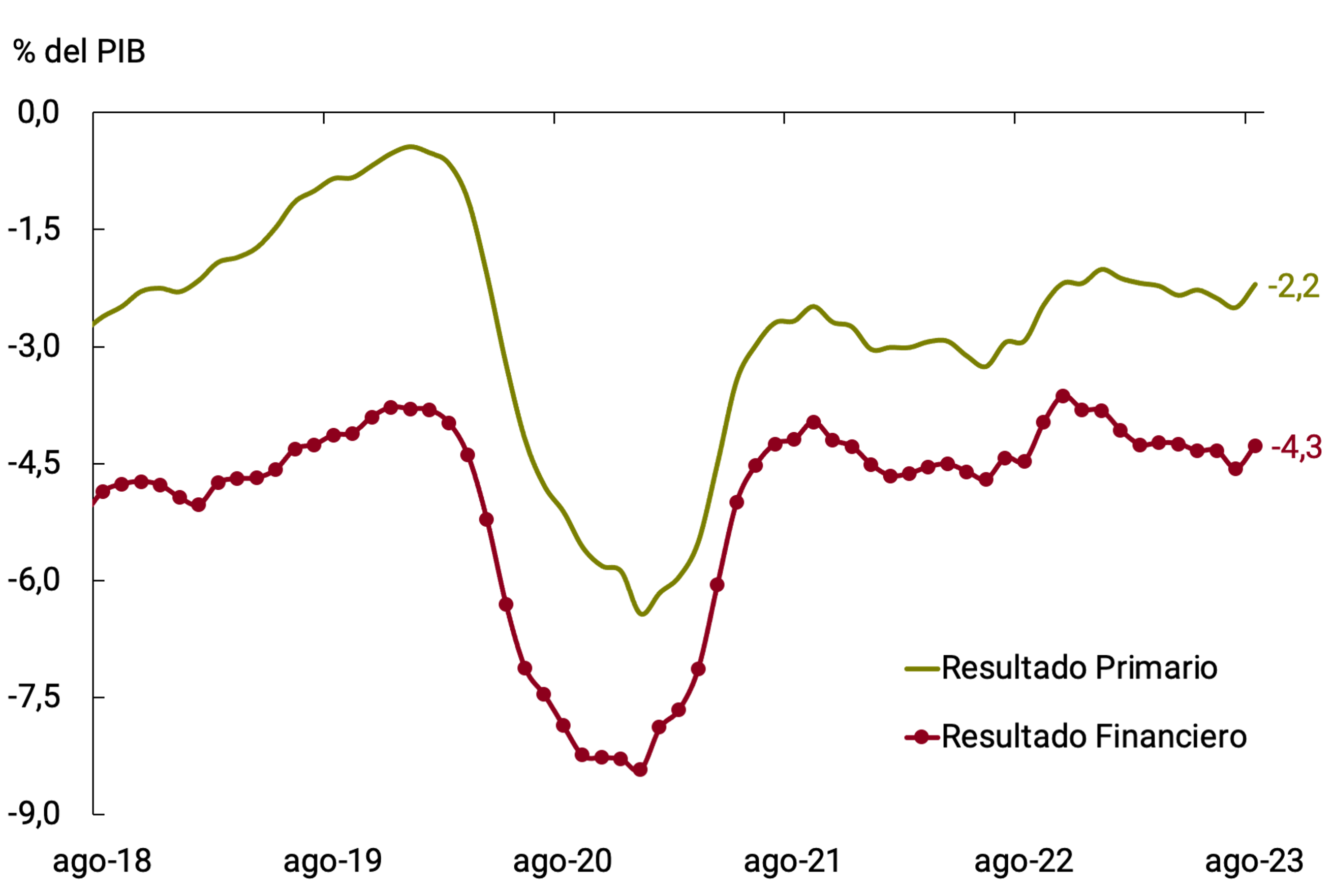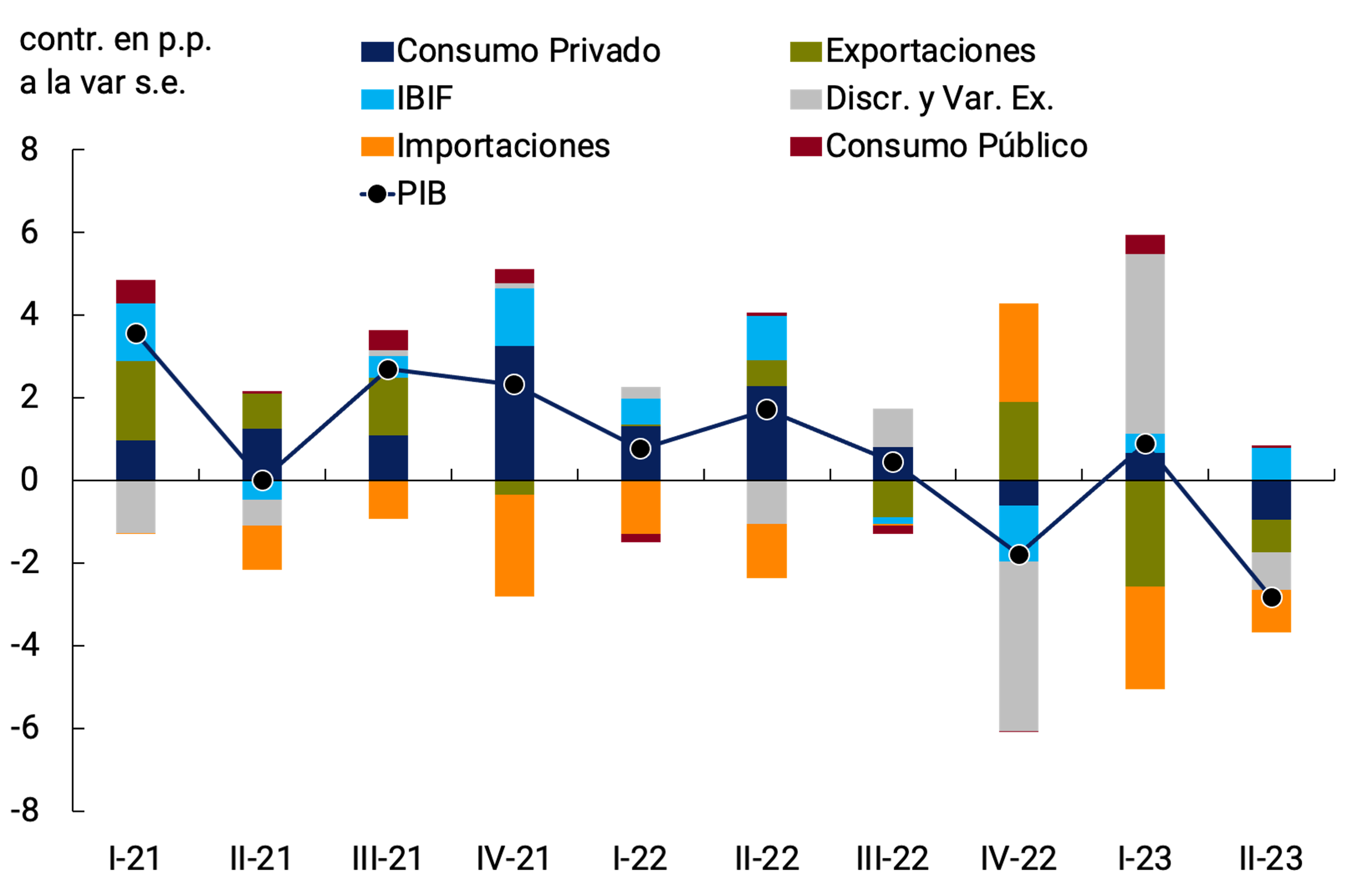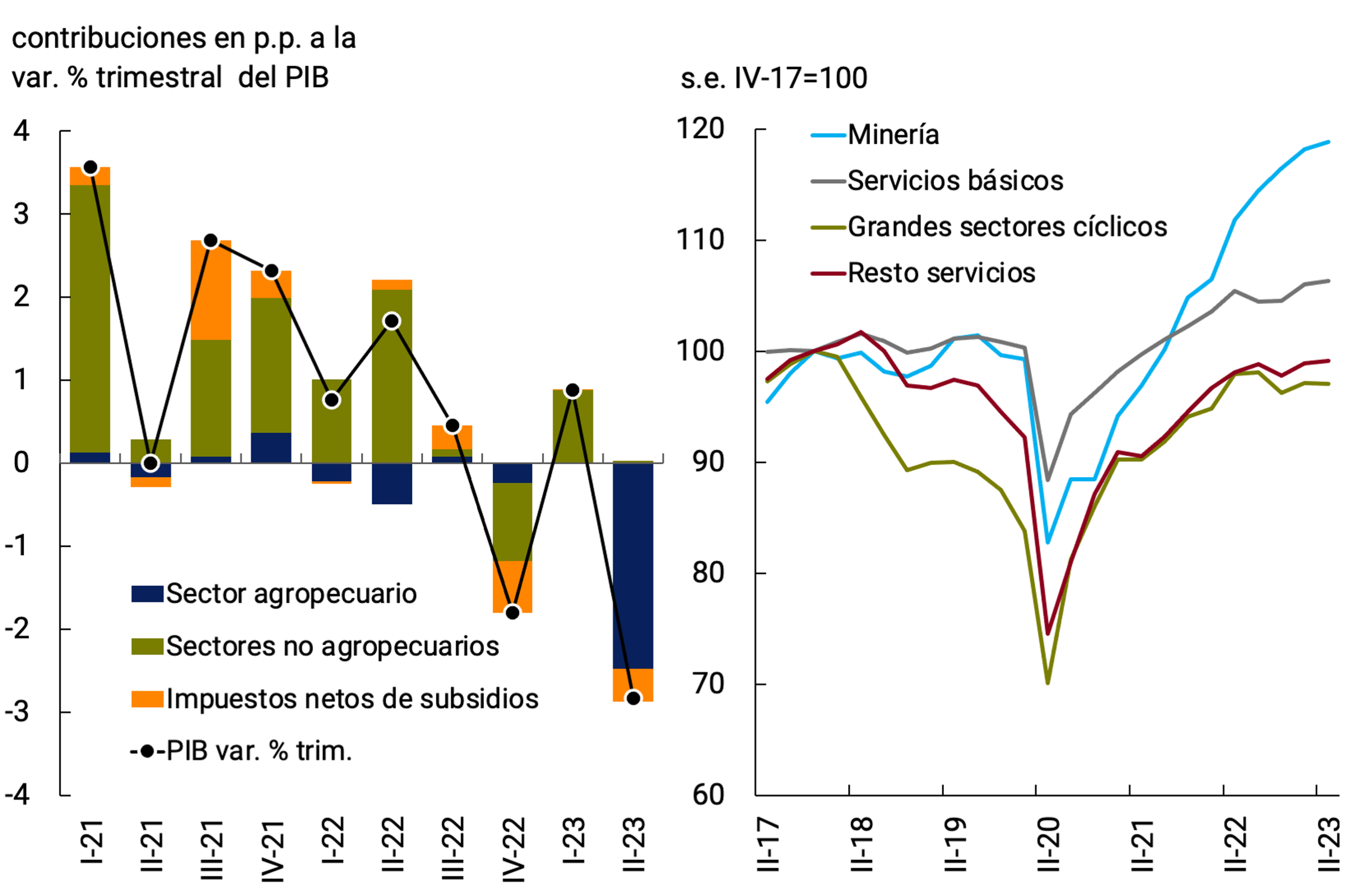 El Producto Interno Bruto (PIB) cayó 2,8% trimestral s.e. y 4,9% i.a. en el segundo trimestre de 2023 (II-23) debido al impacto directo de la sequía sobre la actividad agropecuaria. En efecto, la contracción del producto agropecuario explicó íntegramente tanto la variación trimestral (-3,0% s.e.) como la interanual (-5,1%) del PIB medido a precios básicos (sin considerar impuestos).