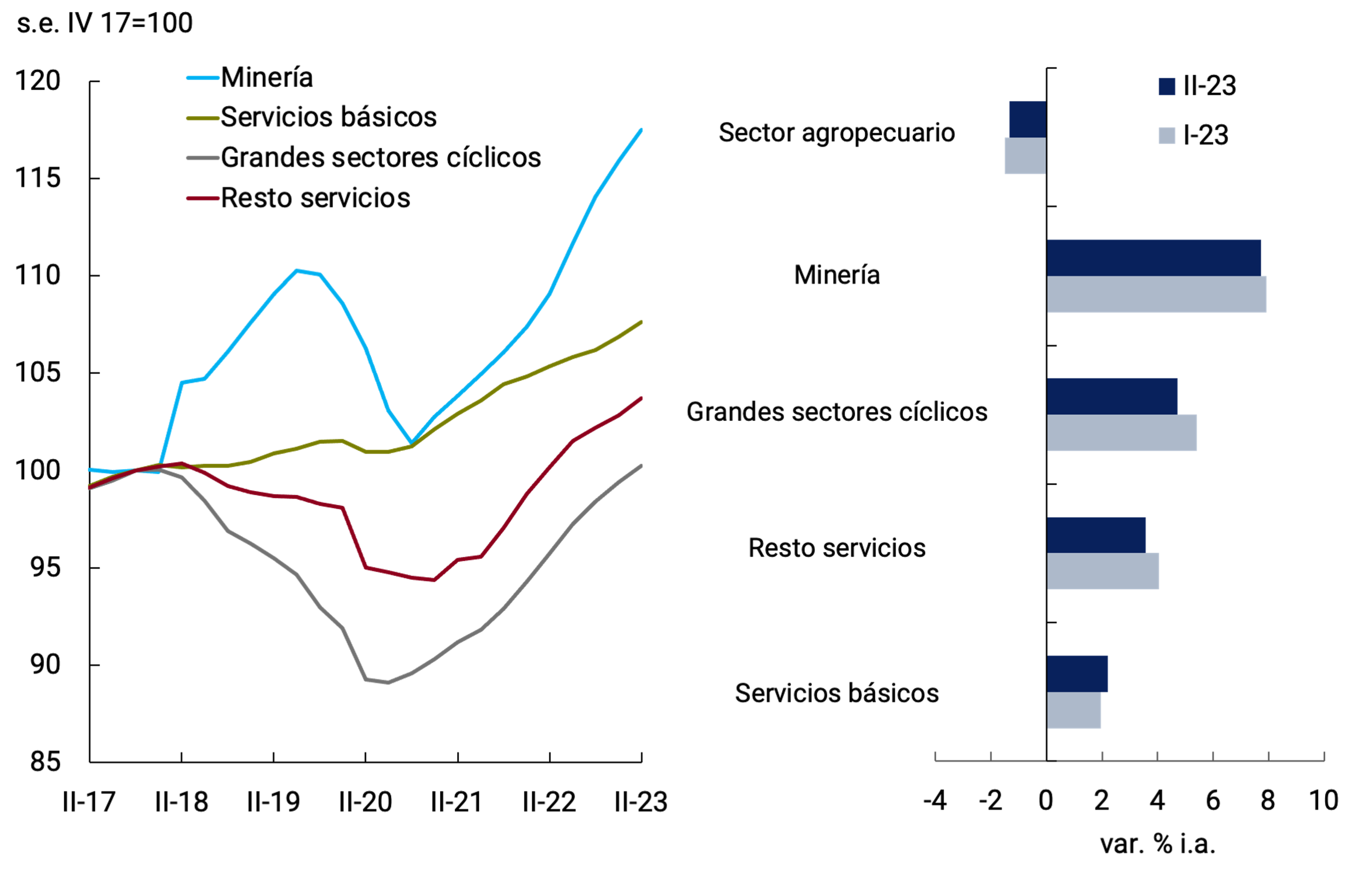 En línea con la evolución de la actividad, la Minería lideró la creación de empleo formal en el II-23, con un incremento de 7,7% i.a. y de 17,5% s.e. acumulado desde el IV-17. El empleo formal en el conjunto de los Grandes sectores cíclicos (Industria, Comercio, Construcción y Transporte y comunicaciones) aumentó significativamente en el II-23 (4,7% i.a.), con un ritmo superior al que experimentaron el “Resto de los servicios” (3,6% i.a.). En los servicios denominados “básicos” la creación de empleo formal mantuvo su tendencia relativamente estable en torno al 2,2% i.a. (ver Gráfico 3.3).