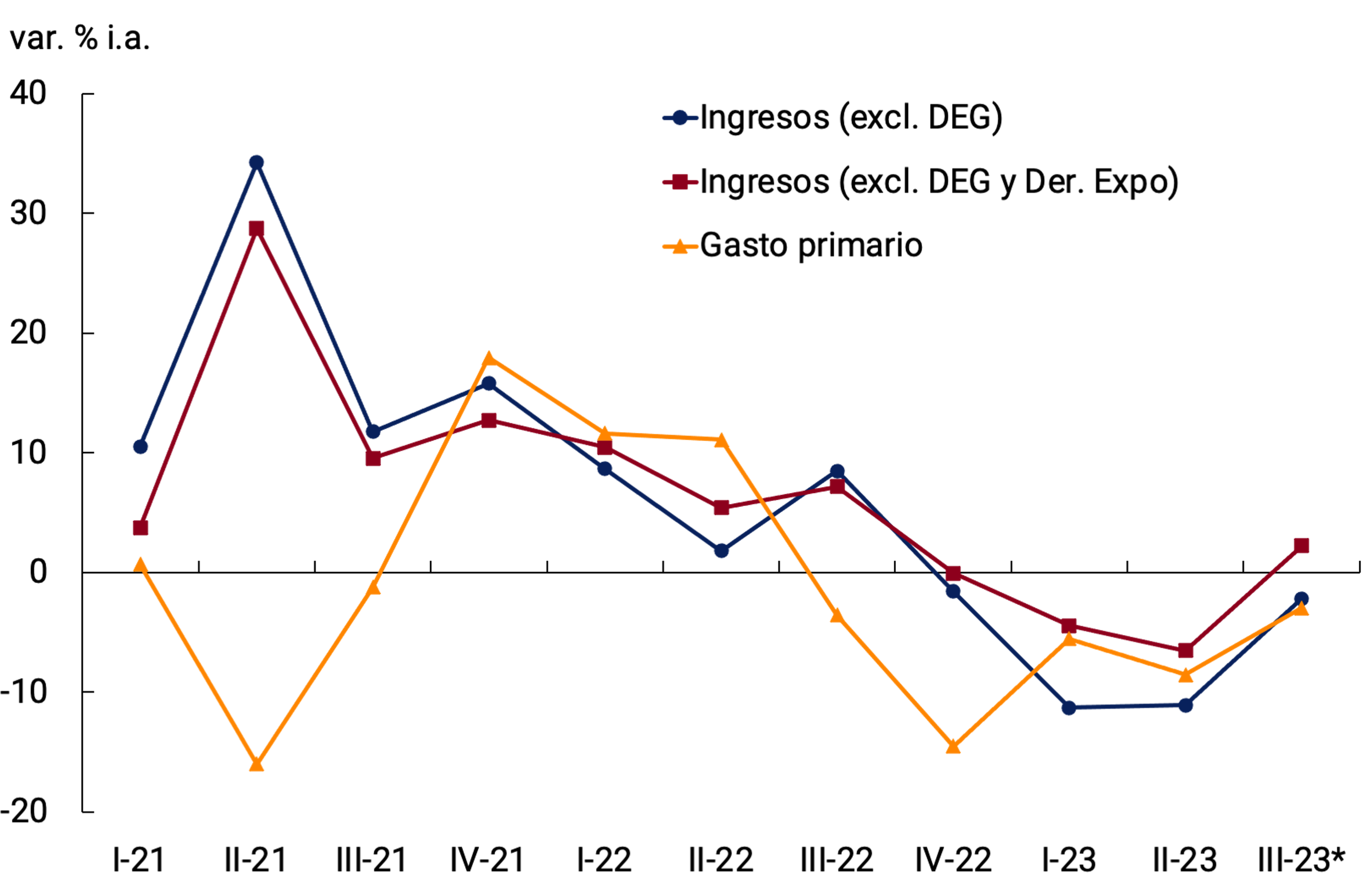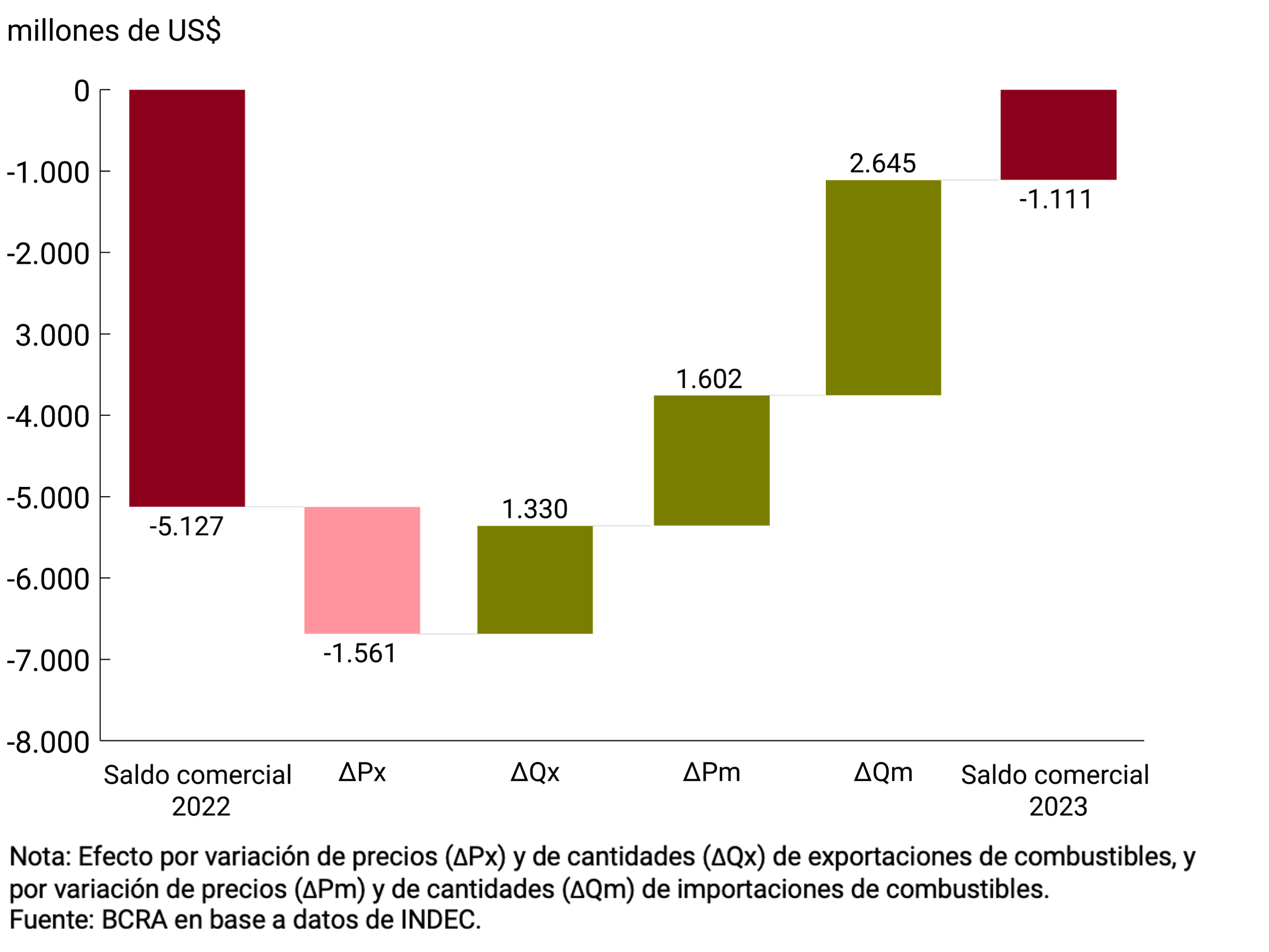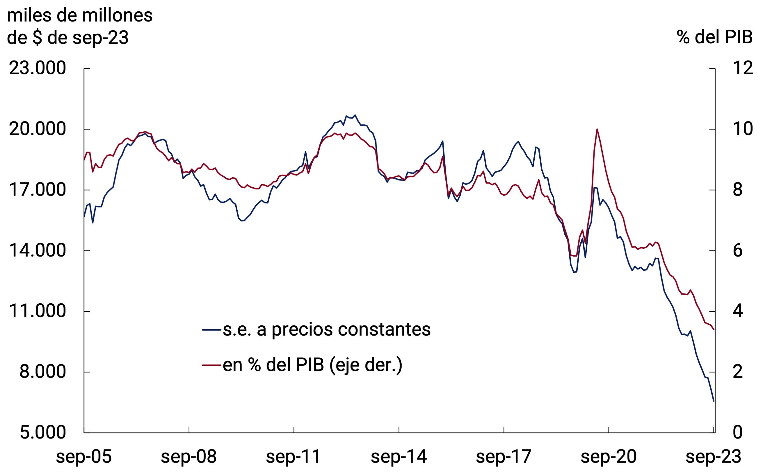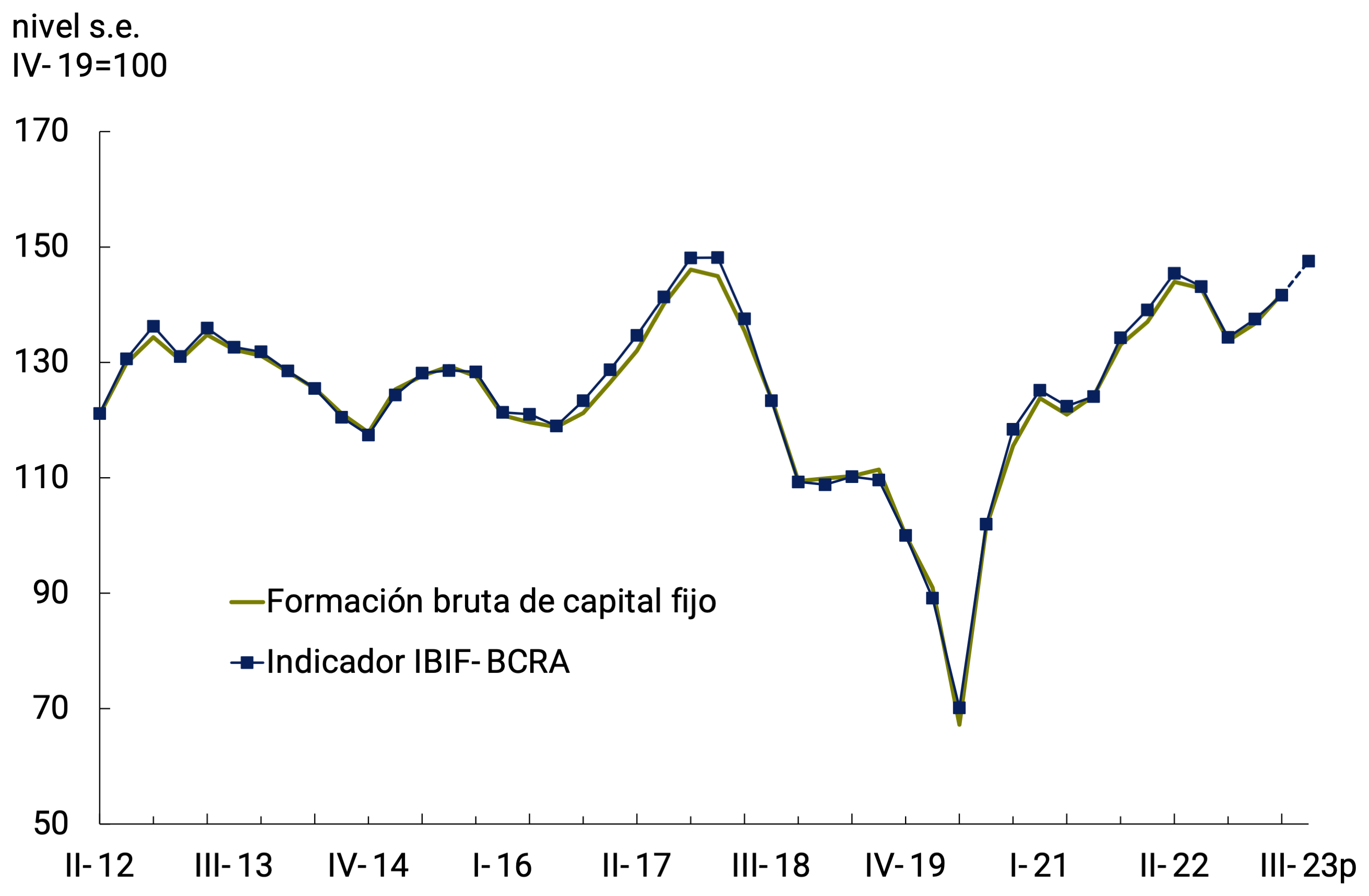 21 Corresponde a la clasificación de Bienes de Capital del IPI de FIEL que registró un arrastre de -2,2 p.p. para el III-23 y al IPIm Maquinaria y equipo del INDEC, que dejó un arrastre de 2,1 p.p. en ago-23 para el III-23, en ambos casos la desestacionalización es propia. El EMAE de la construcción dejó, en jul-23, un arrastre de -1,8 p.p. para el III-23 y el ISAC de agosto dejó un arrastre de -1,4 p.p. En tanto, las cantidades importadas de bienes de capital y equipos de transporte, registró una fuerte suba de 13,4% en el bimestre julio-agosto de 2023, contra el II-23.