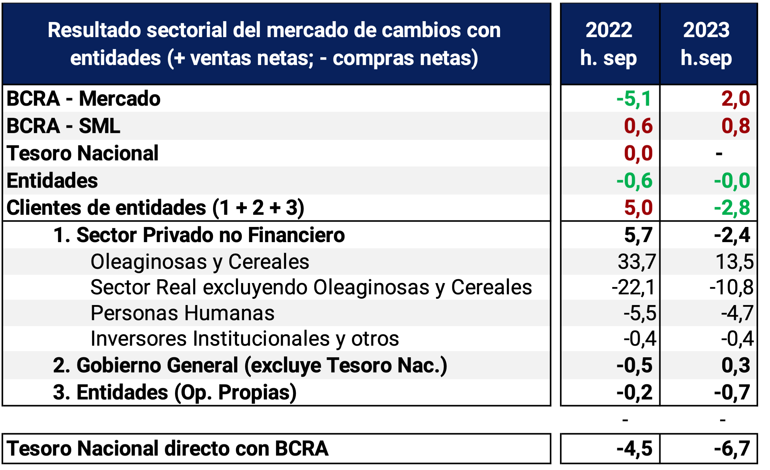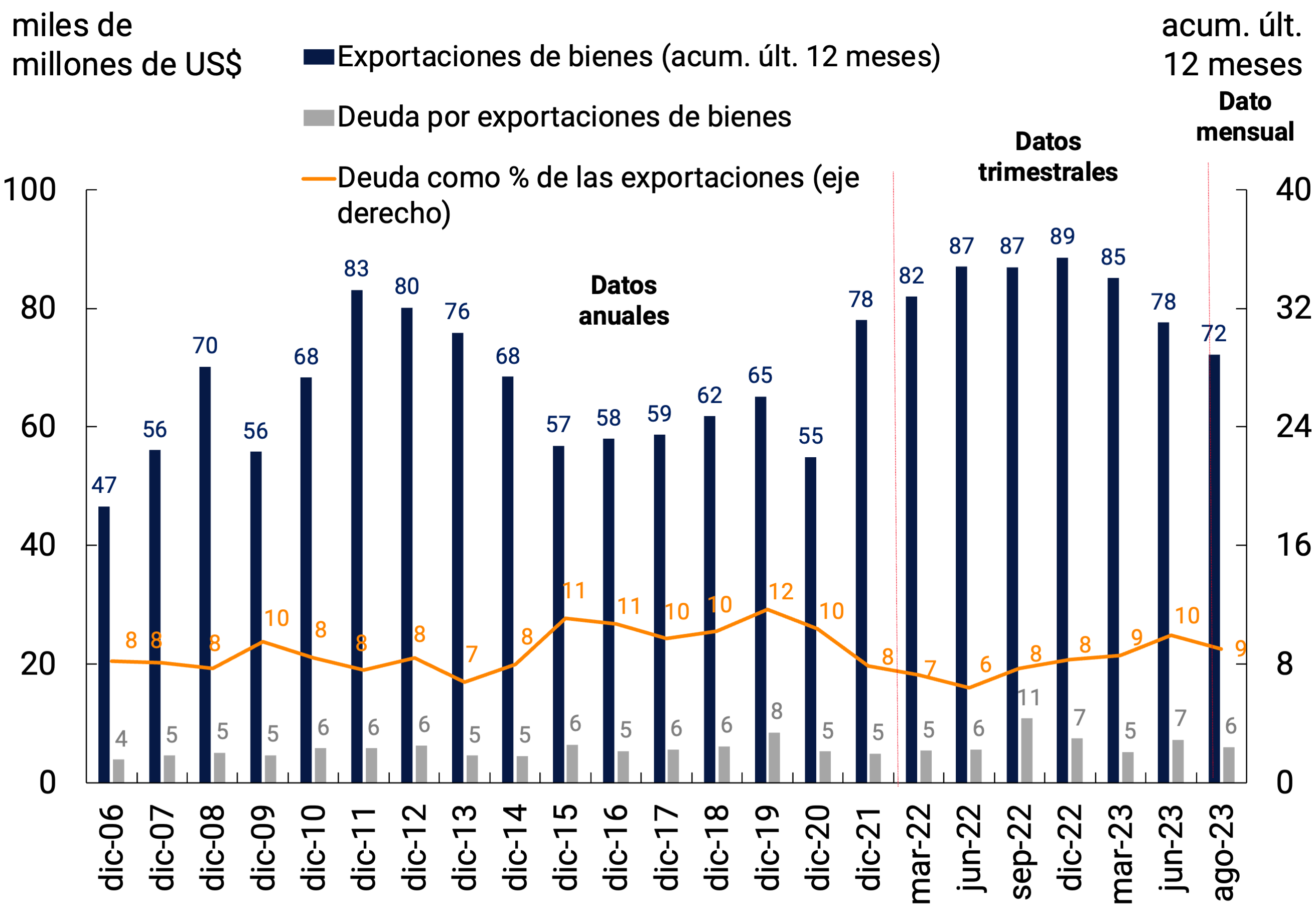 26 Dato estimado en base al stock de deuda al II-23 que surge del Relevamiento de Activos y Pasivos Externos y la deuda de exportaciones de bienes de julio, agosto y septiembre estimada a partir de la diferencia entre los cobros de exportaciones por el mercado de cambios y las exportaciones FOB.