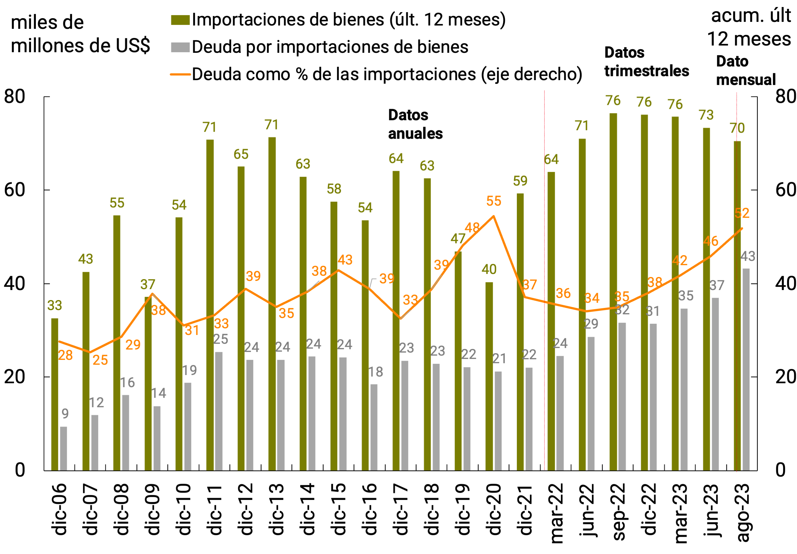 27 Dato estimado en base al stock de deuda al II-23 que surge del Relevamiento de Activos y Pasivos Externos y la deuda de importaciones de bienes de julio, agosto y septiembre estimada a partir de la diferencia entre las importaciones y los pagos de importaciones por el mercado de cambios.