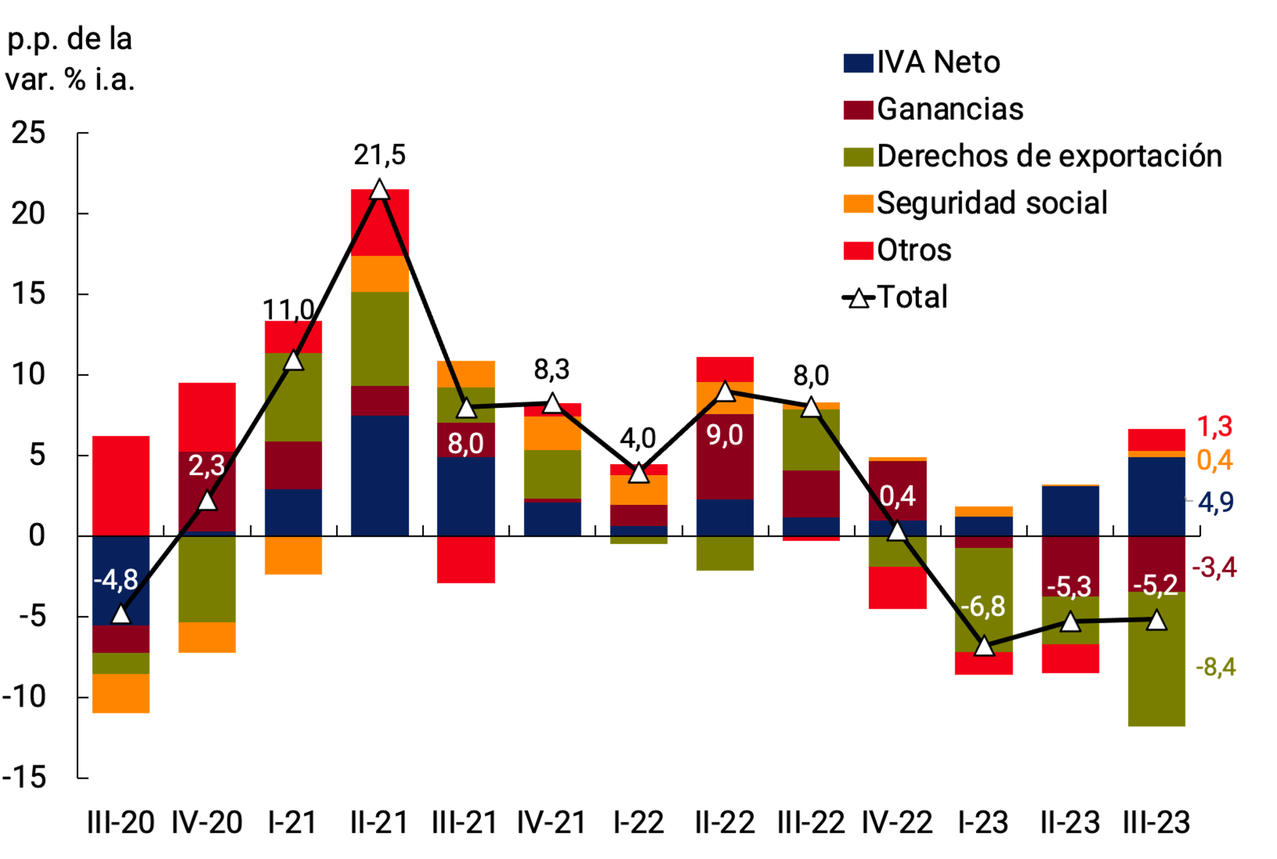 42 Mediante RG 5339/2023 del 29/3/23, la Administración Federal de Ingresos Públicos (AFIP) suspendió hasta el 31 de diciembre el régimen de percepción que permitía, a través de un certificado de exclusión, que grandes empresas importadoras quedaran exentas del pago del Impuesto al Valor Agregado (IVA) y del Impuesto a las Ganancias. Atenuaron la comparación interanual las mayores devoluciones de IVA que avanzaron 39,1% real en el semestre.