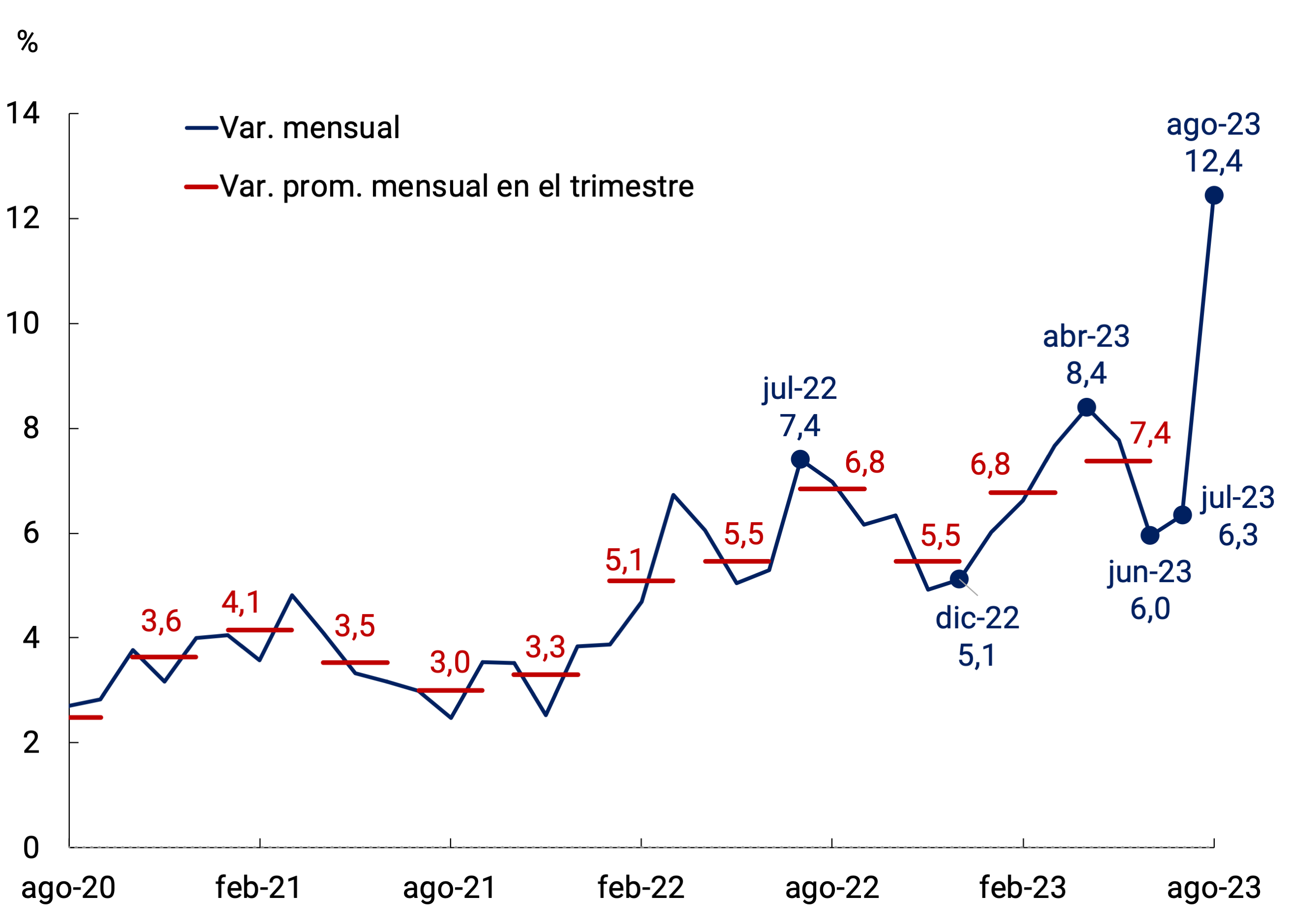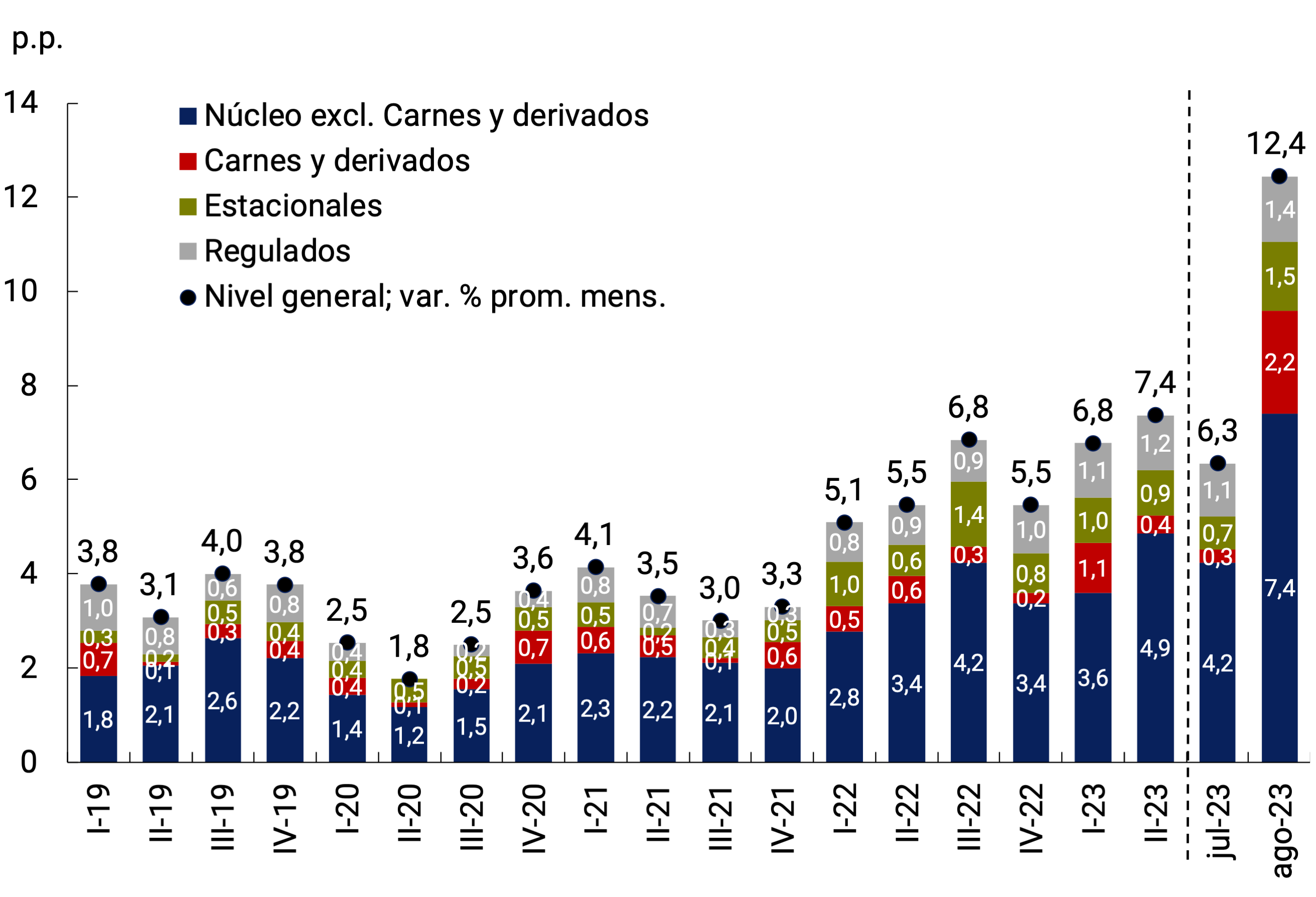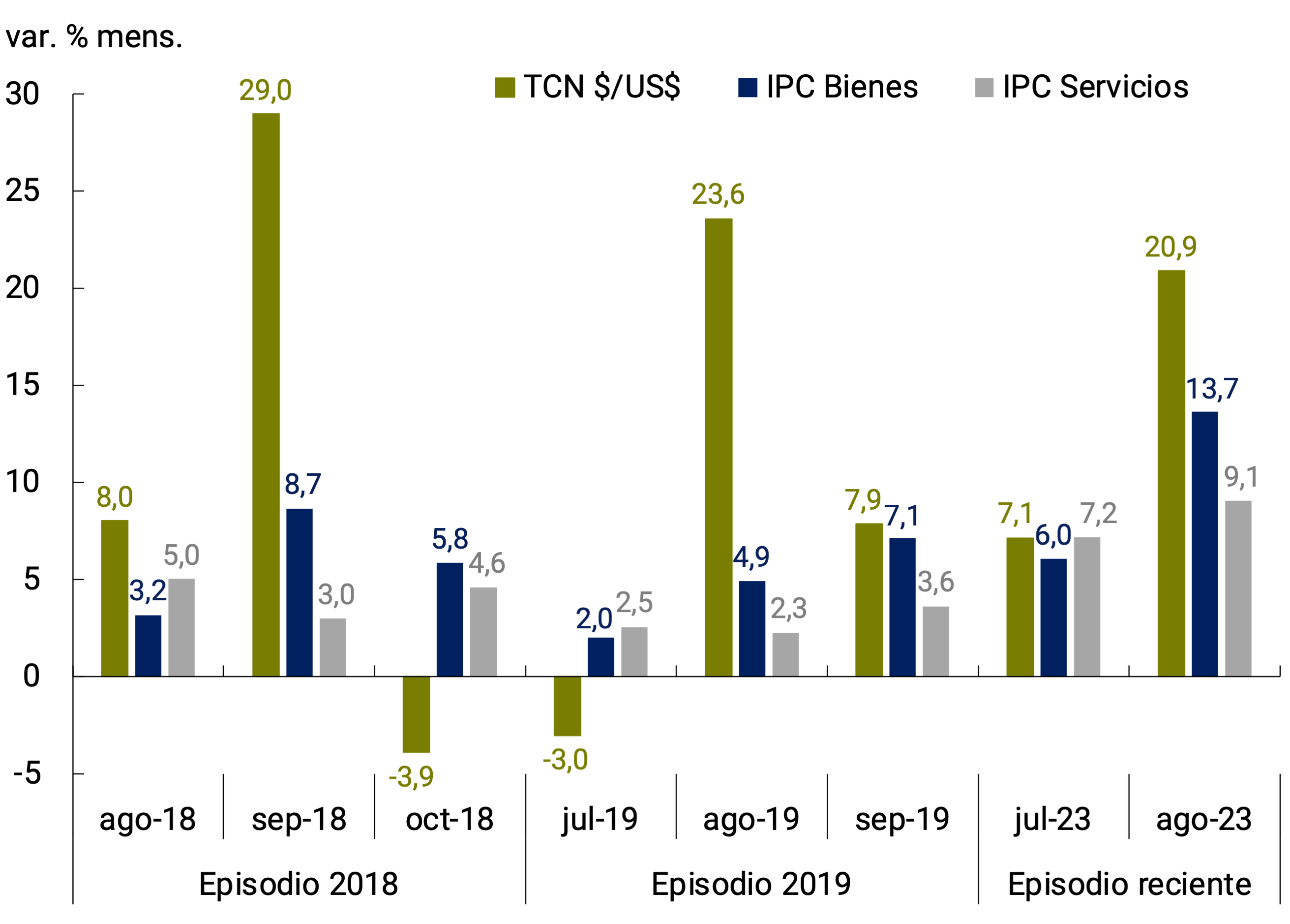 La inflación de los últimos meses reflejó el impacto de la mayor volatilidad financiera y de las diversas medidas orientadas a compensar las consecuencias de la sequía en los recursos fiscales y en las reservas internacionales, entre las que se destacó la recalibración del tipo de cambio oficial. El efecto en precios se habría concentrado fundamentalmente en agosto y septiembre, con una inflación promedio mensual en torno al 12%. Sin embargo, la inflación mostró una tendencia a la baja desde la primera semana de septiembre y se espera para octubre una marcada reducción en la tasa de inflación mensual. La desaceleración de la inflación de las últimas semanas respondió mayormente a una serie de medidas implementadas por el Gobierno Nacional y el BCRA.