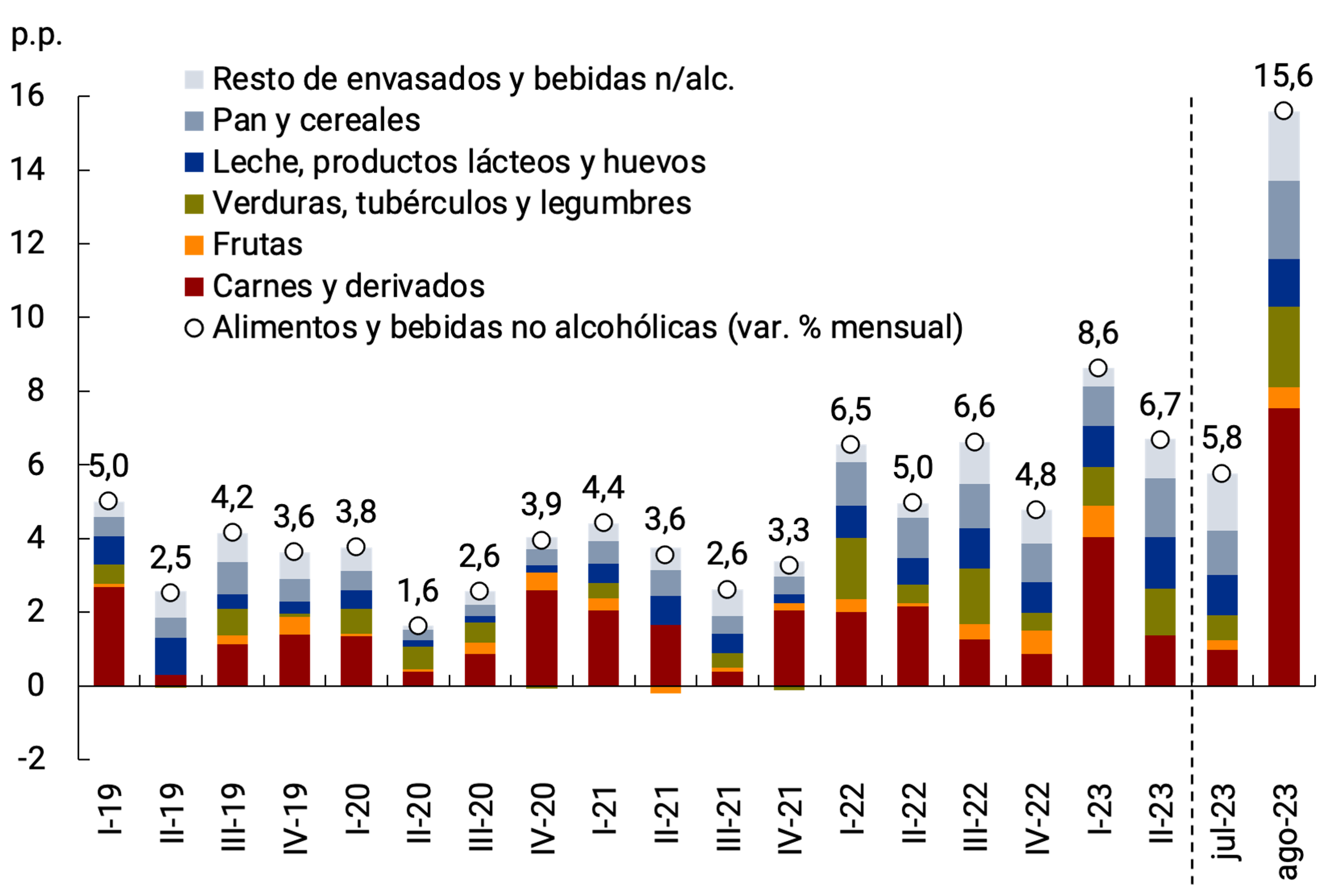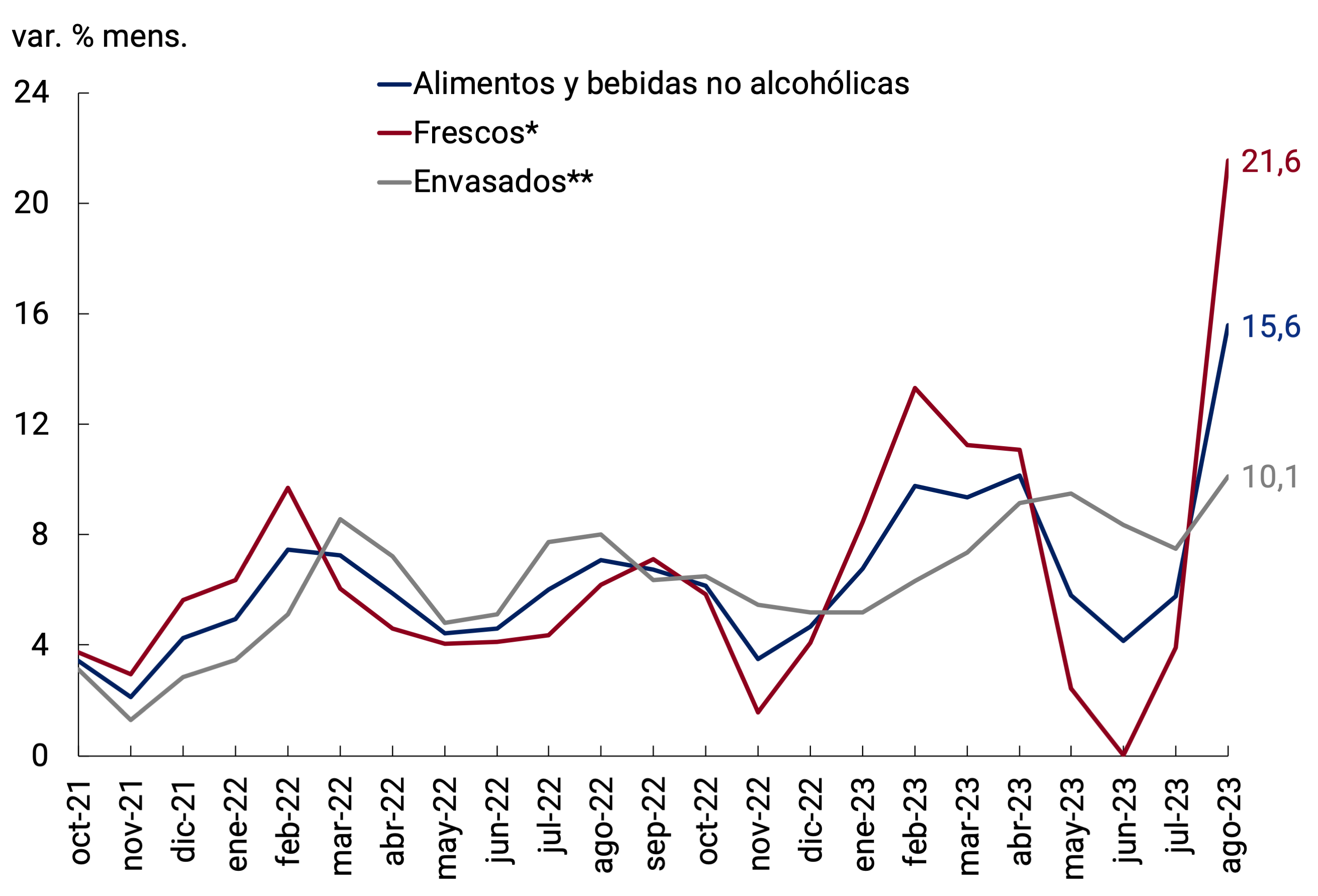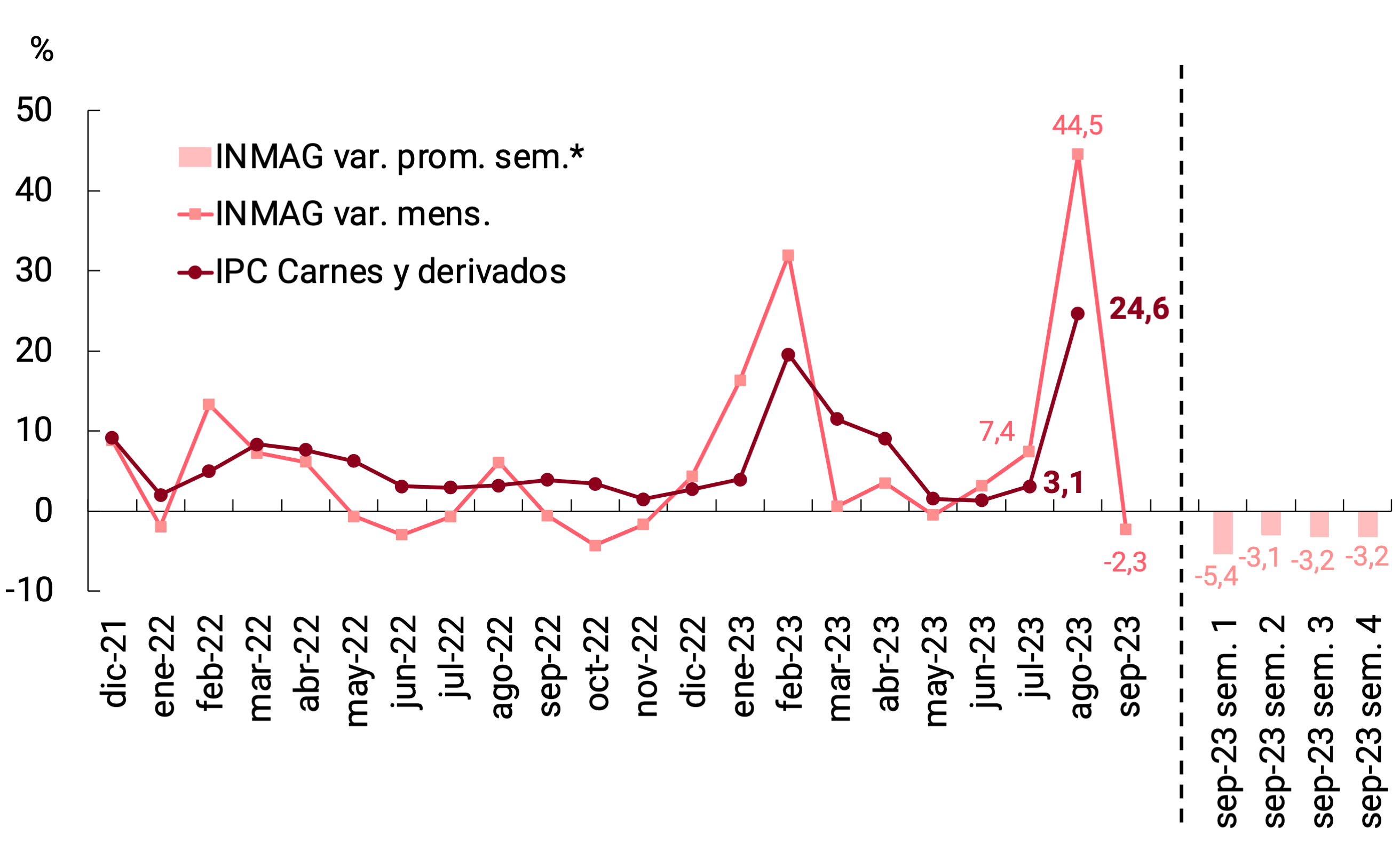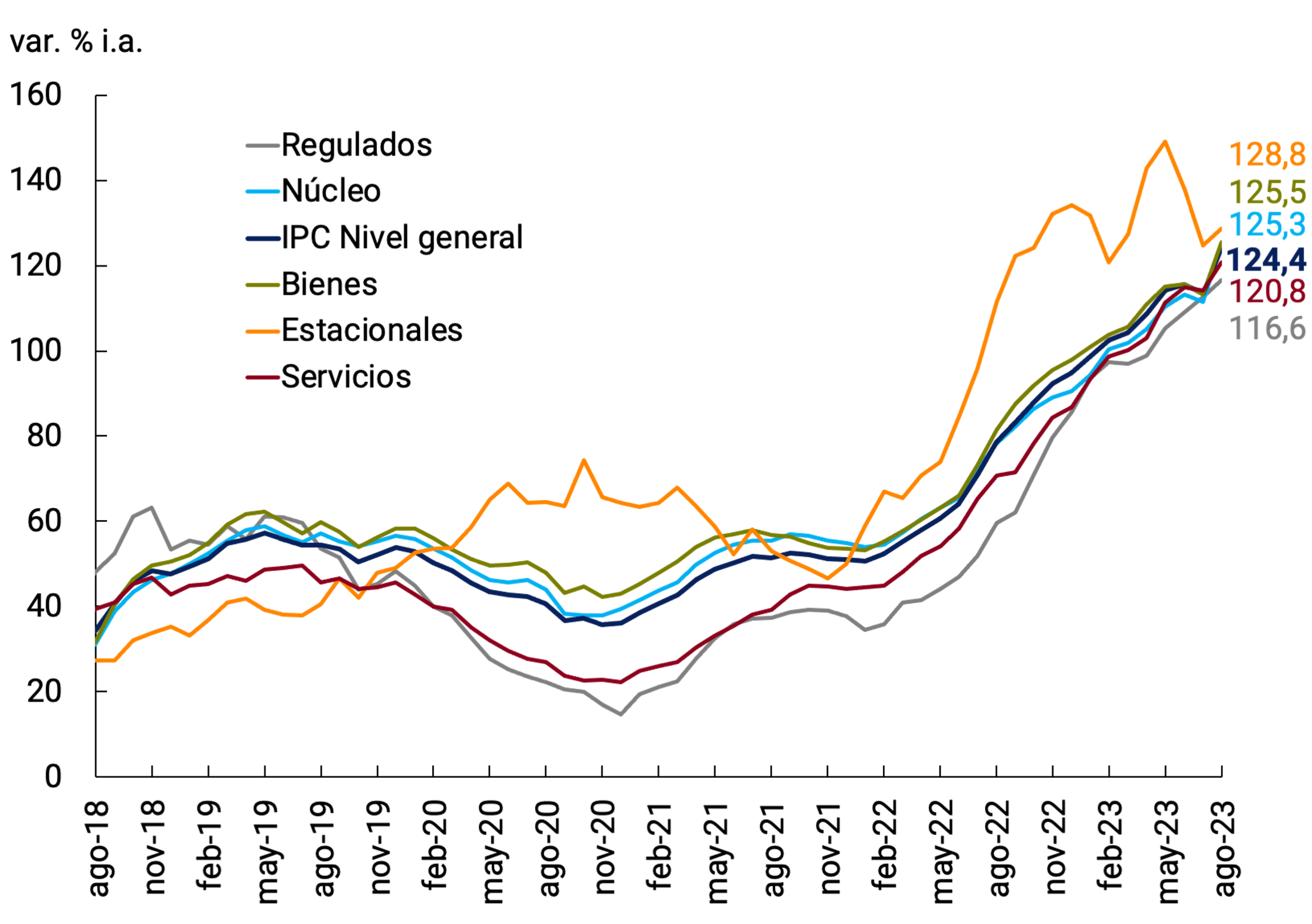 La inflación de los últimos meses reflejó el impacto de la mayor volatilidad financiera y de las diversas medidas orientadas a compensar las consecuencias de la sequía en los recursos fiscales y en las reservas internacionales, entre las que se destacó la recalibración del tipo de cambio oficial. El efecto en precios se habría concentrado fundamentalmente en agosto y septiembre, con una inflación promedio mensual en torno al 12%. Sin embargo, la inflación mostró una tendencia a la baja desde la primera semana de septiembre y se espera para octubre una marcada reducción en la tasa de inflación mensual. La desaceleración de la inflación de las últimas semanas respondió mayormente a una serie de medidas implementadas por el Gobierno Nacional y el BCRA.
