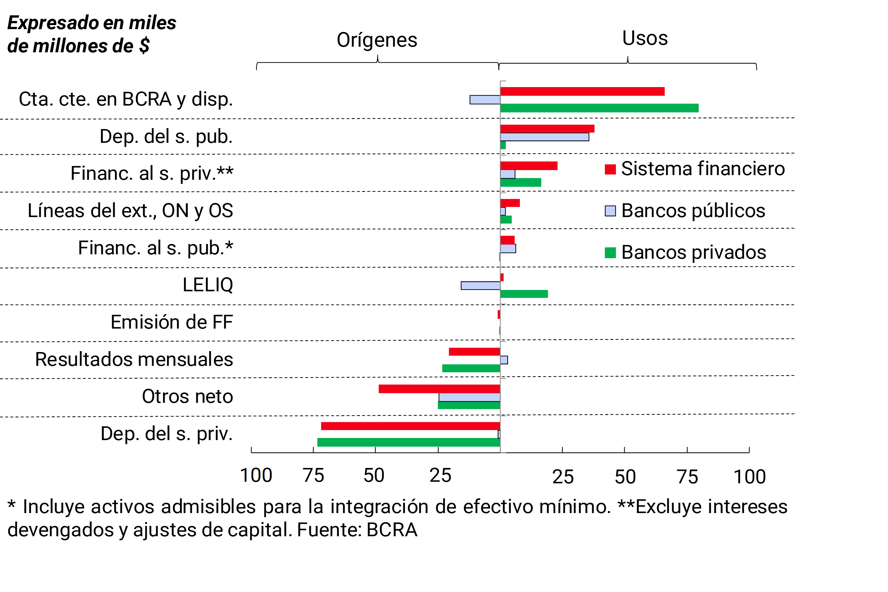 En base a la estimación del flujo de fondos mensual para el sistema financiero,1 el incremento nominal de los depósitos del sector privado fue la fuente de recursos más relevante (ver Gráfico 1). Por su parte, la principal aplicación de estos fondos fue el incremento del saldo de las cuentas corrientes que los bancos tienen en el BCRA. En menor magnitud, en abril las ganancias devengadas fueron otro origen de fondos, mientras que la reducción de los depósitos del sector público y el aumento nominal del crédito al sector privado fueron otras aplicaciones de recursos relevantes. La mayor parte de los orígenes y usos de fondos comentados fueron explicados por los bancos privados, con excepción de la caída de los depósitos del sector público (verificada principalmente en bancos públicos, compensada con la reducción de activos líquidos).