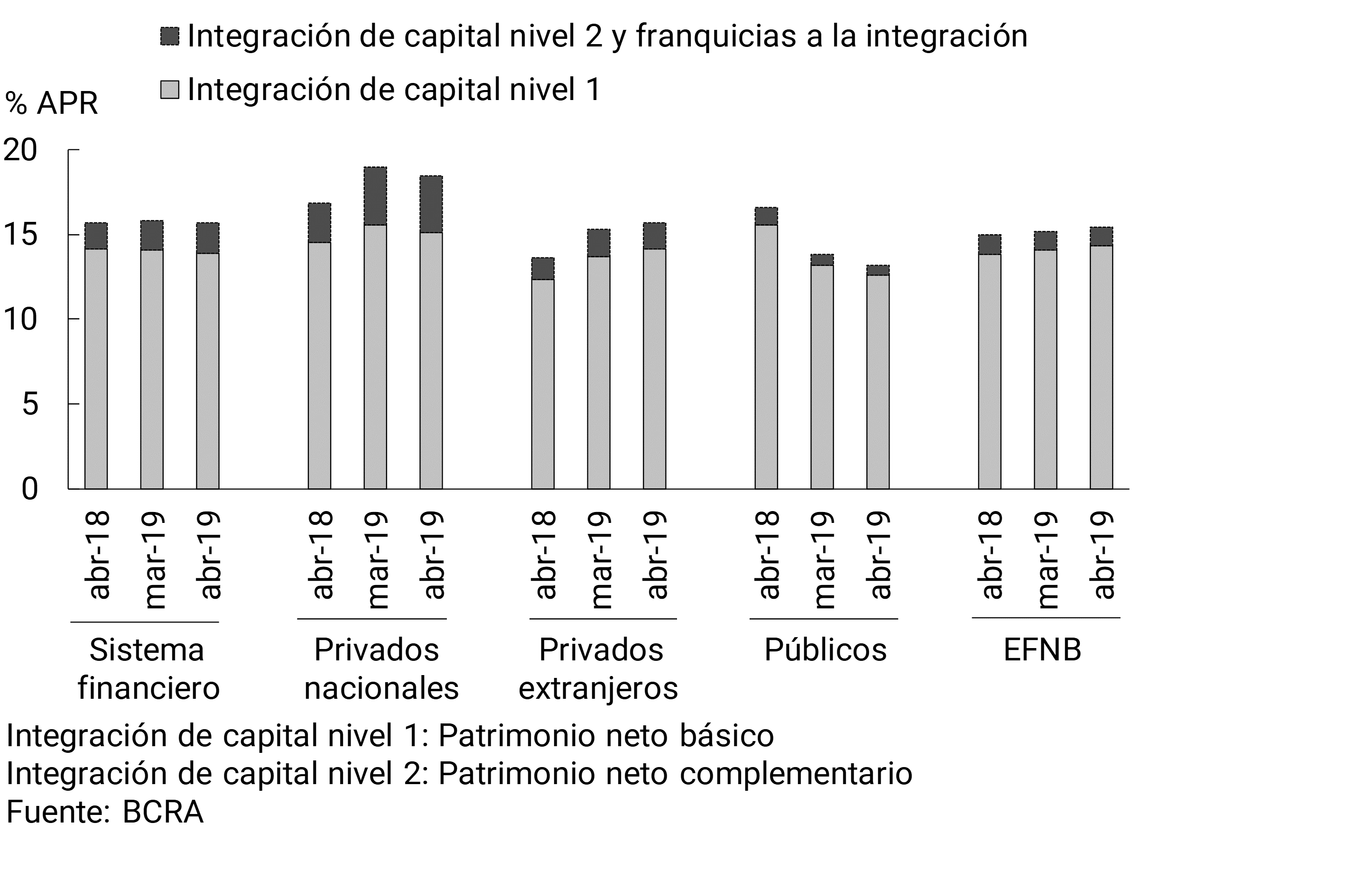 En abril los indicadores de solvencia del sistema financiero agregado no presentaron cambios significativos, manteniéndose en un rango de valores elevados. En el mes la integración de capital totalizó 15,7% de los activos ponderados por riesgo (APR), ligeramente menor que en marzo y sin modificaciones relevantes en una comparación interanual (ver Gráfico 10). Este nivel de integración siguió superando holgadamente a la exigencia mínima normativa de capital, representando 181% de esta última. Casi el 90% de la integración total continuó siendo explicada por el capital de Nivel 1.