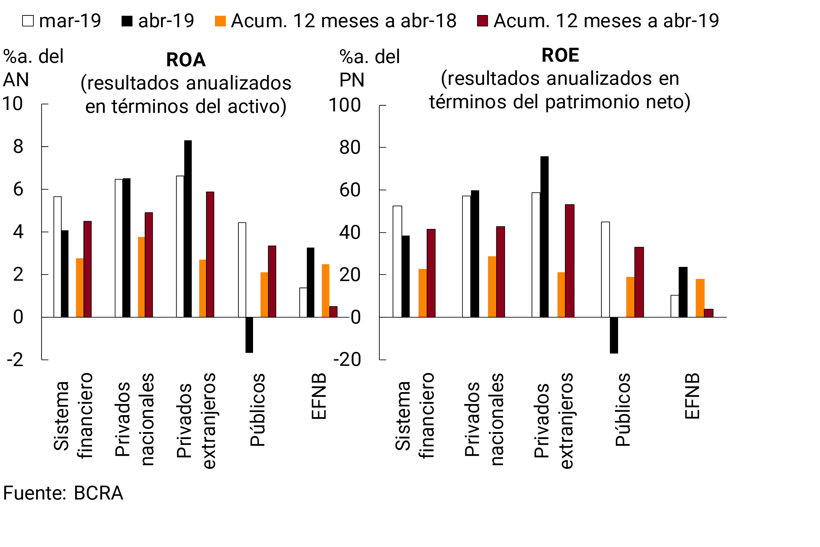 • En abril las ganancias nominales devengadas por el sector representaron 4,1%a. del activo —ROA— y 38,6%a. del patrimonio neto —ROE—. En el acumulado de 12 meses el ROA fue 4,5% y el ROE 41,4%.