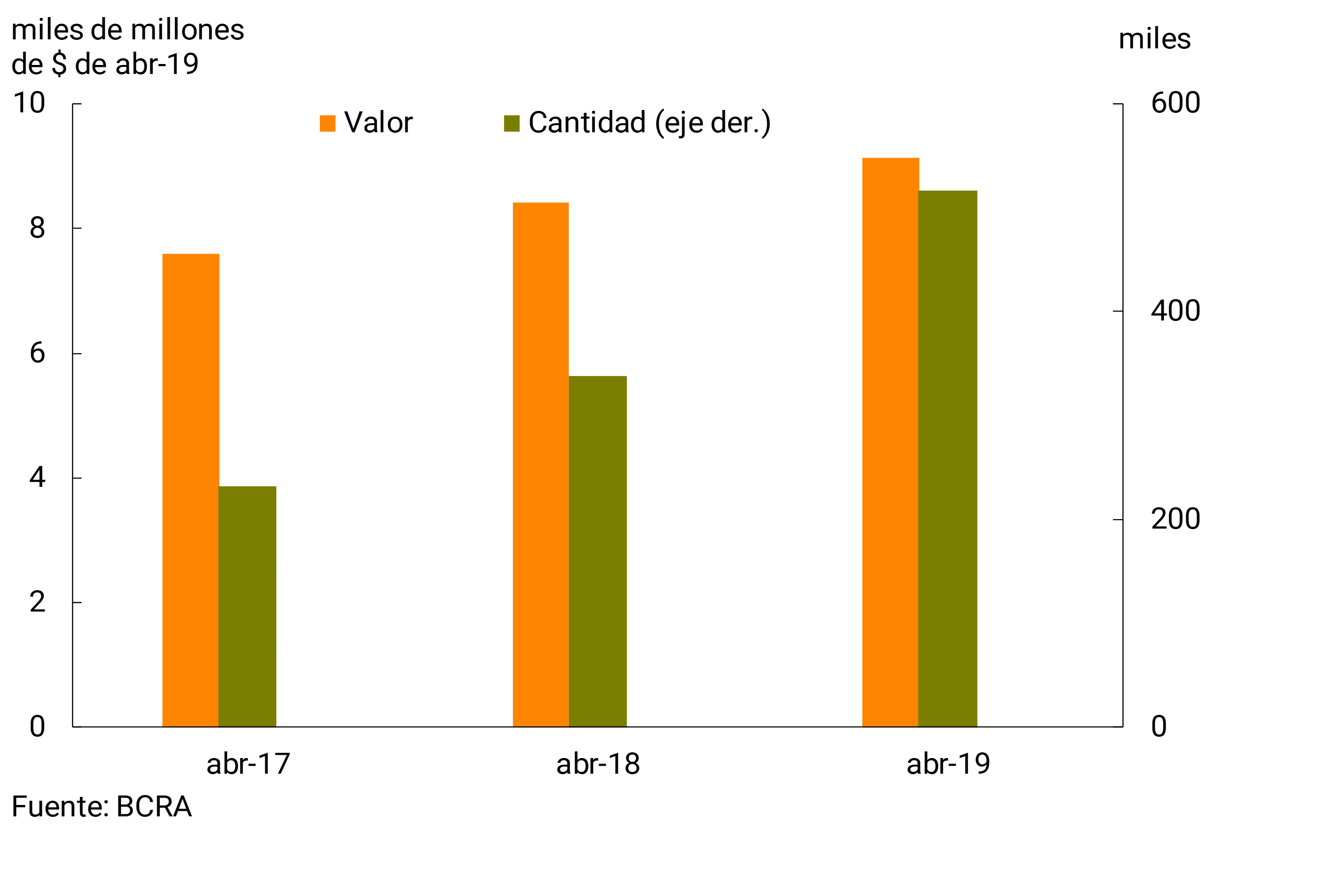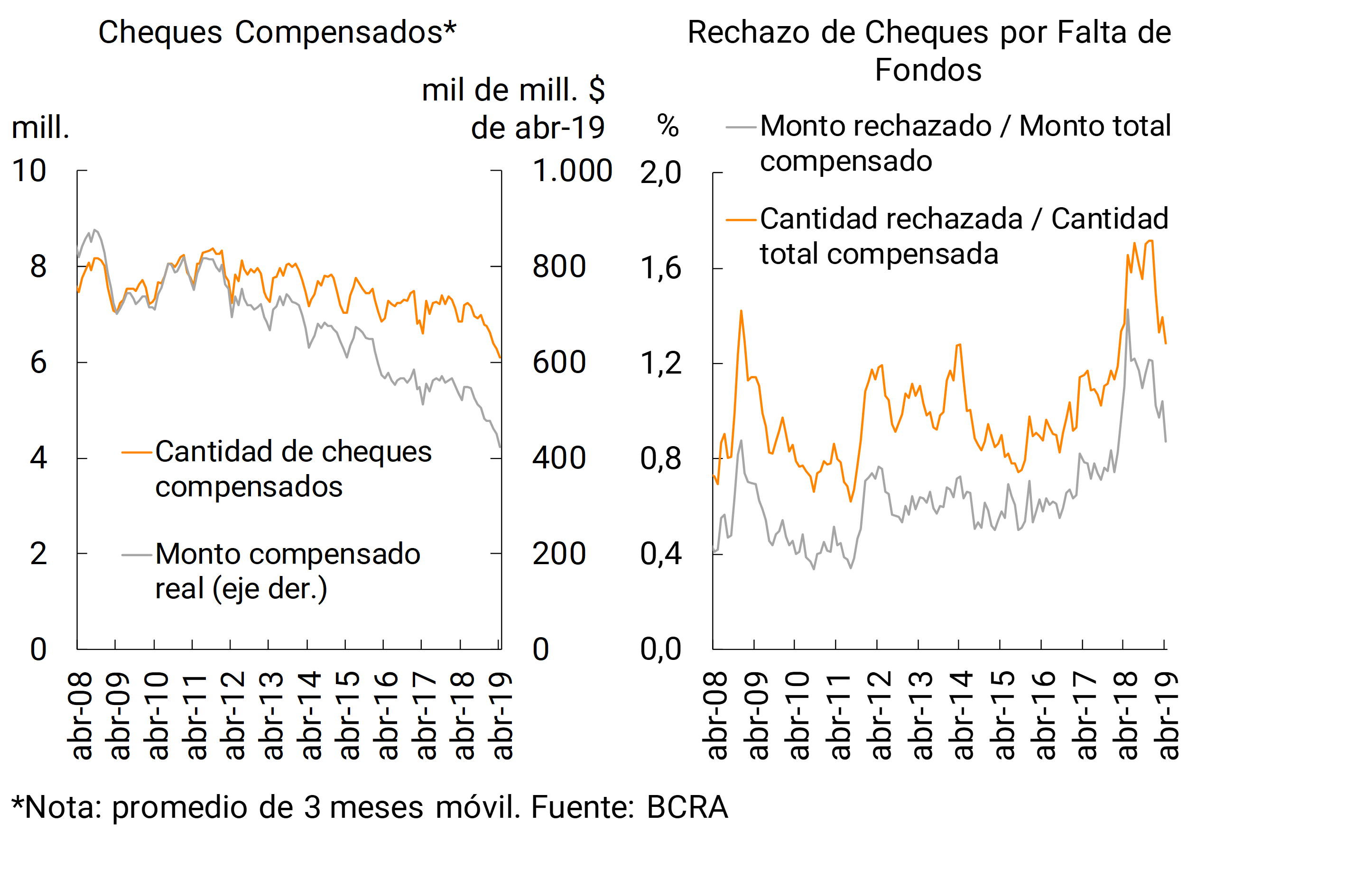 • En relación a las operaciones del Sistema Nacional de Pago, en abril el monto real de transferencias electrónicas inmediatas aumentó respecto al mes pasado. En este contexto, los cheques compensados —tanto en cantidades como en valores reales— registraron una nueva caída. El rechazo de cheques por falta fondos en términos del total compensado disminuyó en abril, retornando así a los valores observados un año atrás.