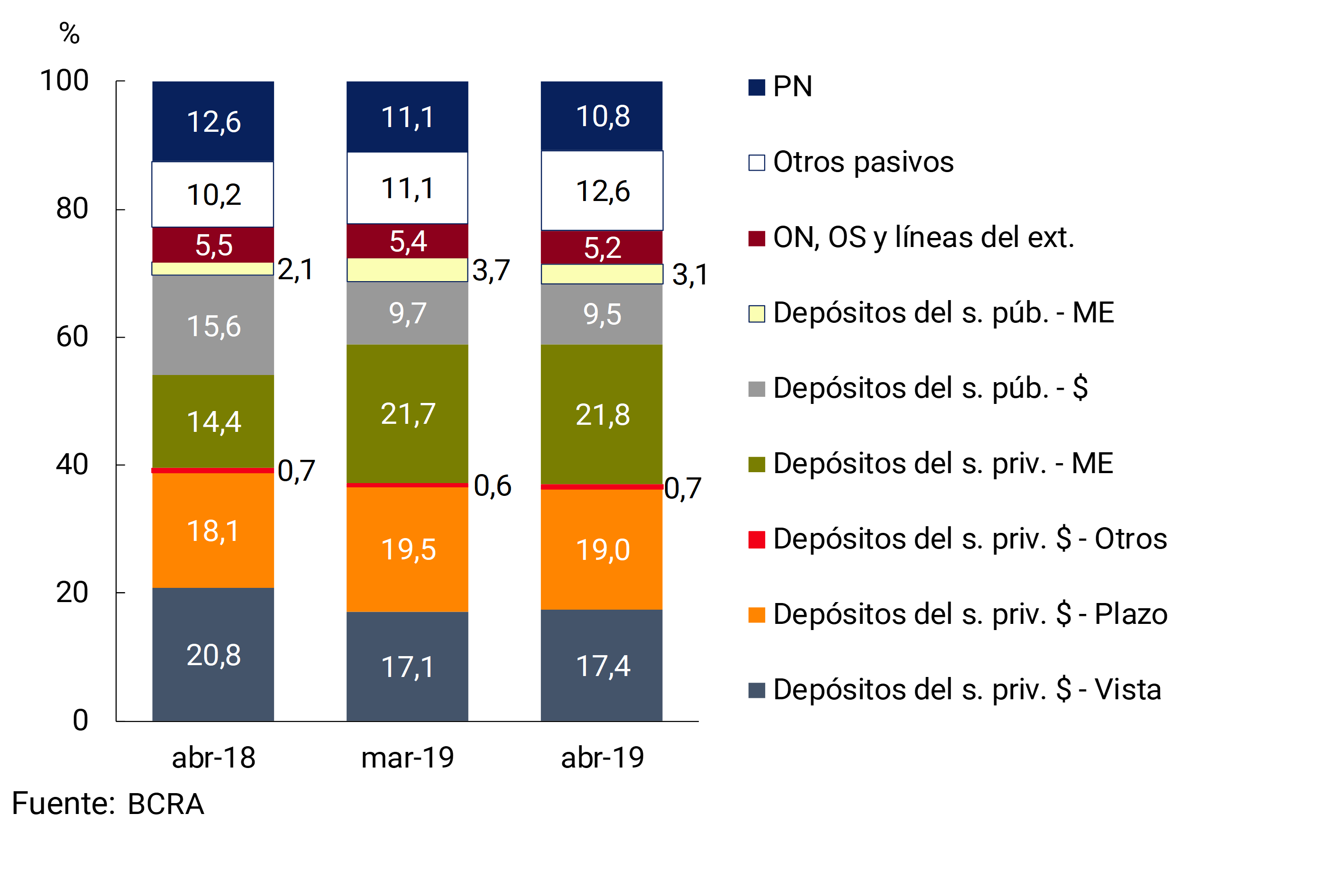 • Los depósitos en pesos del sector privado cayeron 1,8% en términos reales en abril (+1,5% nominal). Por su parte, los depósitos en moneda extranjera del sector privado crecieron 1,4% en el mes (en moneda de origen). La participación de los depósitos totales del sector privado en el fondeo total —pasivo más patrimonio neto— del sistema financiero se ubicó en 58,9% en abril (sin cambios significativos respecto a marzo y +4,9 p.p.i.a.).