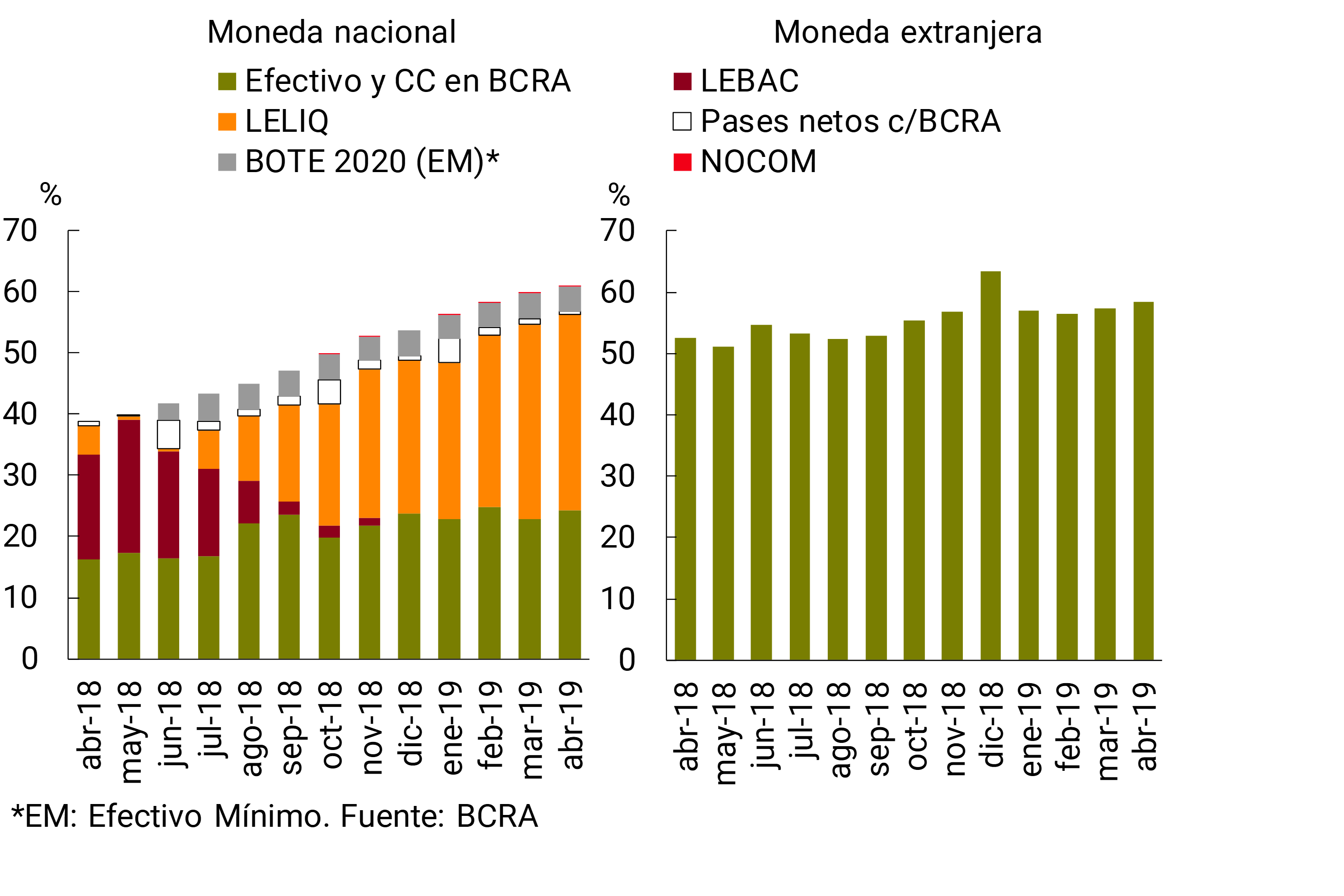 Los indicadores de liquidez del sistema financiero volvieron a aumentar en abril. El ratio amplio de liquidez2 se ubicó en 60% de los depósitos totales en el mes (60,8% para las partidas en pesos), 1,1 p.p. por encima del nivel registrado en marzo (similar valor para el segmento en moneda nacional, ver Gráfico 5). El aumento mensual de la liquidez estuvo explicado fundamentalmente por las mayores tenencias de efectivo y saldos en cuentas corrientes de las entidades en el BCRA. En una comparación interanual, el indicador amplio de liquidez creció 18 p.p. de los depósitos (+22 p.p. para el ratio en pesos). Los activos líquidos en moneda extranjera totalizaron 58,4% de los depósitos en igual denominación en el período (+1 p.p. y +5,8 p.p. respecto al mes pasado y a abril de 2018, respectivamente).