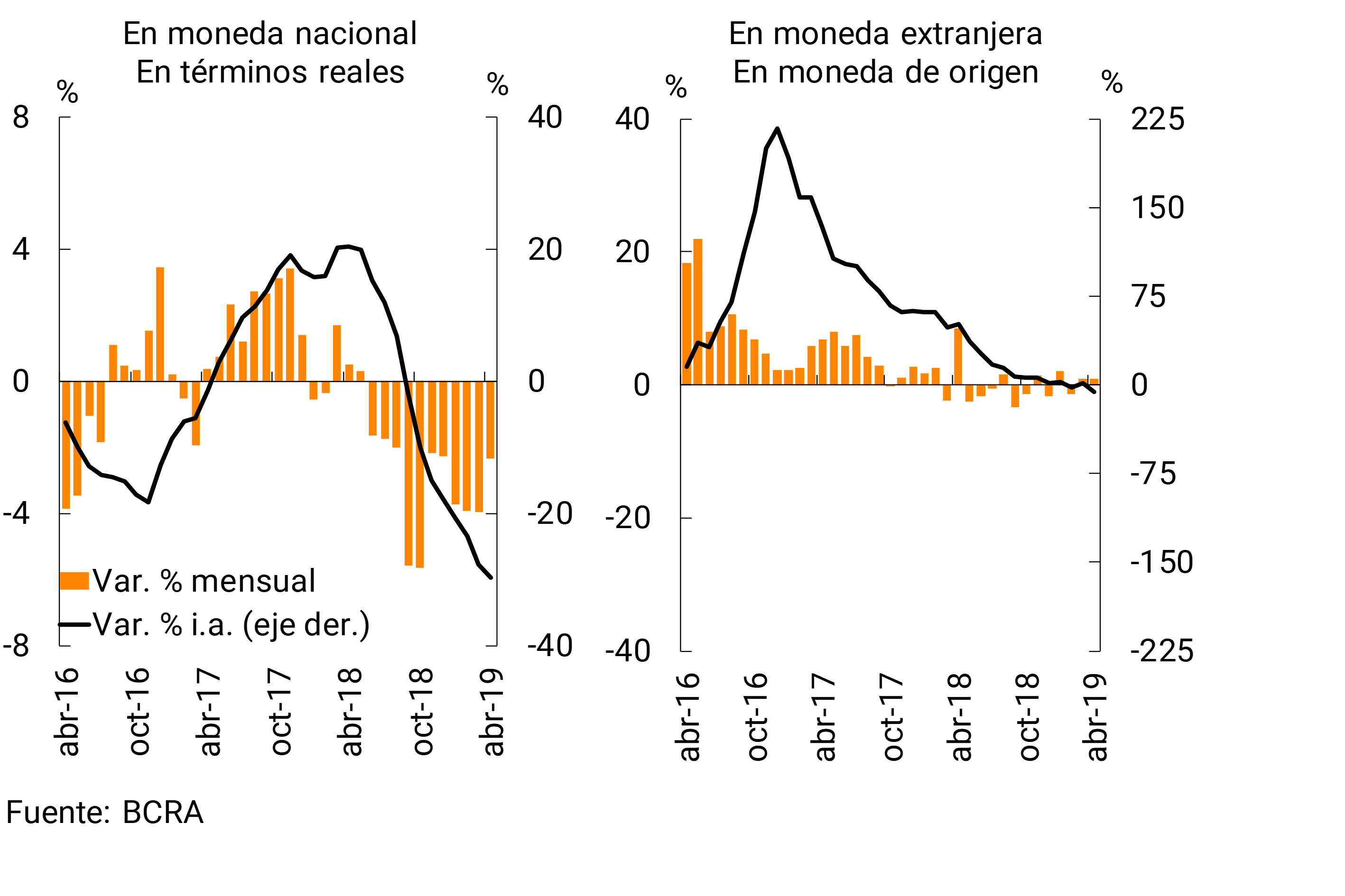 En los últimos 12 meses a abril, los depósitos del sector privado en moneda nacional disminuyeron 4,9% real, con un incremento en aquellos a plazo (+6,7% i.a. real) que compensó parcialmente la reducción en los saldos a la vista (-14,9% i.a. real). Los depósitos del sector privado en moneda extranjera se expandieron 13,1% en moneda de origen respecto a abril de 2018. En este marco, el saldo de depósitos totales creció 2,1% i.a. en términos reales.
