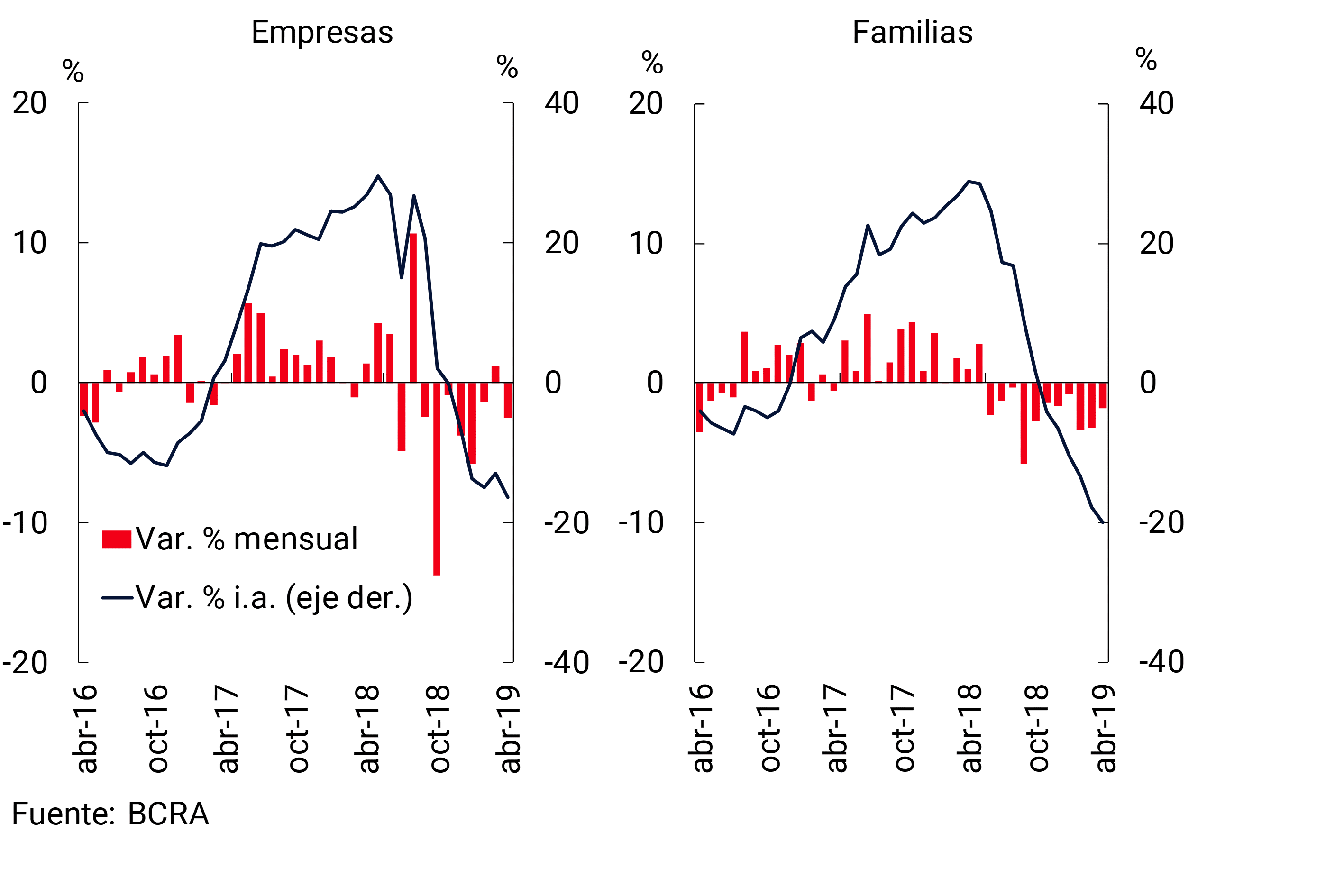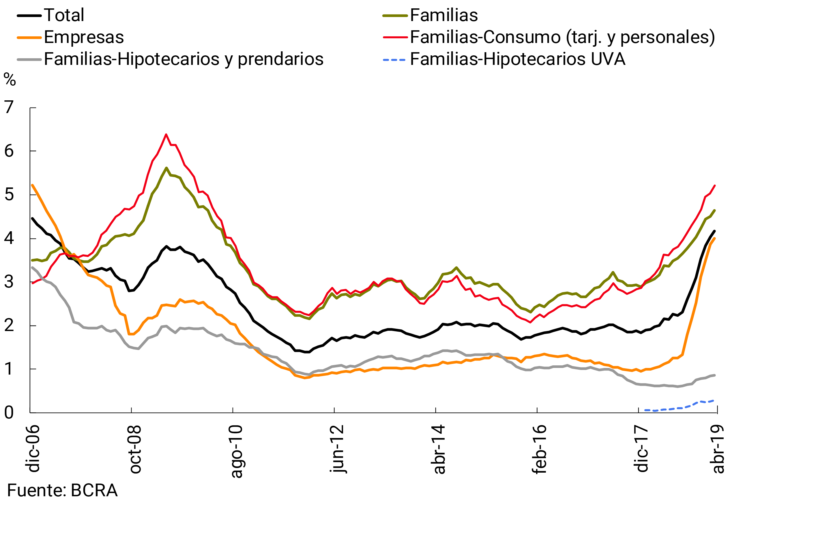 4 Información extraída de la Central de Deudores (moneda nacional como extranjera). No se incluyen los créditos a residentes en el exterior. Se consideran los ajustes de capital e intereses devengados. Las financiaciones a empresas se definen aquí como aquellas otorgadas a personas jurídicas y el financiamiento comercial otorgado a individuos. Por su parte, se considera préstamos a familias a aquellos otorgados a individuos, excepto que tengan destino comercial.