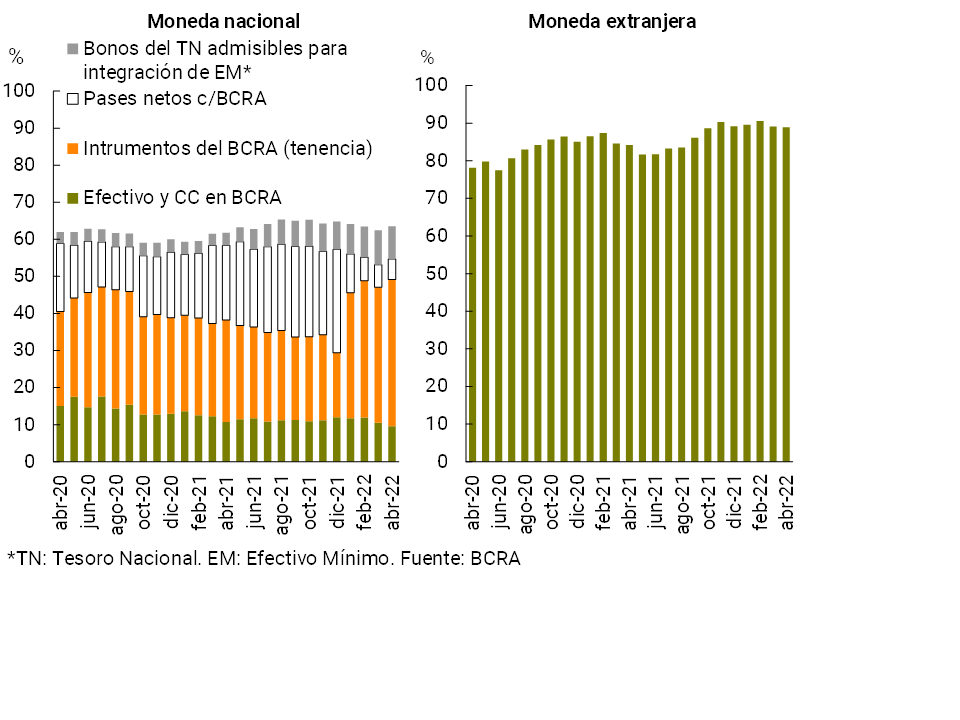 17 En el mes operaron ciertos cambios normativos en materia de efectivo mínimo. En particular, en abril se estableció que la reducción de la exigencia de efectivo mínimo en pesos sea equivalente a 34% (antes 30%) del saldo de financiaciones de proyectos de inversión en el marco de la “Línea de financiamiento para la inversión productiva de MiPyME” (ver Comunicación “A 7491”).