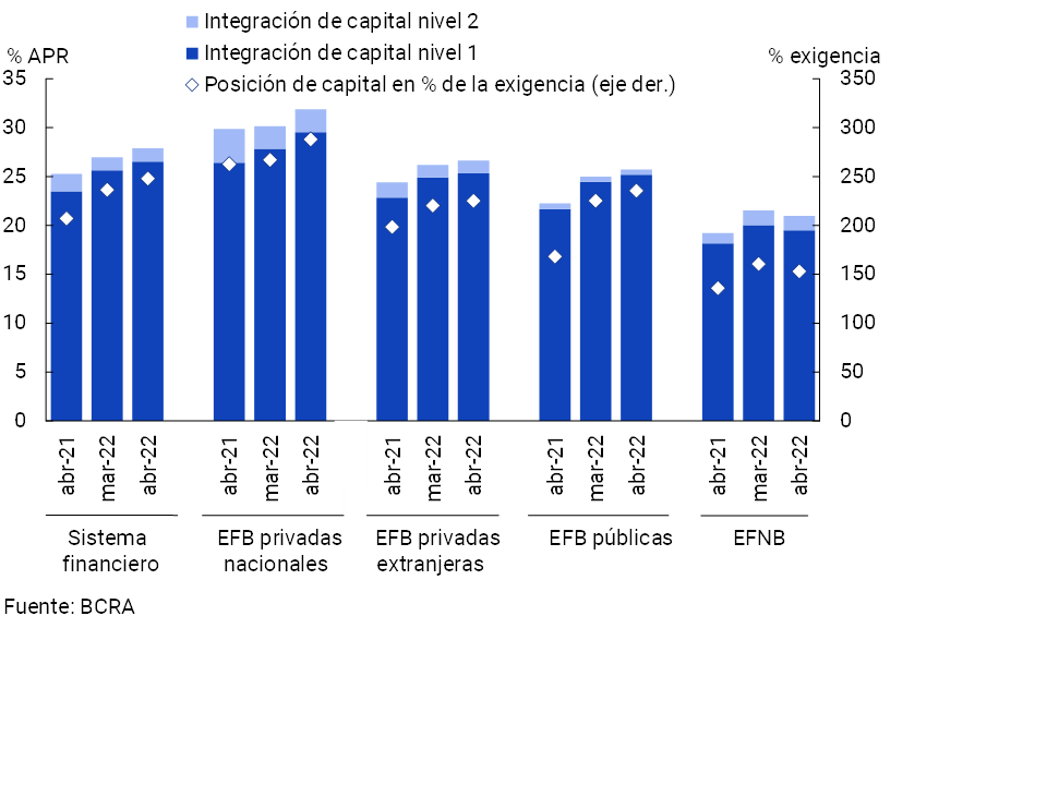 • Los habituales indicadores de solvencia para el sistema financiero continuaron mostrando valores elevados (y crecientes) en abril, tanto al considerar una perspectiva histórica local como en relación a lo observado actualmente a nivel internacional. La integración de capital regulatorio (RPC) totalizó 27,9% de los activos ponderados por riesgo (APR) para el agregado del sector (+0,9 p.p. en el mes y +2,6 p.p. i.a.), traduciéndose en una posición excedente de capital regulatorio (equivalente a 248% de la exigencia mínima en el período; aumento de 40,8 p.p. i.a.). El incremento en los indicadores de solvencia en los últimos años se materializó en un contexto en donde se reforzaron las políticas macroprudenciales destinadas a preservar la solidez sistémica. En particular, en 2020 y 2021 se suspendió la posibilidad de distribuir dividendos para las entidades financieras, situación que comenzó de forma paulatina a normalizarse en 2022, acompañando el proceso de recuperación de la actividad económica después del shock de la pandemia de COVID-19.