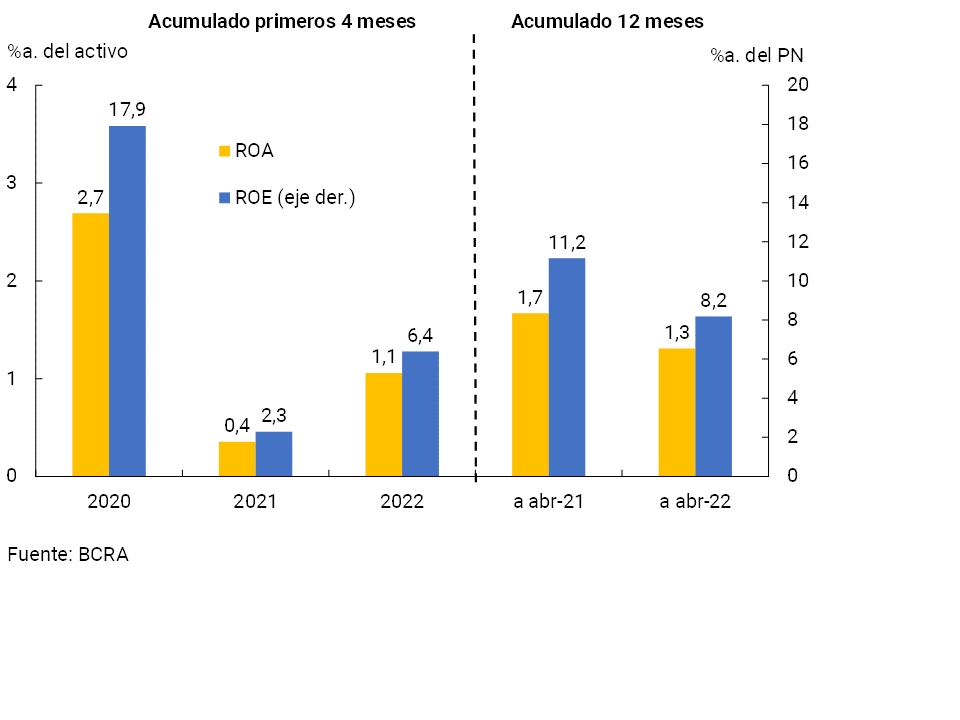 Respecto a la generación interna de capital del sector, en lo que va de 2022 los indicadores de rentabilidad del conjunto de entidades se ubicaron en niveles positivos (ver Gráfico 16). En el primer cuatrimestre del año los resultados totales integrales en moneda homogénea para el sistema financiero agregado totalizaron 1,1% anualizado (a.) del activo (ROA) y 6,4%a. del patrimonio neto (ROE), superando a los registros observados en el mismo periodo de 2021, por debajo de los verificados al inicio de 2020.