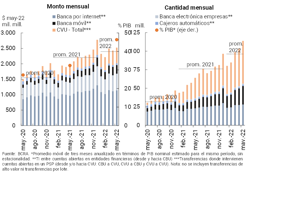 22 Respecto a las transferencias entre cuentas abiertas en entidades financieras vía CBU, en los últimos doce meses se destacó el incremento relativo en las transacciones por medio de la Banca Móvil (+139,5% i.a. en cantidades y +73,9% i.a. en montos reales). En particular, dentro de las mismas fue aún más marcado el desempeño de aquellas operaciones cursadas por medio de las billeteras digitales vinculadas a la banca pública. En abril (última información disponible), en una comparación interanual, las operaciones mediante BNA+ se incrementaron 486,8% i.a. en cantidades y 372,3% en montos reales, mientras que Cuenta DNI incrementó sus operaciones en un 215,8% i.a. en cantidades y en 145,3% i.a. en montos reales. En este contexto, el BCRA continuó impulsando el desarrollo de billeteras digitales, las que podrán permitir que los clientes registren cuentas provistas por otras entidades financieras (para más información, ver “Nota de prensa de 19 de mayo de 2022”).