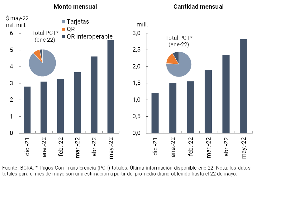 En mayo los pagos con transferencia (PCT) iniciados a través de códigos QR interoperables25 se incrementaron significativamente con respecto al mes anterior: 20,3% en cantidades y 21,3% real en montos, ver Gráfico 18. Desde el inicio del esquema pleno de interoperabilidad de QR (fines de noviembre de 2021), la cantidad acumulada a mayo de operaciones bajo esta modalidad alcanzó 12,5 millones, equivalentes a $25.408 millones a precios de mayo de 2022 (resultando un promedio de $2.023 por transacción).