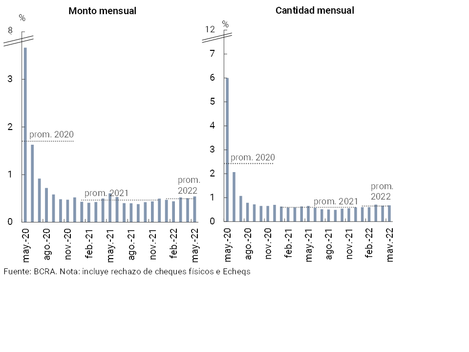 En mayo, el ratio de rechazo de cheques por falta de fondos en términos del total compensado27 se incrementó levemente respecto al mes anterior (hasta 0,7% en cantidades y 0,5% en montos, ver Gráfico 22), manteniéndose en un rango acotado de valores, similar al del promedio de 2021 y del comienzo de 2022.