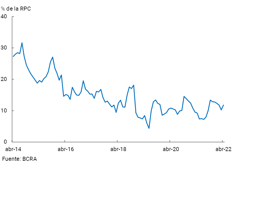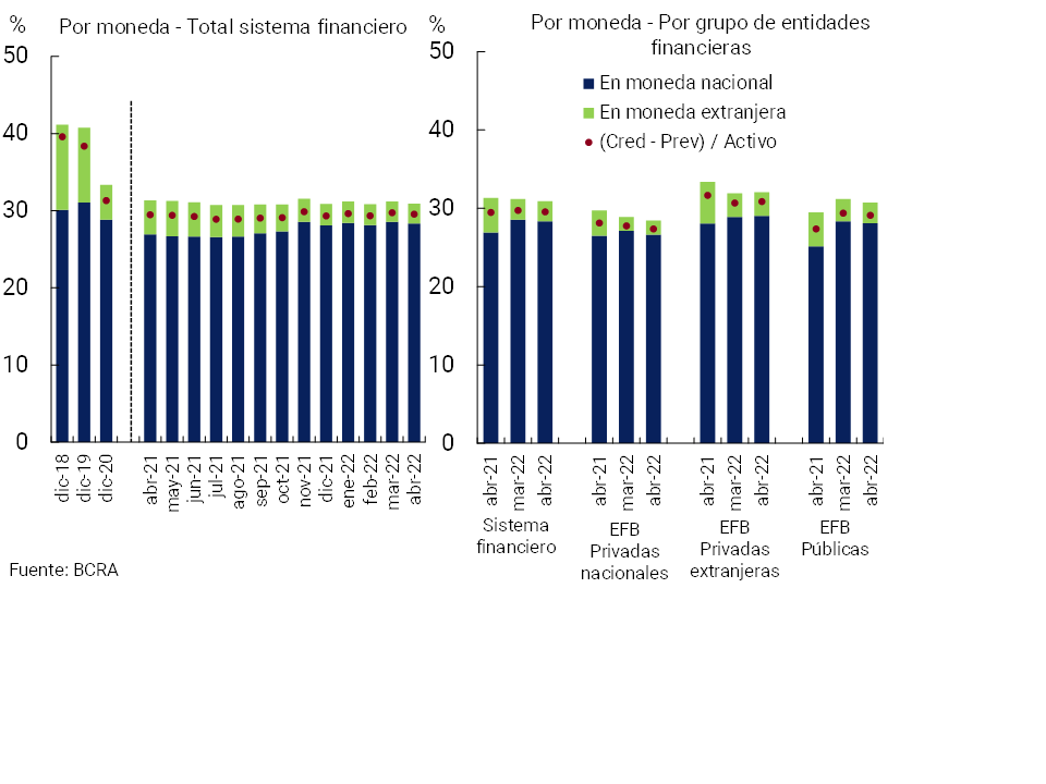 La exposición bruta del sistema financiero al sector privado (contemplando moneda nacional y extranjera) se mantuvo históricamente baja y descendente en abril 2022 (ver Gráfico 9), tanto en el segmento en pesos como en moneda extranjera. En este marco el saldo de crédito total al sector privado neto de previsiones para el agregado de entidades representó 29,6% del activo en abril.