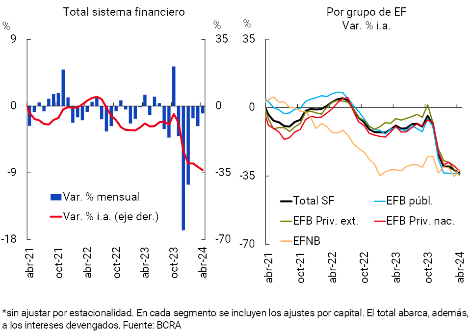 En abril los depósitos en moneda extranjera del sector privado crecieron nuevamente -en moneda de origen- (+2,3% mensual, ver Gráfico 2). En relación con el mismo período de 2023, el saldo se redujo 12,8% a nivel sistémico. Así, al considerar todas las monedas y sectores, los depósitos totales del sector se redujeron 24,7% i.a.