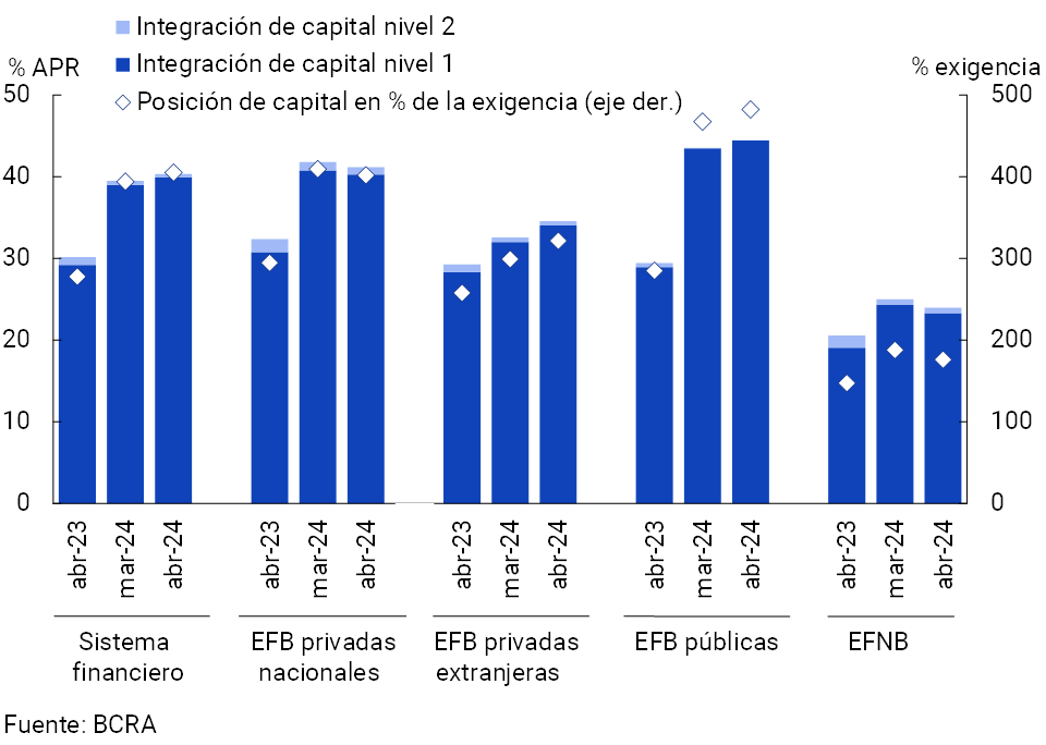 • La integración de capital regulatorio (RPC) se ubicó en 40,3% de los activos ponderados por riesgo (APR) para el conjunto de entidades en el mes (+0,9 p.p. mensual y +10,2 p.p. i.a.). En este marco, la posición normativa de capital —capital regulatorio neto del requisito normativo— conservó un importante nivel de holgura, alcanzando a 405% de la exigencia a nivel sistémico.