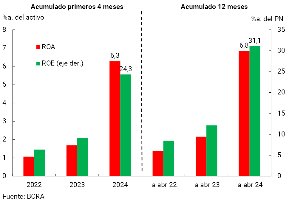 A nivel del sistema financiero agregado, el desempeño de los niveles de capital viene siendo impulsado mayormente por los resultados positivos obtenidos, en un marco en el que gradualmente se viene readecuando la normativa de distribución de utilidades10. En relación con la rentabilidad, en los últimos 12 meses el sistema financiero tuvo resultados totales integrales en moneda homogénea equivalentes a 6,8% del activo (ROA) y 31,1% del patrimonio neto (ROE) (ver Gráfico 11). La rentabilidad acumulada del sector aumentó en una comparación interanual, principalmente por un mayor margen financiero (aumento de las primas por pases, ajustes CER, diferencias de cotización y resultados por títulos valores, atemperado por mayores egresos por intereses), efecto compensado parcialmente por un incremento de las pérdidas por exposición a partidas monetarias y de los egresos impositivos, entre otros conceptos.