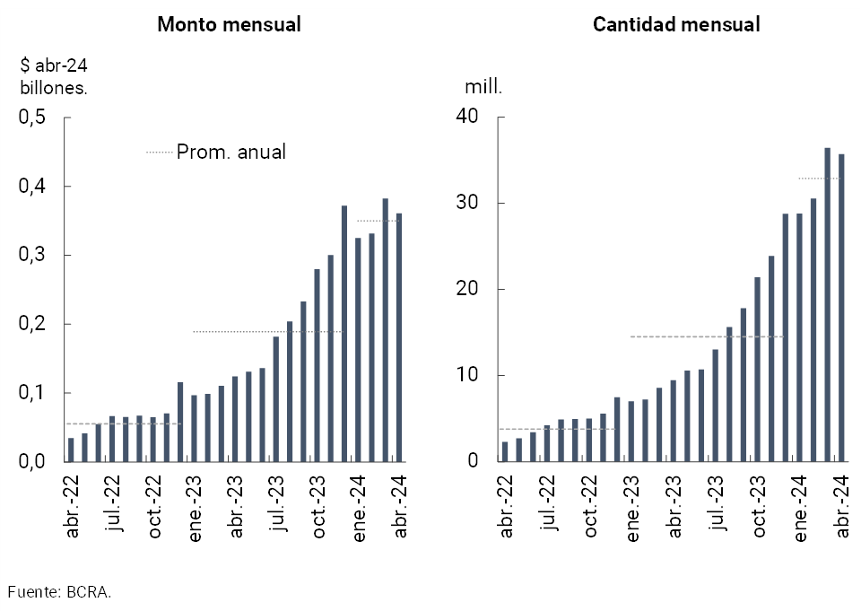 • En abril los principales medios de pago electrónico continuaron presentando un positivo desempeño. El monto de las transferencias inmediatas creció 6,4% real en el mes (+20,1% real i.a.) y el de los cheques electrónicos compensados (ECHEQs) 24,5% real (+10% real i.a.).
