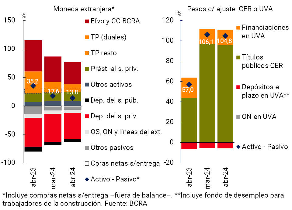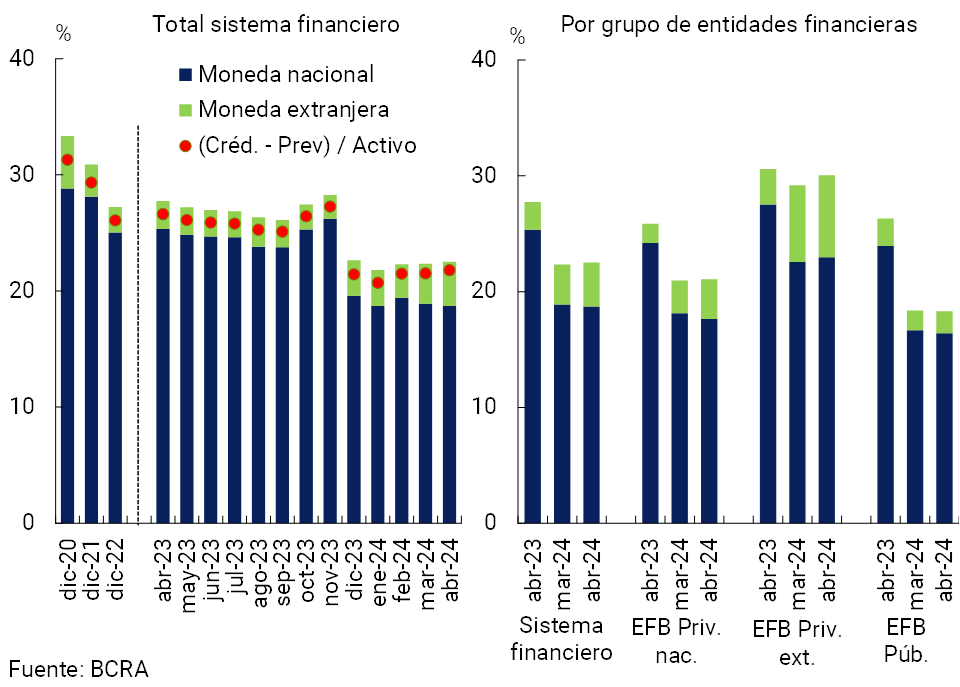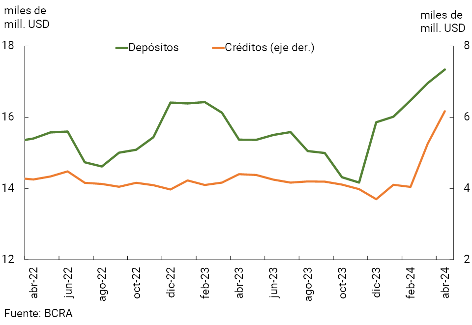 • La actividad de intermediación del sistema financiero con el sector privado en moneda extranjera continuó creciendo en abril, en tanto que se acentúo la desaceleración en el ritmo de reducción mensual del segmento en pesos. En un contexto operativo donde el tamaño de la hoja de balance del sistema financiero no presentó cambios de magnitud, en abril el conjunto de entidades continuó presentando holgados niveles de liquidez y solvencia.