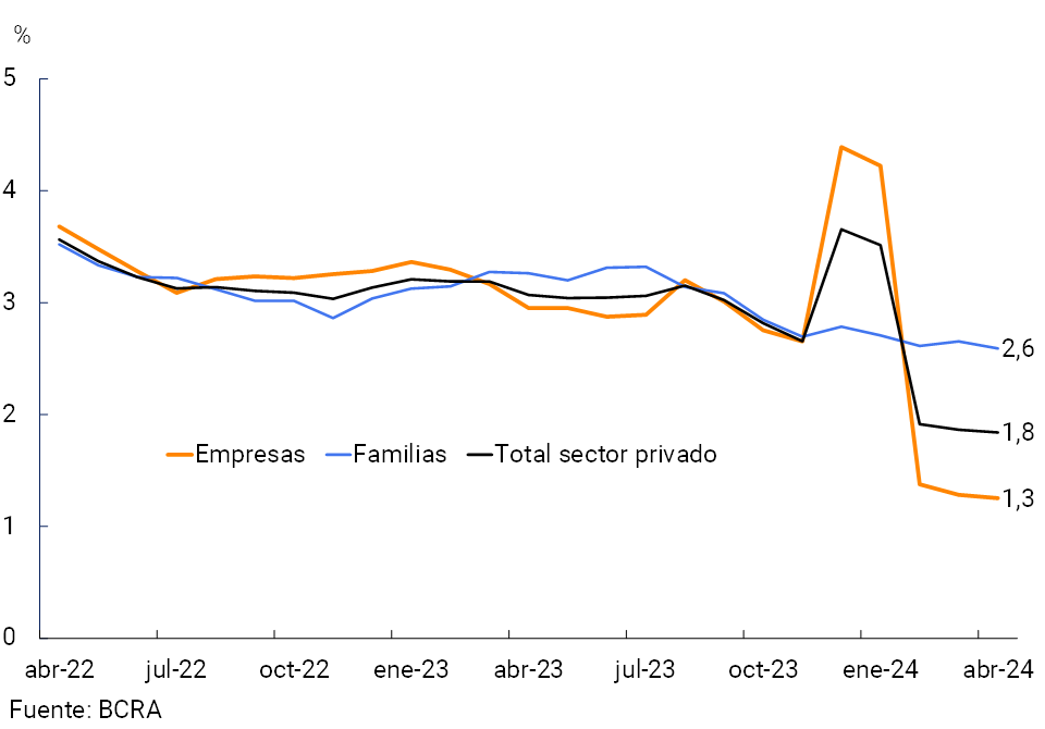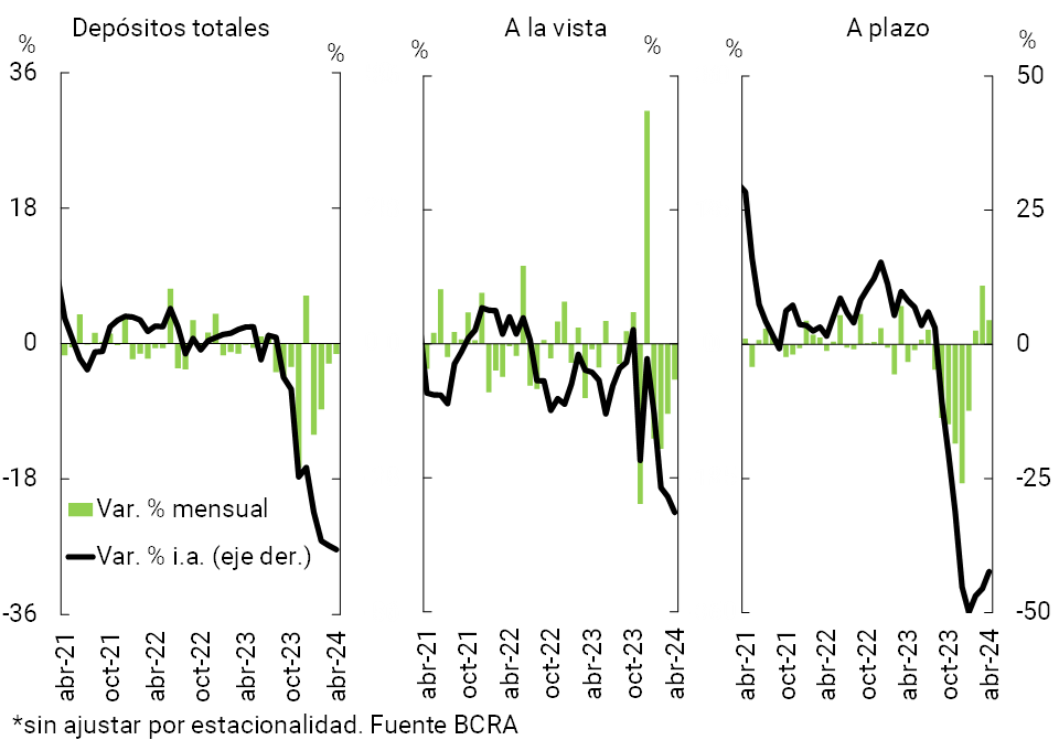 • El saldo de los depósitos en moneda extranjera del sector privado creció 2,3% en el mes (en moneda de origen), acotando la reducción interanual (-12,8%). En abril el saldo real de depósitos del sector privado en moneda nacional se redujo 1,4% (-38% i.a.), desempeño explicado principalmente por las cuentas a la vista (-4,8%), con preponderancia del segmento remunerado. Por su parte, continuado la dinámica de meses previos, el saldo de los depósitos a plazo en pesos creció 3,2% en abril.