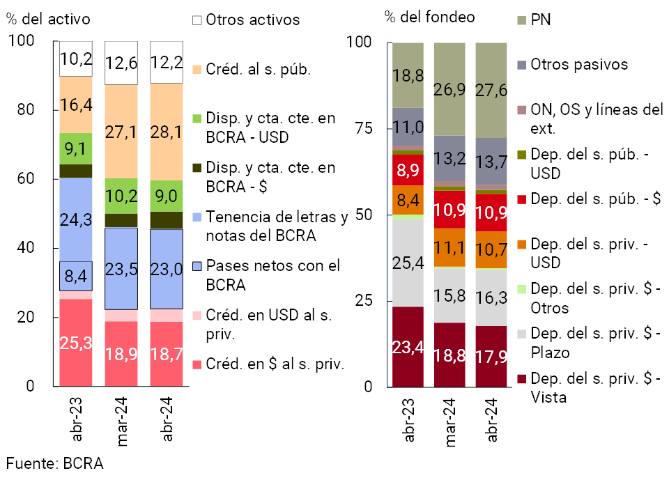 Con respecto a los componentes del activo total del sector, en abril disminuyó el peso relativo de los pases netos con el BCRA y de las disponibilidades y cuentas corrientes en esta Institución en moneda extranjera, en tanto que el financiamiento al sector público no financiero y las disponibilidades y cuentas corrientes en el BCRA en pesos aumentaron su ponderación (ver Gráfico 4). En cuanto a la composición del fondeo total, en el mes las cuentas a la vista en pesos del sector privado y los depósitos en moneda extranjera del mismo sector redujeron su importancia relativa, mientras que el patrimonio neto y las colocaciones a plazo del sector privado en pesos aumentaron su participación en el total4.
