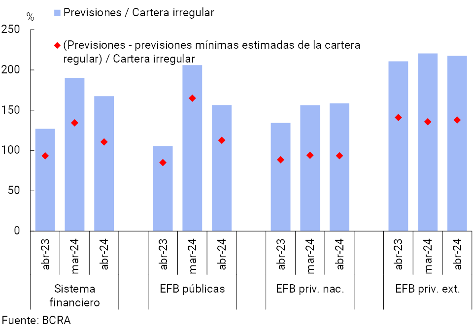 • En abril la calidad de la cartera total de préstamos al sector privado del sistema financiero agregado se mantuvo sin cambios significativos. El ratio de irregularidad del crédito al sector privado se mantuvo en 1,8% (-1,2 p.p. i.a.). El indicador de mora de la cartera crediticia destinada a las familias se situó en 2,6% (-0,7 p.p. i.a.) y en 1,3% para en el segmento de financiamiento a las empresas (-1,7 p.p. i.a.). Las previsiones contables representaron 167,4% de la cartera en situación irregular a nivel agregado en el período.