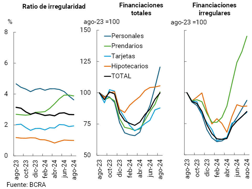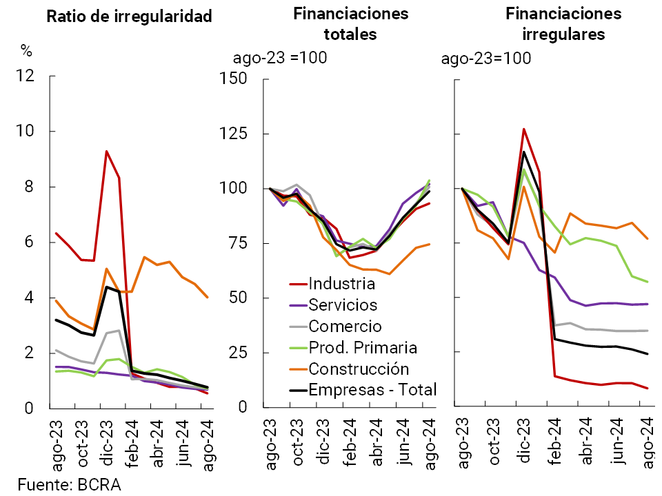 • El ratio de irregularidad del crédito al sector privado se ubicó en 1,6% en agosto, permaneciendo sin cambios de magnitud respecto a julio (-1,5 p.p. i.a.). El ratio de mora de las financiaciones a las empresas alcanzó 0,8% (-2,4 p.p. i.a.), mientras que el correspondiente a los préstamos a las familias se mantuvo en 2,7% (-0,5 p.p. i.a.). El saldo estimado de previsiones atribuibles a la cartera en situación irregular cubrió la totalidad de dicha cartera a nivel agregado (106,1% en agosto).