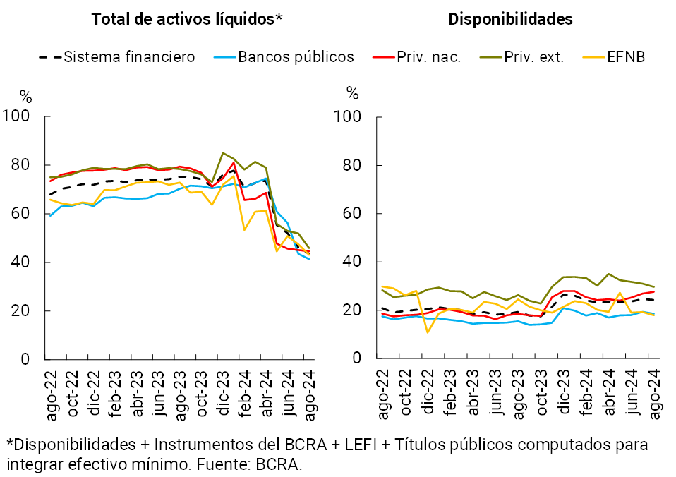 13 Considera disponibilidades (efectivo y cuenta corriente en el BCRA), Letras Fiscales de Liquidez (LEFI), operaciones de pase contra el BCRA (hasta junio de 2024), tenencia de instrumentos del BCRA, y el saldo de las especies de títulos públicos que las entidades computan para integración de Efectivo Mínimo.