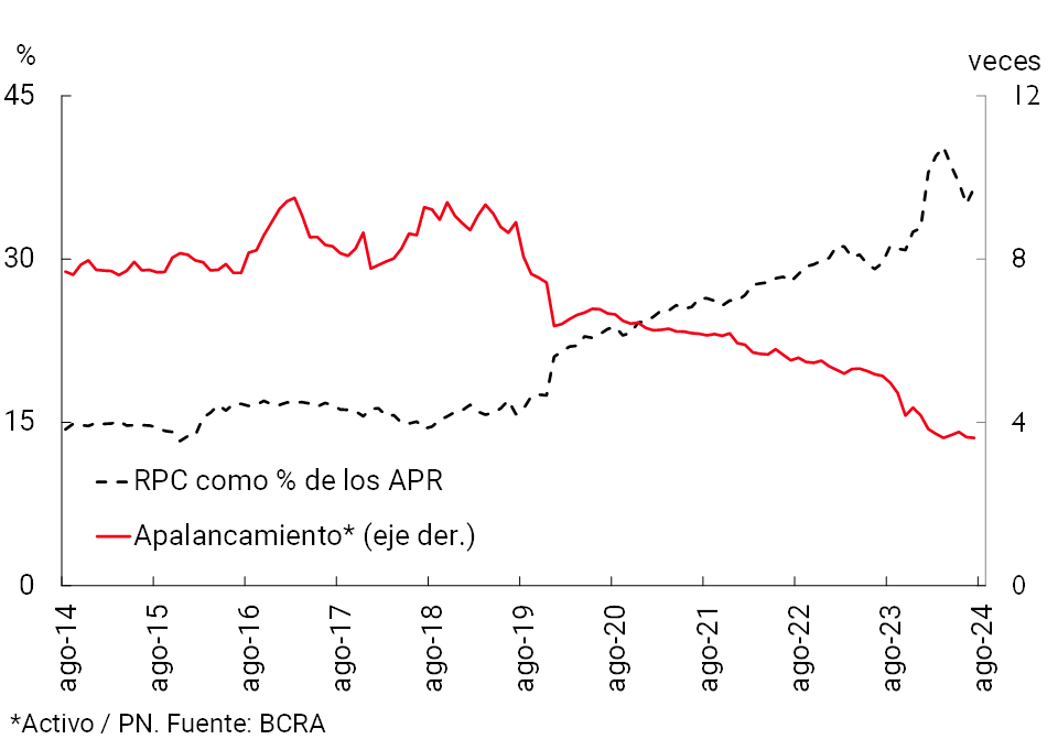 En el mes el sistema financiero mantuvo holgados niveles de solvencia. En agosto la integración de capital (RPC) del conjunto agregado de entidades representó 36,6% de los activos ponderados por riesgo (APR), 1,5 p.p. más que el mes pasado (ver Gráfico 12). Este desempeño recogió el efecto de un incremento mensual de 6,2% real en el capital regulatorio, relativamente superior que la suba mensual de los APR (2% real). El aumento mensual de la RPC respondió mayormente a la incorporación al capital de la totalidad de las ganancias devengadas en los últimos meses15. En este contexto, en agosto el exceso de capital del sistema financiero totalizó 359% de la exigencia regulatoria y 62,8% del saldo de crédito al sector privado neto de previsiones. El apalancamiento del conjunto de entidades no presentó cambios de magnitud en el mes, ubicándose en niveles históricamente bajos: actualmente el activo total del sector representa solamente 3,6 veces el patrimonio neto (1,5 veces menos que un año atrás y prácticamente la mitad del promedio de los últimos 10 años).