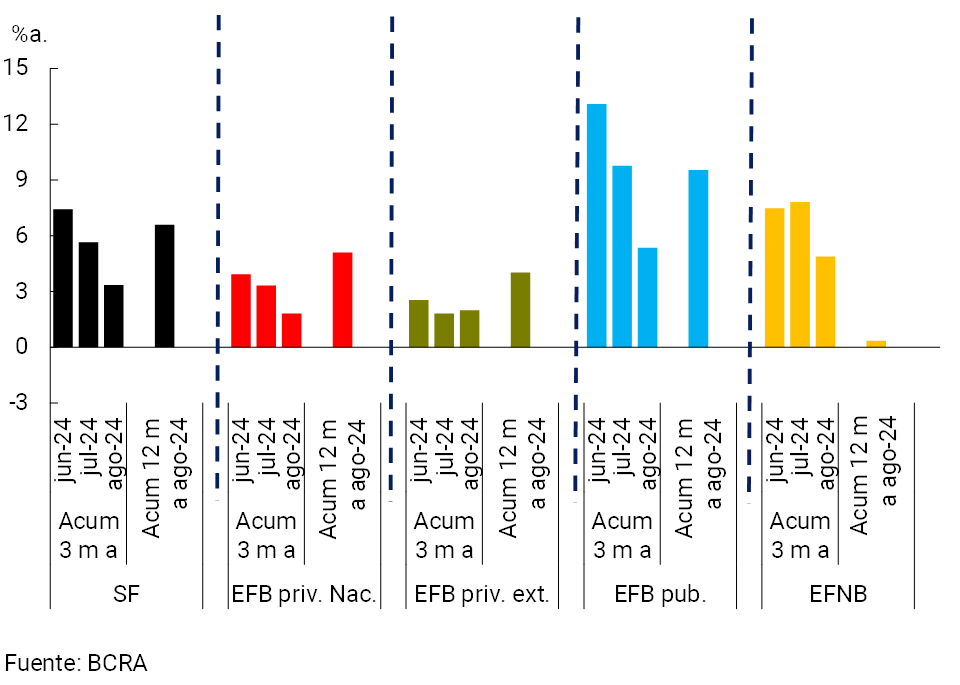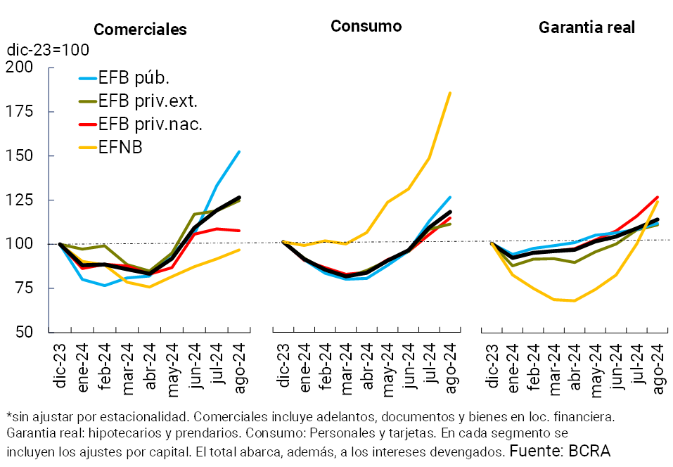 El aumento del saldo real del crédito en pesos al sector privado en los últimos cuatro meses (acumuló 39,3% de crecimiento entre fines de abril y agosto de 2024) resultó generalizado entre los grupos de entidades financieras (ver Gráfico 2). En particular, dentro del segmento de préstamos comerciales, los bancos públicos fueron los más dinámicos en este período. Por su parte, en el segmento de los préstamos al consumo las EFNB mostraron un destacado crecimiento relativo en este lapso, seguido por los bancos públicos.