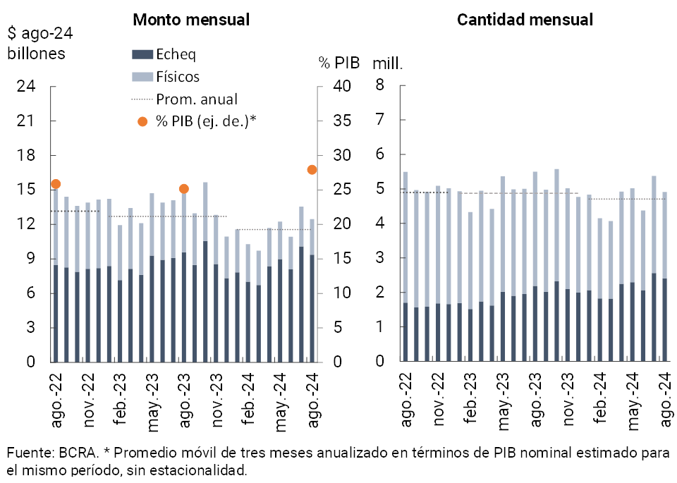 • En agosto los medios de pago electrónico continuaron creciendo. Las transferencias inmediatas (TI) aumentaron 11,7% en cantidad de operaciones (106,9% i.a.) y 9,1% en montos reales (50,2% i.a.). Los ECHEQs siguieron aumentando su participación en el total de documentos compensado, abarcando en agosto 49% de la cantidad y 75% de los montos operados.